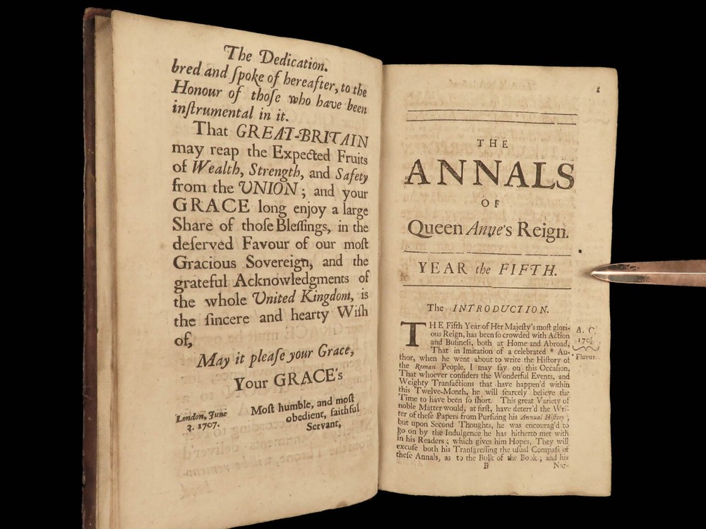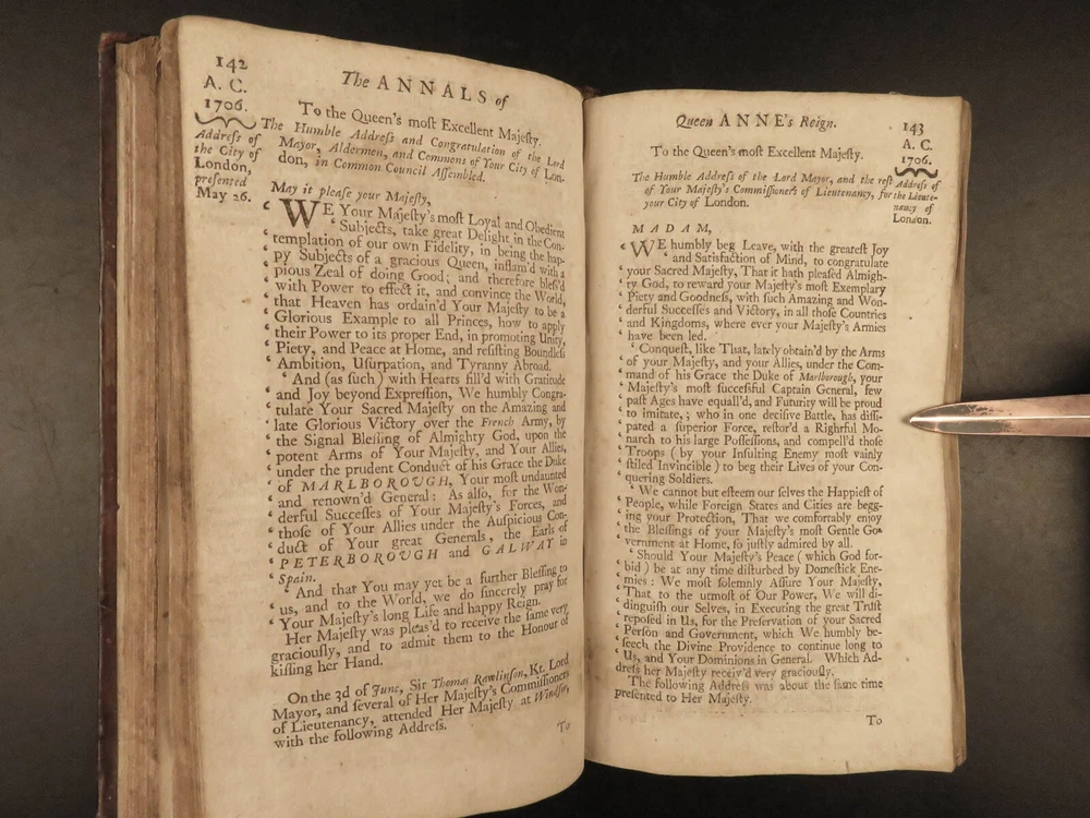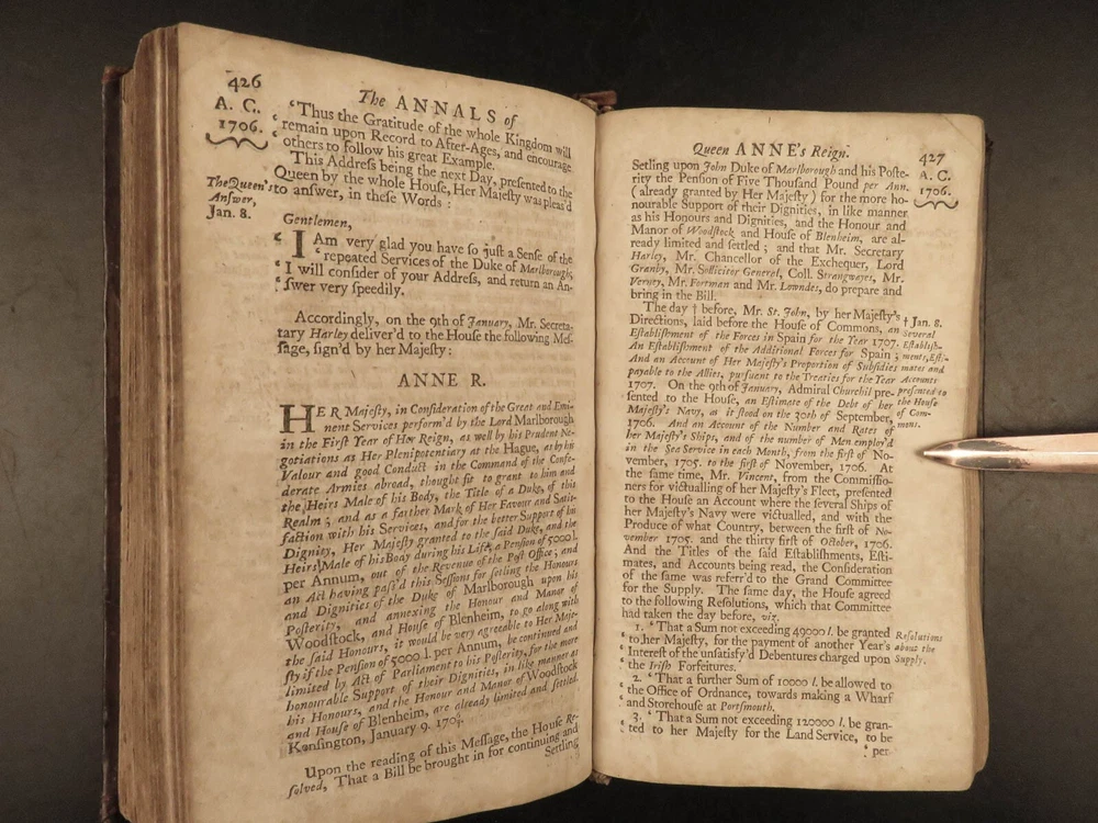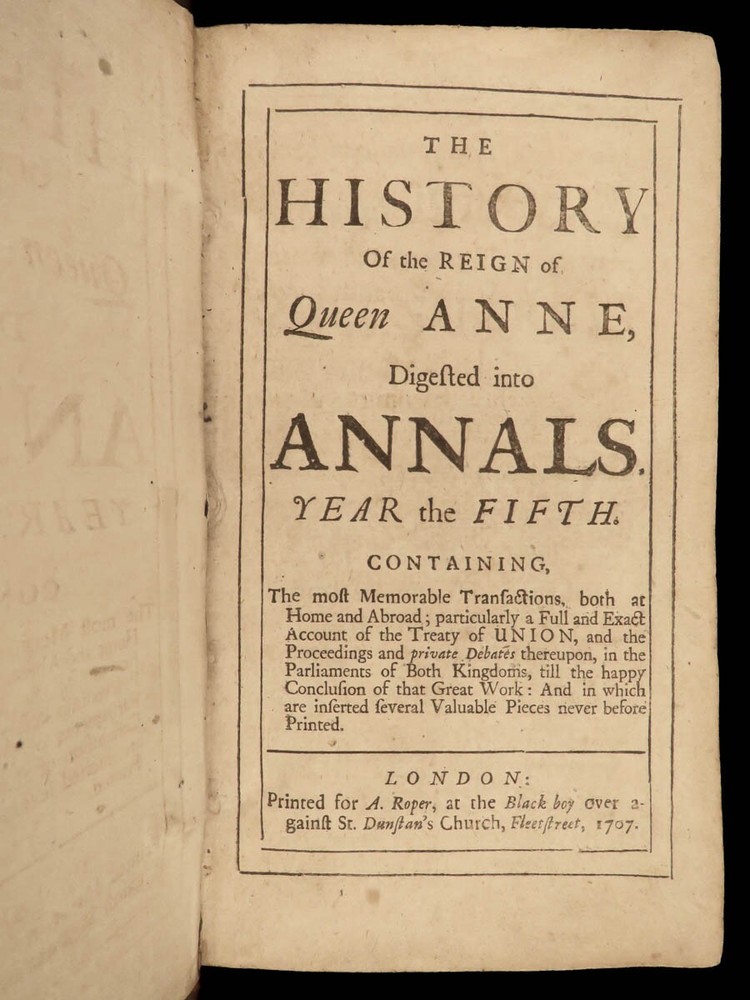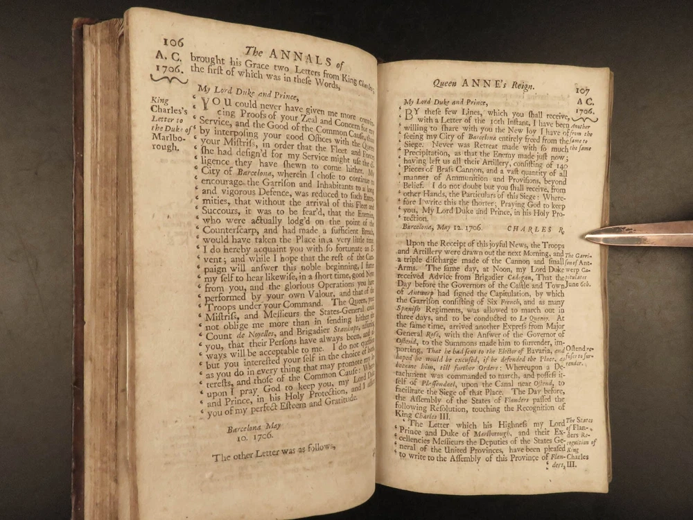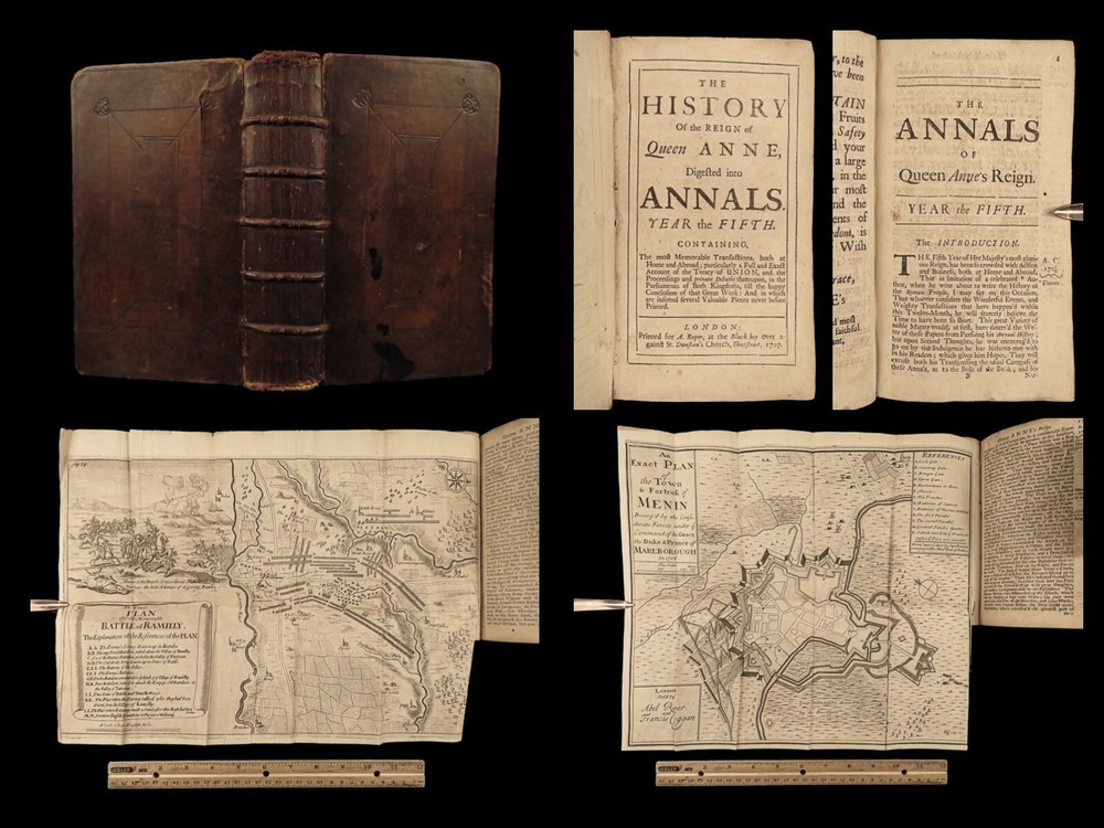 1707 Queen Anne 1 ed Memoirs of England MAPS Abel Boyer Parliament Politics Wars Abel Boyer was a 17 th -century English historian who is regularly remembered for his account of the life and reign of Queen Anne of England. It was in his ‘ History of Queen Anne’ that he describes proceedings in British Parliament, royal speeches, as well as political debates. This 1707 ‘anonymous’ edition is still credited to Boyer; however, according to the ESTC it was edited and collected by an author simply named Gibson. This work is without question one of the best 18 th -century examples of biographies of Queen Anne , especially considering the inclusion of commentary on the political and diplomatic state of England from the Reformation through the fifth year of Anne’s reign, 1707. Item number: #24628 Price: $599 BOYER, Abel The history of the reign of Queen Anne digested into annals. Year the fifth London: Printed for A. Roper, 1707. 1 st edition Details : · Collation: Complete with all pages o [8], 498 (i.e., 488), 201, [15] o 2 folding engravings · Provenance: Handwritten – Fletcher Fleming · Language: English · Binding: Leather; secure · Size : ~7.75in X 4.5in (19.5cm x 11.5cm) Our Guarantee: Very Fast. Very Safe. Free Shipping Worldwide. Customer satisfaction is our priority! Notify us with 7 days of receiving, and we will offer a full refund without reservation! 24628