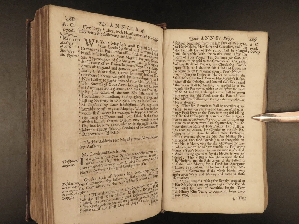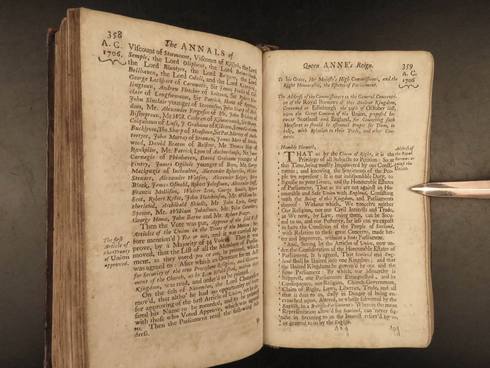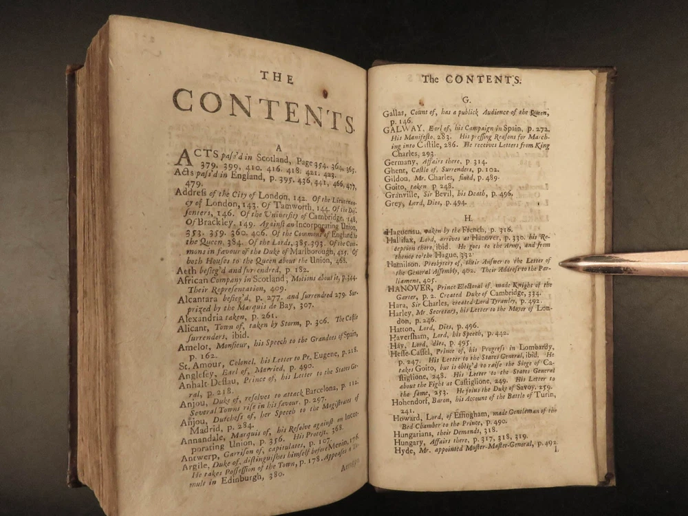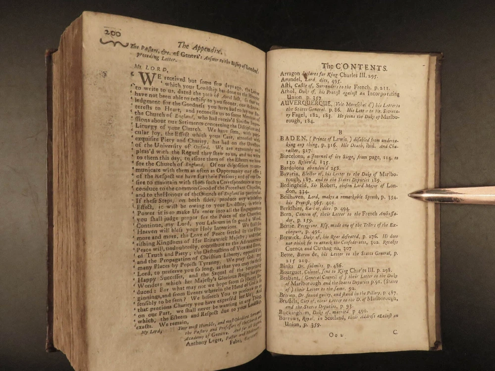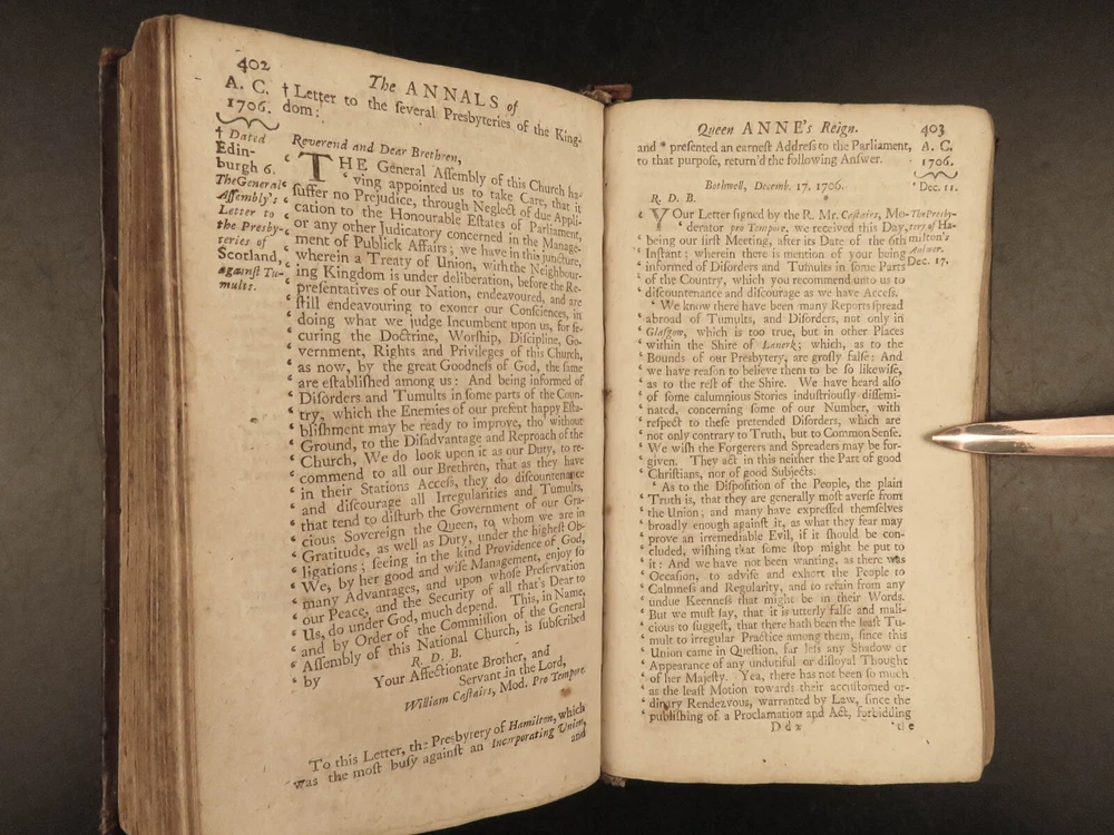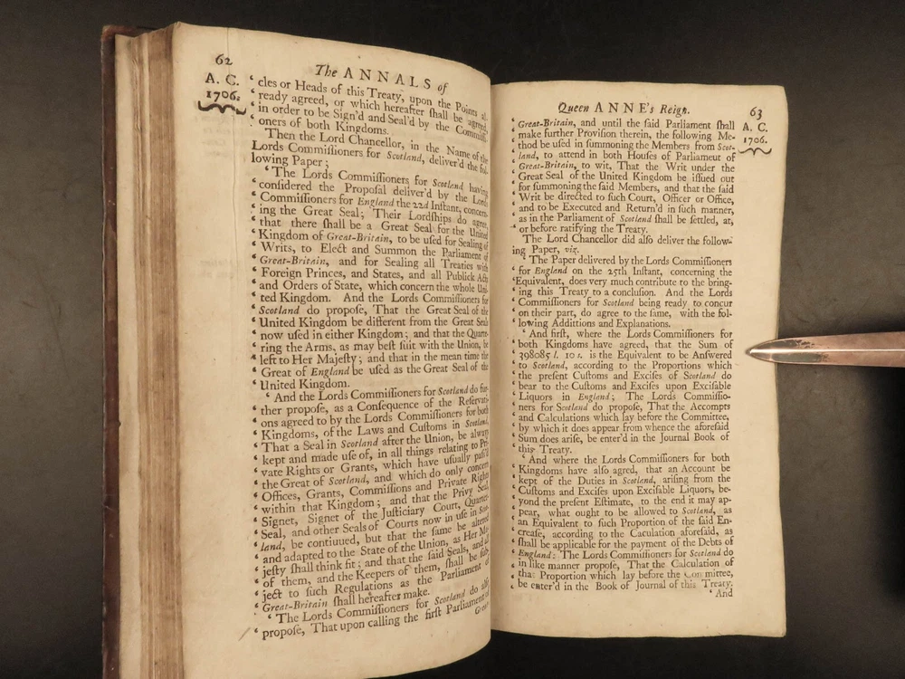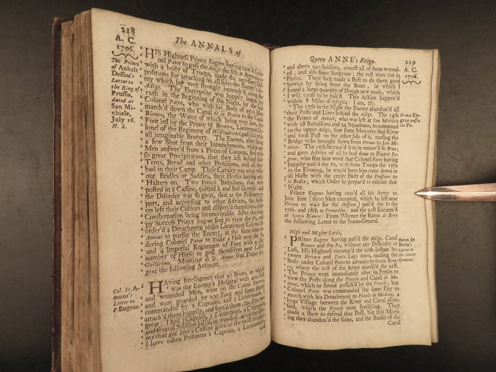 1707 Queen Anne 1 ed Memoirs of England MAPS Abel Boyer Parliament Politics Wars Abel Boyer was a 17 th -century English historian who is regularly remembered for his account of the life and reign of Queen Anne of England. It was in his ‘ History of Queen Anne’ that he describes proceedings in British Parliament, royal speeches, as well as political debates. This 1707 ‘anonymous’ edition is still credited to Boyer; however, according to the ESTC it was edited and collected by an author simply named Gibson. This work is without question one of the best 18 th -century examples of biographies of Queen Anne , especially considering the inclusion of commentary on the political and diplomatic state of England from the Reformation through the fifth year of Anne’s reign, 1707. Item number: #24628 Price: $599 BOYER, Abel The history of the reign of Queen Anne digested into annals. Year the fifth London: Printed for A. Roper, 1707. 1 st edition Details : · Collation: Complete with all pages o [8], 498 (i.e., 488), 201, [15] o 2 folding engravings · Provenance: Handwritten – Fletcher Fleming · Language: English · Binding: Leather; secure · Size : ~7.75in X 4.5in (19.5cm x 11.5cm) Our Guarantee: Very Fast. Very Safe. Free Shipping Worldwide. Customer satisfaction is our priority! Notify us with 7 days of receiving, and we will offer a full refund without reservation! 24628
