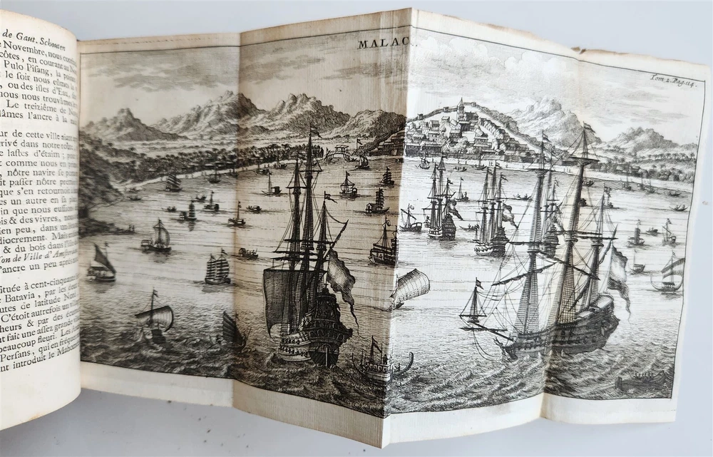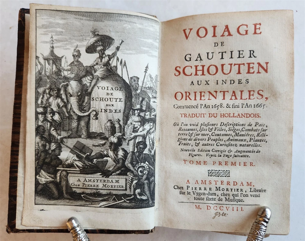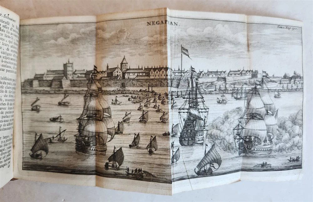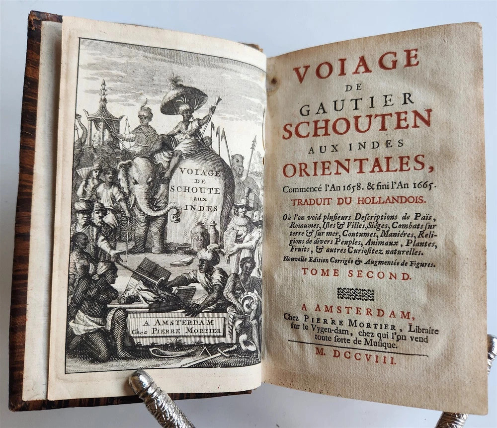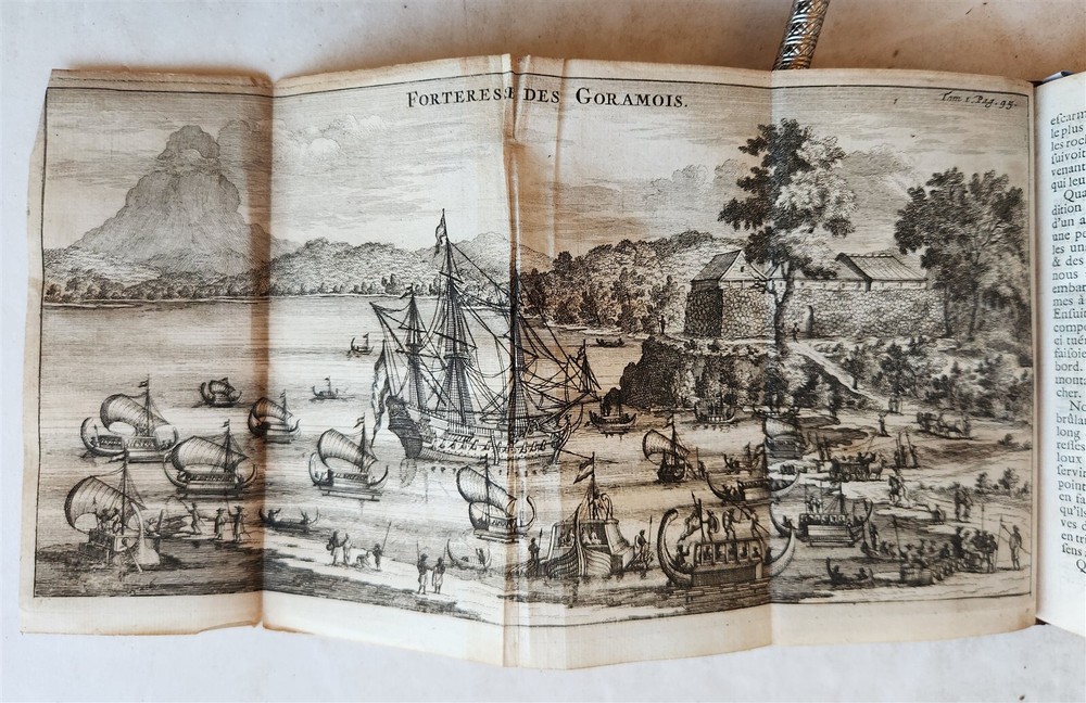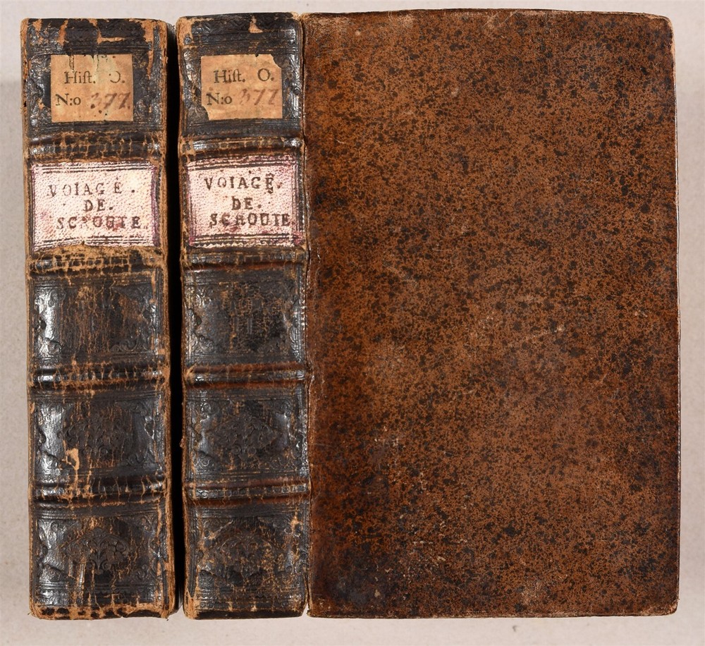Voiage aux Indes orientales, commence l'an1658. & fini l'an 1665 [...]. by SCHOUTEN, Wouter Amsterdam; 1708 2 volumes Size 4 by 6 1/4" frontispiece-[4]-portrait-508-[7], frontispiece-[1]-492 pp. French translation of the voyage of the Dutch surgeon Schouten (1638-1704) with the fleet of the Dutch East India Company. Illustrated with 2 frontispieces, an engraved portrait and 10 mostly folding plates showing the fleet, harbors, fauna and flora. Titles in red & black - Ref. Chadenat 1737. - STCN. Original calf, blind-stamped spines with raised bands. Very good condition, minor wear Text in French ============================== "Voyage aux Indes Orientales" translates to "Voyage to the East Indies" in English, and refers to a famous book written by French naturalist Pierre Sonnerat detailing his travels and observations in Southeast Asia, particularly India and China, during the late 18th century; it is considered a valuable source of information about the region's culture, customs, and natural history at that time. Schouten (1638 – 1704) was a Dutch sailor, surgeon and explorer who sailed for the Dutch East India Company. The present work is an extensive account of his experiences during his time serving for the VOC in Batavia, Ceylon, the Moluccas islands and other parts of South East Asia, published first in Dutch –also in German-, in 1676, from which this French translation was prepared. ========================================== =========================== Please see my other auctions Thank You Refund Policy: We will issue a FULL REFUND, 100% money back if you are not satisfied with your purchase. Items must be returned to us within 20 days in order to receive a refund or replacement. Buyer is responsible for shipping costs. Powered by SixBit's eCommerce Solution