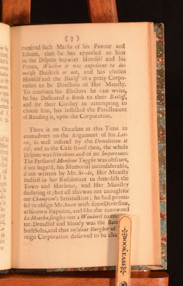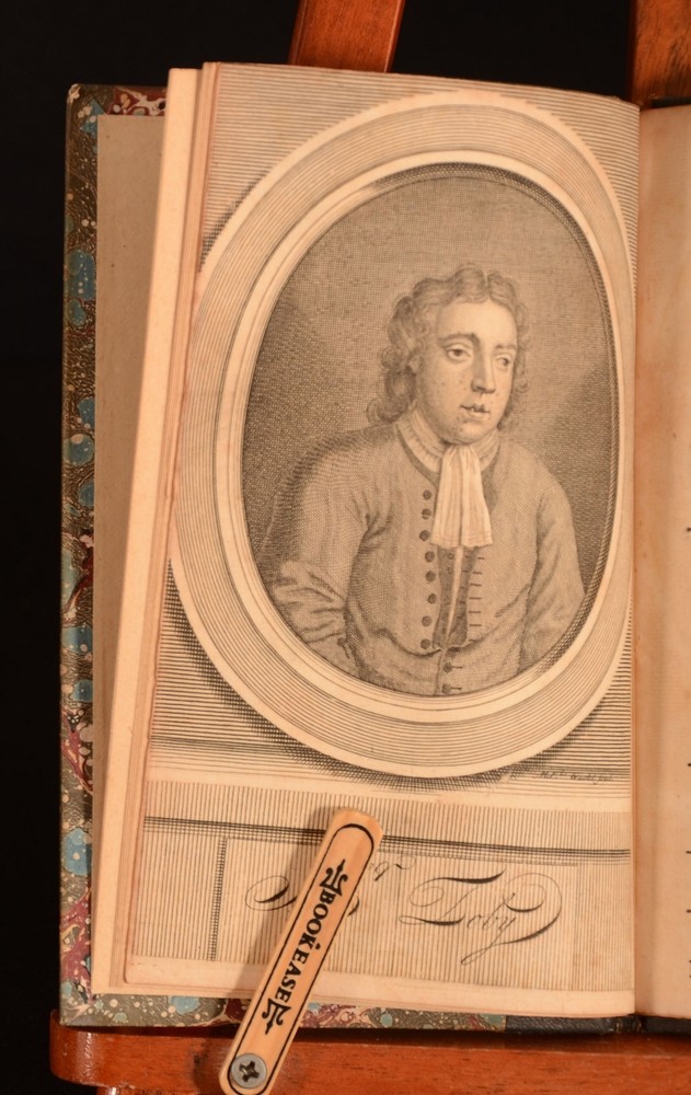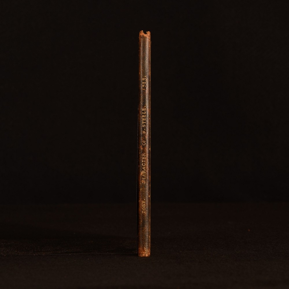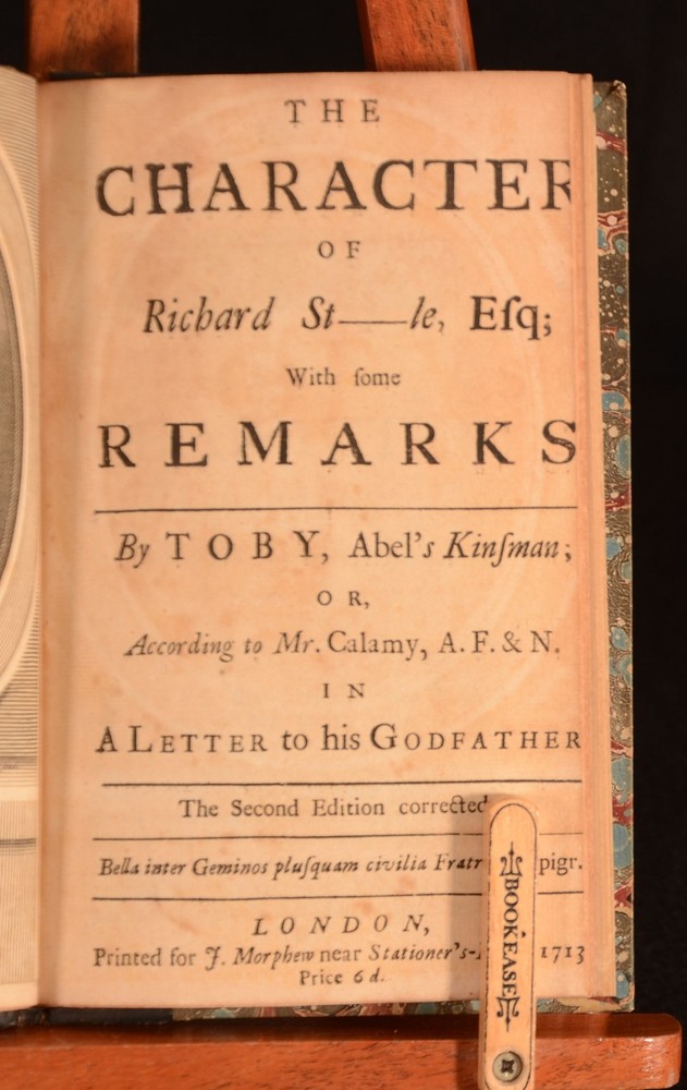 Click here to see our other books! The Character of Richard St-le Esq; With some Remarks By Toby, Abel's Kinsman; or, According to Mr. Calamy, A.F. & N. In A Letter to his Godfather. The Second Edition Corrected. William Wagstaffe 'Toby' 1713 J Morphew : London 7.5" by 4.5" 32pp [14] SUMMARY The second edition of this attack on Richard Steele by the seventeenth century physician and satirist, William Wagstaffe, written under his pseudonym, 'Toby'. In a lovely quarter morocco binding. Leather Binding,Signed Binding Overall Condition: Very Good This book weighs 0.5 KG when packed UK Postage: £ 3.99 US Postage: £ 15.99 EU Postage : £ 13.99 European Postage: £ 14.99 Asia Postage: £ 18.99 Worldwide Postage: £ 19.99 DESCRIPTION A character analysis and attack of the politician Richard Steele. Written under the pseudonym 'Toby', the work was in fact by the British physcian, William Wagstaffe. With a portrait frontispiece of Wagstaffe, captioned 'Mr Toby'. Wagstaffe notes that 'Mr Steele, in short, has neither an head, nor a style for politicks; there is no one political englishman but contains either some notorious blunder in his notions or his language; and he seems himself so well aware of this, that he is already run from his purpose..... If I might advise him,I should think it his best way to retire into Wales, and live upon his estate'. The Oxford DNB states that 'Wagstaffe had no personal enmity against Steele, whom he did not know by sight.' Therefore, this attack is aimed solely at the public figure of Steele, and his politics. Richard Steele was a member of the Whig party, as well as a writer and playwright. Born in Dublin, Ireland, Steele is also remembered as the co-founder of 'The Tatler' magazine. Previously part of the library of Robert A S Macfie, with his bookplate to the front pastedown, and ink inscription to the recto of front endpaper. Robert A S Macfie was a Scottish business man and a member of British parliament. A liberal MP he took a keen interest in Postal Reform. In a binding by Stoakley Late Hawes, with binder's stamp to the verso of front endpaper. CONDITION In a quarter morocco binding, with marbled boards. Externally smart. Rubbing to the head and tail of the spine, joints and extremities. Bookplate to the front pastedown, Robert A S Macfie. Ink inscription to the front endpaper, which has offset to the front pastedown. Offsetting to the front endpaper to the head and to the tail. Offsetting to the rear endpaper, to the head and to the tail. Rear pastedown has evidence of sticker removal. Pages are age toned to edges. Offsetting to the titlepage, caused by the illustrated fronitspiece. Crease to page V. The odd spot throughout. Overall Condition: Very Good GLOSSARY OF TERMS Overall Condition (Dustwrapper condition rating is shown after that for the book itself, where a dustwrapper is present) Fine - Very well preserved copy showing very little wear Very Good Indeed - Only one or two minor faults, really a very attractive copy Very Good - Quite a wide term meaning no major faults but probably several smaller ones often expected given the age of the book, but still a respectable copy Good - Meaning not very good. Some more serious faults as will be described in the condition report under 'condition' Good Only - Meaning one or more faults that could really do with repair Fair - As with good only above but with other faults leaving a compromised copy even after repair Poor - Really bad and possibly seriously incomplete. We only sell books in this condition where their rarity or value makes them attractive none the less. Major defects will be described. GUARANTEE We offer a full money back guarantee on our descriptions. Please ask for details and conditions. We prefer PAYPAL. If you pay via PAYPAL we will post the item off the same or the next working day with the postage you have selected. Please note we cannot accept USD cheques