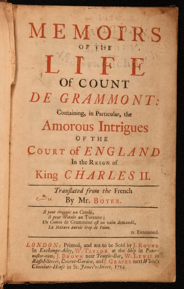 Click here to see our other books! Memoirs of the Life of Count de Grammont [Anthony Hamilton] 1714 J. Round; W. Taylor; J. Brown; W. Lewis; J. Graves : London 7.5" by 5" [4], 356pp SUMMARY The first edition in English of this scarce memoir on the life of Count Philibert de Gramont, and the courts of Charles II and Louis XIV. First Edition,Leather Binding,Scarce Overall Condition: Good This book weighs 0.5 KG when packed UK Postage: £ 3.99 US Postage: £ 15.99 EU Postage : £ 13.99 European Postage: £ 14.99 Asia Postage: £ 18.99 Worldwide Postage: £ 19.99 DESCRIPTION The first edition in English of this scarce work. The memoirs of Philibert de Gramont, a French courtier and soldier of the seventeenth century, written by his brother-in-law, Antoine Hamilton. Philibert was the younger half-brother of Antoine III of Gramont. He was exiled from Louis XIV's court in 1662 for courting one of his mistresses, Anne-Lucie de la Mothe-Houdancourt. Upon this exile, Philibert found home at the court of Charles II in England, though he was allowed to return to France after a couple of years. When Philibert was 80, he supplied his brother-in-law, Antoine, with the material for these 'Memoirs'. Hamilton provided interesting passages in this volume on the history of the court of Charles II. Antoine Hamilton, also known as Anthony, was a soldier who fought in the Franco-Dutch War. Philibert married his sister, Elizabeth, who was known as one of the Windsor Beauties painted by Sir Peter Lely. With woodcut headpieces and decorative initials. Collated, complete. Bookplate and ink inscription of Thomas Carill Worsley to the front paste down. Worsley was a businessman, with interests in lead mining, who lived at Platt Hall, Manchester. CONDITION In a rebacked calf binding. Externally, generally smart, with light rubbing to the boards and spine. Minor bumping to the extremities and to the head and tail of the spine. A little discolouration to the boards. Chip to the tail of the rear joint. A couple of small dampstains to the rear board and to the spine. Loss to the extremities. Head of the spine is lifting a little to the front joint. Front hinge is starting but firm. Bookplate and ink inscription to the front paste down. Tape repair to the rear hinge. Front endpaper is working loose. Internally, firmly bound. Pages are lightly age-toned and generally clean with scattered spots. Overall Condition: Good GLOSSARY OF TERMS Overall Condition (Dustwrapper condition rating is shown after that for the book itself, where a dustwrapper is present) Fine - Very well preserved copy showing very little wear Very Good Indeed - Only one or two minor faults, really a very attractive copy Very Good - Quite a wide term meaning no major faults but probably several smaller ones often expected given the age of the book, but still a respectable copy Good - Meaning not very good. Some more serious faults as will be described in the condition report under 'condition' Good Only - Meaning one or more faults that could really do with repair Fair - As with good only above but with other faults leaving a compromised copy even after repair Poor - Really bad and possibly seriously incomplete. We only sell books in this condition where their rarity or value makes them attractive none the less. Major defects will be described. GUARANTEE We offer a full money back guarantee on our descriptions. Please ask for details and conditions. We prefer PAYPAL. If you pay via PAYPAL we will post the item off the same or the next working day with the postage you have selected. Please note we cannot accept USD cheques