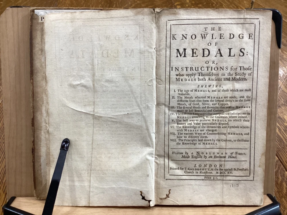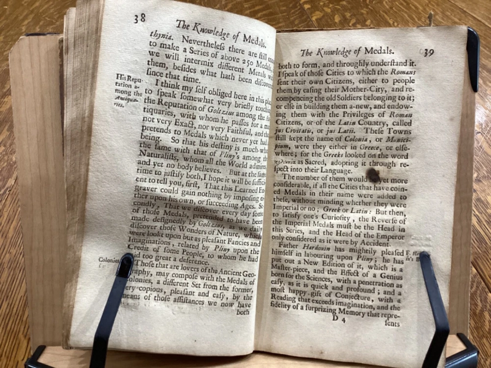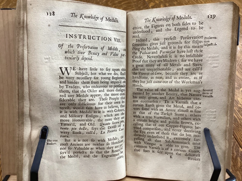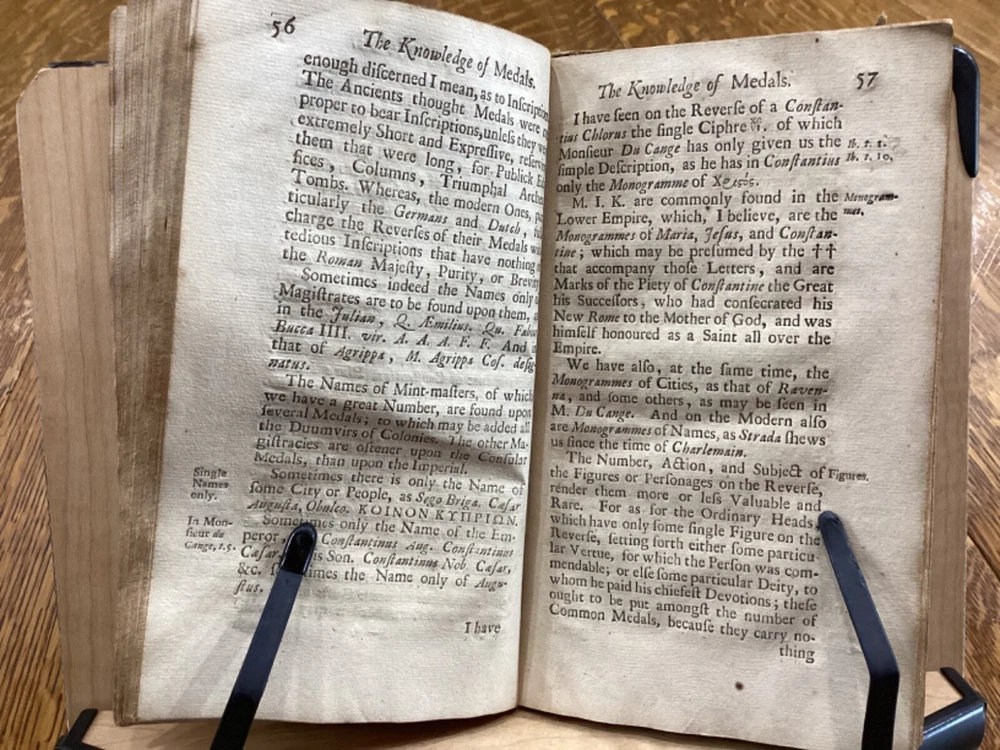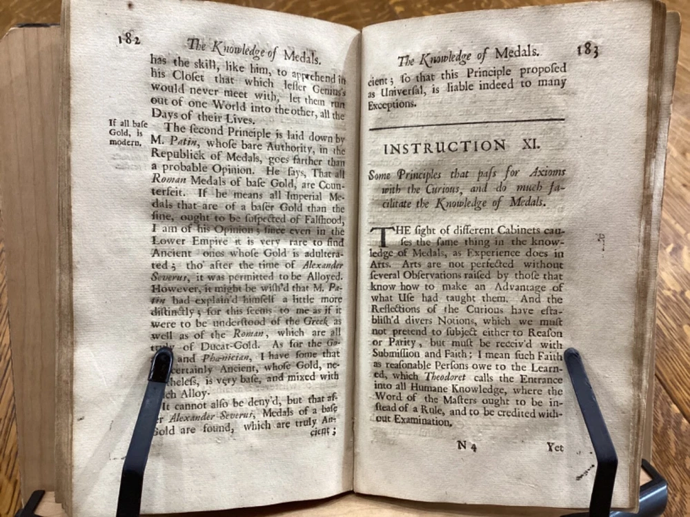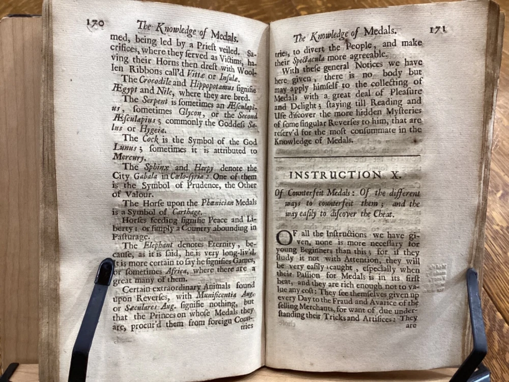 The Knowledge of Medals: of, Instructions for Those who apply Themselves to the Study of Medals both Ancient and Modern, Written by a Nobleman of France (Louis Jobert), Made English by an Eminent Hand (Roger Gale), Essay by Joseph Addison, T.Caldecott, London, 1715, 215pp, leather, 4.5 x 8”, 12mo Poor condition/as is. Contemporary boards. Boards are completely detached from binding. Wear and chipping to boards. Tips are bumped with exposed boards; edges are scuffed. Significant chipping and cracking to spine; binding exposed at head cap and tail. Marginalia on front pastedown and endpapers. Worming near bottom fore edge and gutter of front endpaper to last page of table of instructions. Toning, age-staining, tea-staining, and ink-staining throughout textblock. Small illustrations scattered throughout textblock. Please see photos and ask any questions prior to purchase. Second edition in English of Louis Jobert’s treatise on medals including the metals of which they are made, descriptions of heads and reverses, inscriptions, preservation, ornamentation, and symbolism, counterfeits, and more. Addison’s essay concerns the error in distributing modern medals. FORN-TUB-0053-XX-2407-JC1097