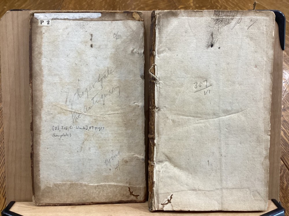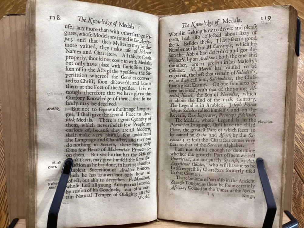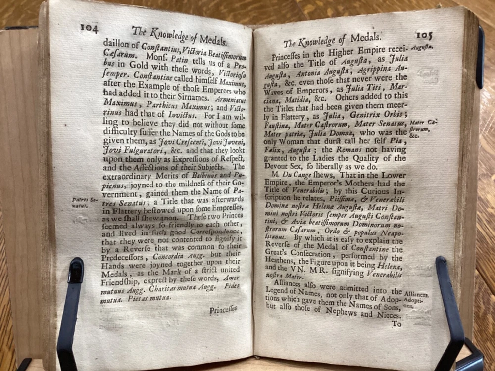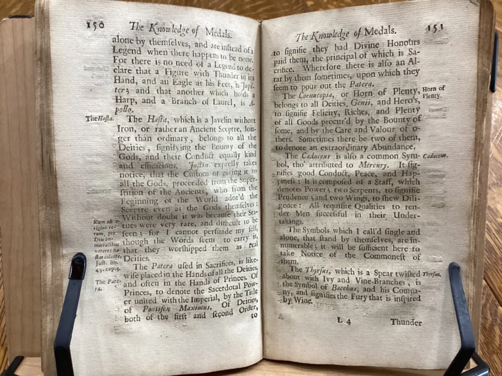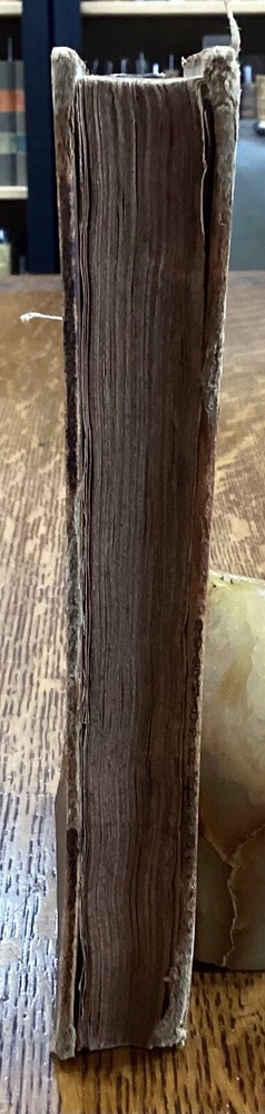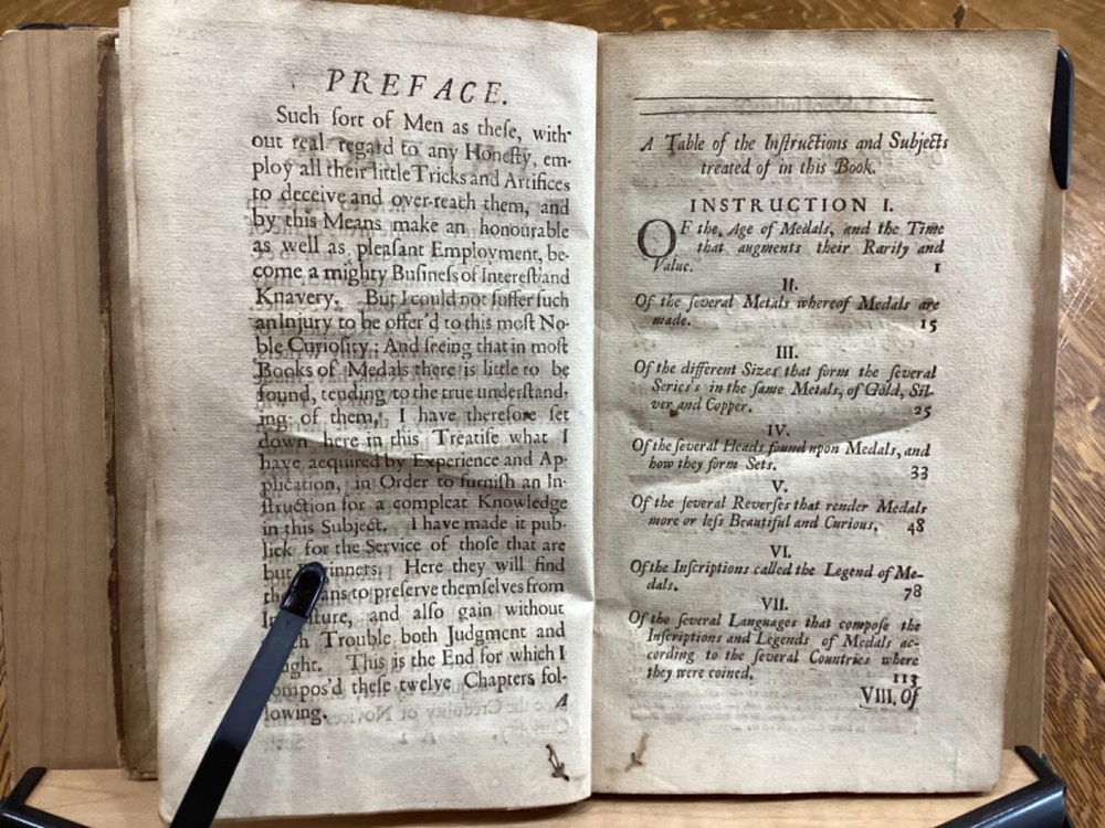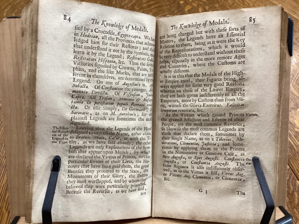 The Knowledge of Medals: of, Instructions for Those who apply Themselves to the Study of Medals both Ancient and Modern, Written by a Nobleman of France (Louis Jobert), Made English by an Eminent Hand (Roger Gale), Essay by Joseph Addison, T.Caldecott, London, 1715, 215pp, leather, 4.5 x 8”, 12mo Poor condition/as is. Contemporary boards. Boards are completely detached from binding. Wear and chipping to boards. Tips are bumped with exposed boards; edges are scuffed. Significant chipping and cracking to spine; binding exposed at head cap and tail. Marginalia on front pastedown and endpapers. Worming near bottom fore edge and gutter of front endpaper to last page of table of instructions. Toning, age-staining, tea-staining, and ink-staining throughout textblock. Small illustrations scattered throughout textblock. Please see photos and ask any questions prior to purchase. Second edition in English of Louis Jobert’s treatise on medals including the metals of which they are made, descriptions of heads and reverses, inscriptions, preservation, ornamentation, and symbolism, counterfeits, and more. Addison’s essay concerns the error in distributing modern medals. FORN-TUB-0053-XX-2407-JC1097