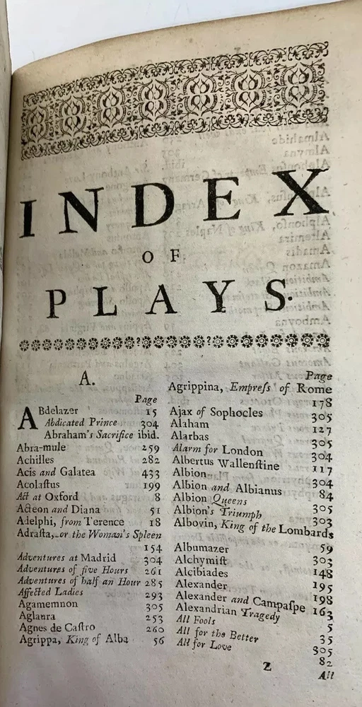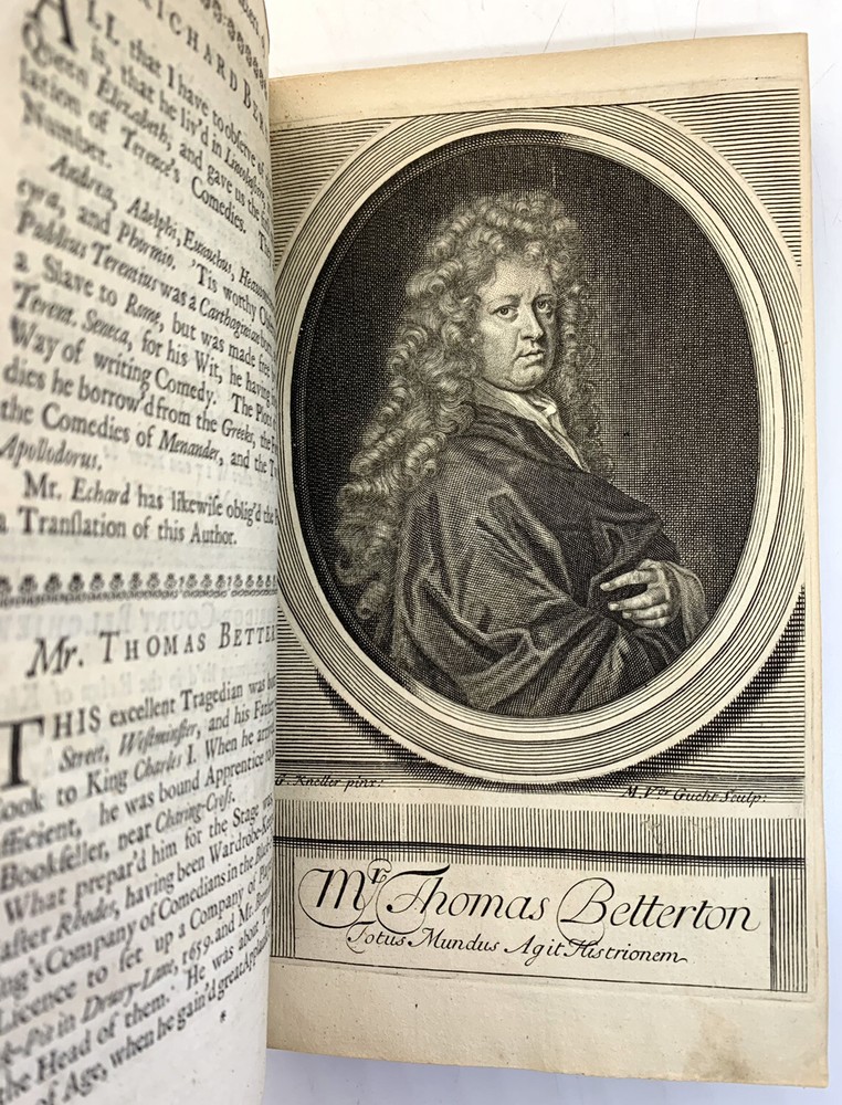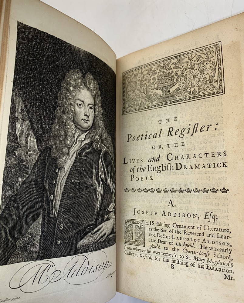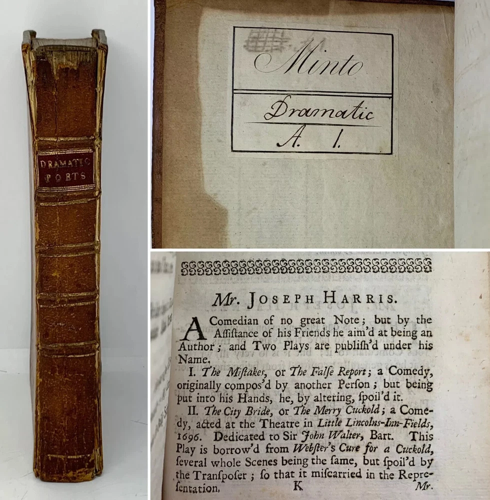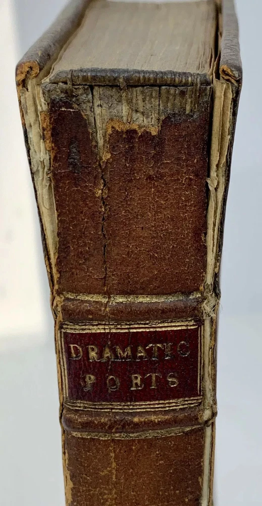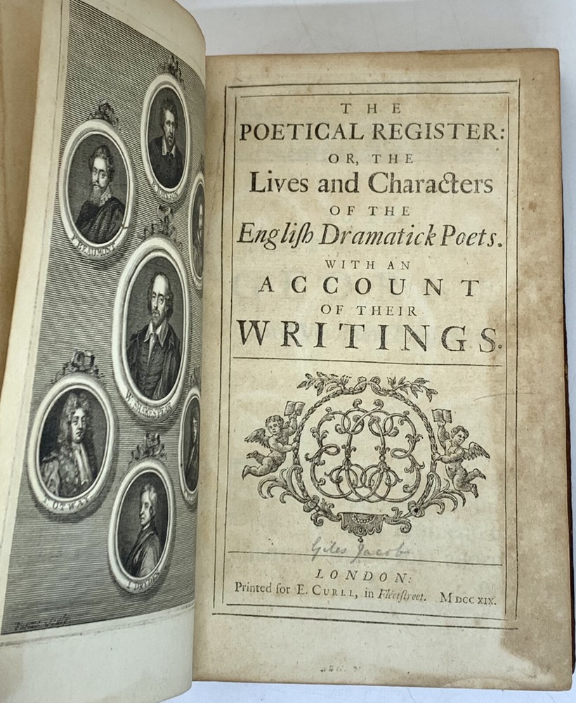 Uncommon in the market the 1719 The Poetical Register or Lives and Characters of the English Dramatic Poets [Jacob Giles] London: E. Curll Engraved frontispiece; 5 engraved portraits (men) Contemporary polished calf backed boards Giles Jacob (1686 – 1744) was a British legal writer whose works include a well-received law dictionary that became the most popular and widespread law dictionary in the newly independent United States. Includes just a few female poets as Lady Elizabeth Carew, Mrs Susanna Cent Livre, Mrs DeLa Rivier Manley, Margaret Duchess Newcastle, Mrs Catherine Phillips, Mary Countess of Pembroke, and Mrs. Mary Pix. But no portraits of these women. Condition and notes Joints split; threatening to detach and very tender Moderate external wear with some soiling, scratches Spine as pictured is chipped, rubbed and cracked 433 Pages plus index Would benefit from having boards reinforced Label pasted down as pictured inside front cover of Minto Age toned paper Rubbed Corners bumped No writing in text block No torn pages Splitting of material at spine tip Paper spine label in gilt The covers are very delicate Browning of edges Light scattered foxing A previous owner wrote the name of Jacob Giles in pencil on the title page as shown Plates bound in with edges appearing a page excised however this is not the case; it’s the edges not trimmed Measures about 4 3/4”by 8” by 1 1/2” thick Even with careful packing the boards may come off so book will be insured. Interior overall good condition for 300 years old Additional photos on request