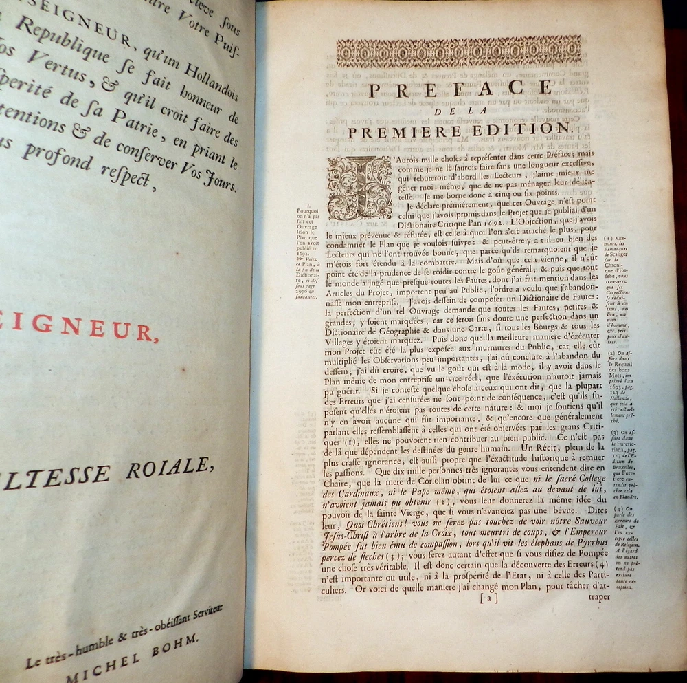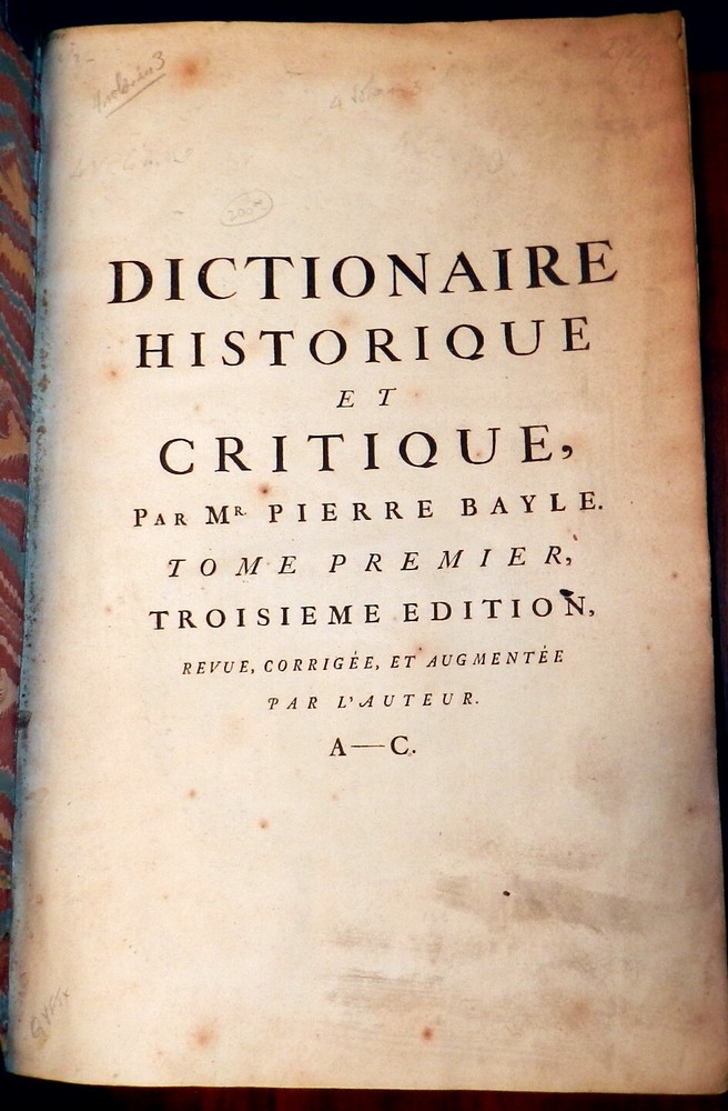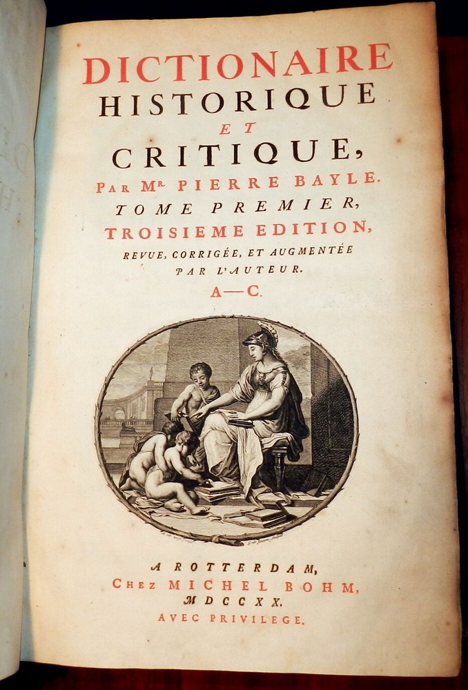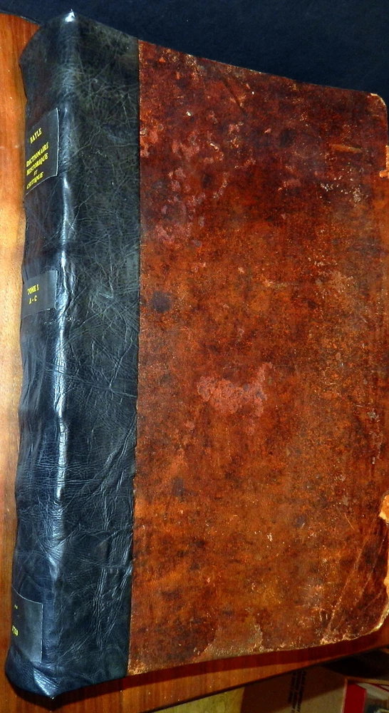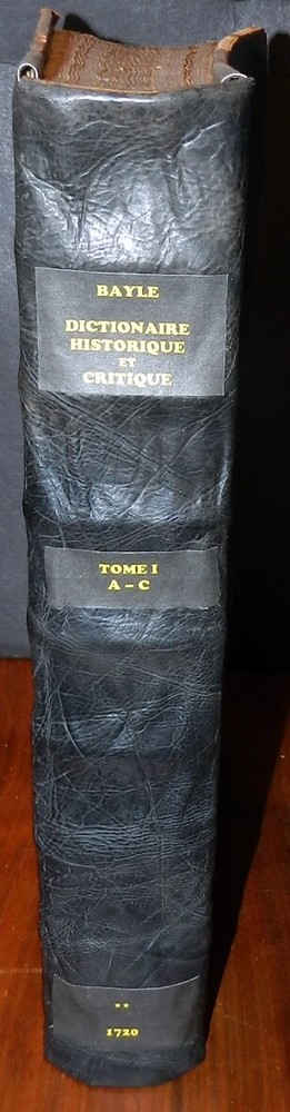 1720 Dictionaire Historique et Critique, Pierre Bayle. Early Encyclopedia 1720 Dictionaire Historique et Critique, Pierre Bayle. Early Encyclopedia Dictionaire Historique et Critique by Pierre Bayle Troisieme edition, Revue, corrigée, Et augmentée Par L'Auteur TOME I A - C Rotterdam, Chez Michel Bohm, 1720. 3rd edition. Hardcover. Full leather, original leather covered boards with later leather spine and spine label. Small thick folio (16 x 10.5 inches), marbled pastedowns half-title, title page, XX, 942 pages. In French. With an illustrated title page and vignette on the first page of the preface. The first volume of the four volume work. A historical and critical dictionary often noted as a forerunner of the Encyclopedists. It was published in Holland, the country to which the author Bayle had escaped to avoid perescution for his protestant faith. Pierre Bayle (French: [bɛl]; 18 November 1647 – 28 December 1706) was a French philosopher, author, and lexicographer. He is best known for his Historical and Critical Dictionary, whose publication began in 1697. A Huguenot, Bayle fled to the Dutch Republic in 1681 because of religious persecution in France. Bayle was a notable advocate of religious toleration and his work had a significant influence on the subsequent growth and development of the European Age of Enlightenment. He is regarded as a forerunner of the Encyclopédistes. The massive Dictionnaire Historique et Critique (Historical and Critical Dictionary), effectively constituted one of the first encyclopaedias (before the term had come into wide circulation) of ideas and their originators. In the Dictionary, Bayle expressed his view that much that was considered to be "truth" was actually just opinion, and that gullibility and stubbornness were prevalent. The Dictionary would remain an important scholarly work for several generations after its publication. Pierre Bayle was a Huguenot, i.e., a French Protestant, who spent almost the whole of his productive life as a refugee in Holland. His life was devoted entirely to scholarship, and his erudition was second to none in his, or perhaps any, period. Although much of what he wrote was embedded in technical religious issues, for a century he was one the most widely read philosophers. In particular, his Dictionnaire historique et critique was among the most popular works of the eighteenth century. The content of this huge and strange, yet fascinating work is difficult to describe: history, literary criticism, theology, obscenity, in addition to philosophical treatments of toleration, the problem of evil, epistemological questions, and much more. His influence on the Enlightenment was, whether intended or not, largely subversive. Said Voltaire: “the greatest master of the art of reasoning that ever wrote, Bayle, great and wise, all systems overthrows.” CONDITION: Good Covers / Near Fine Contents. (The boards have worn edges and corners, superficial chips, rubbing, and soil. The replaced spine is in excellent shape. The front blank endpapers are missing. The half title and title pages have light spotting, some darkening and discoloration. The text pages are complete, clean and intact.) Check our other auctions and store listings for additional unusual items Check our other auctions and store listings for additional unusual items Listing and template services provided by inkFrog