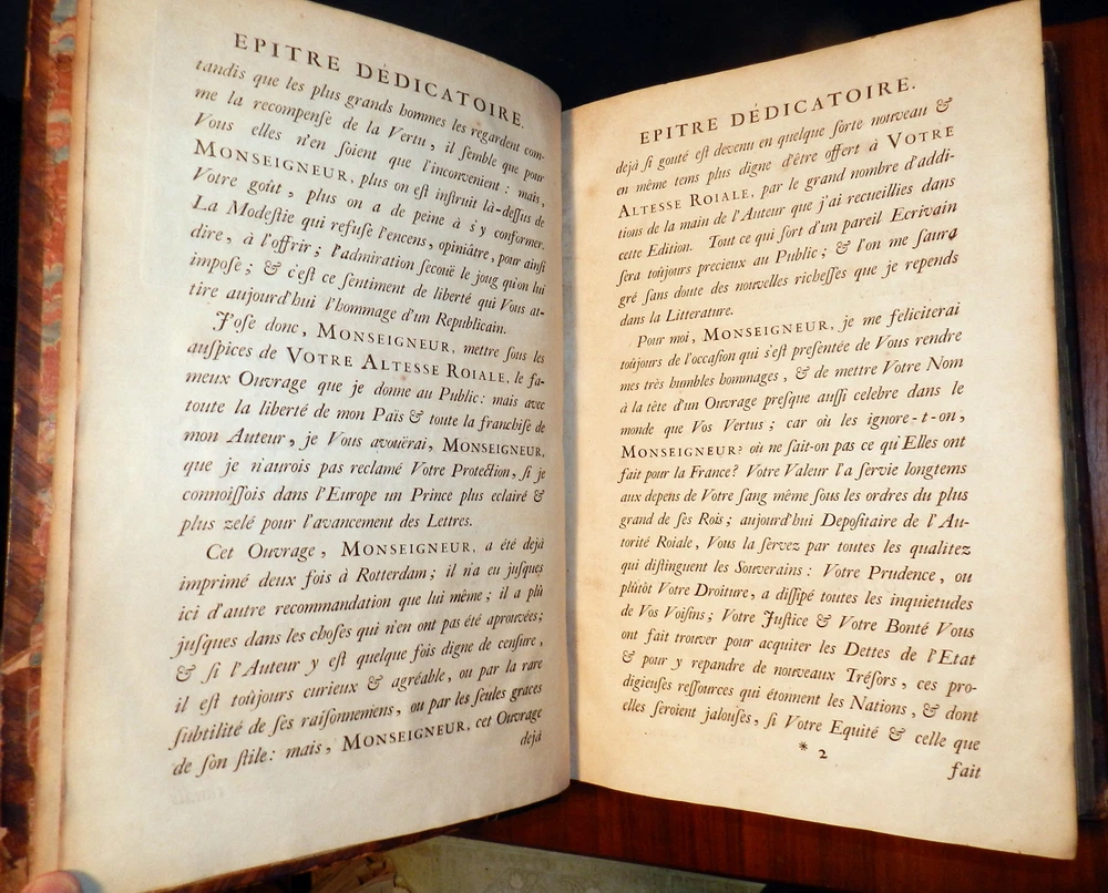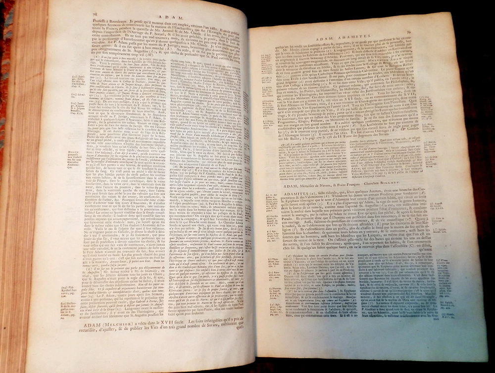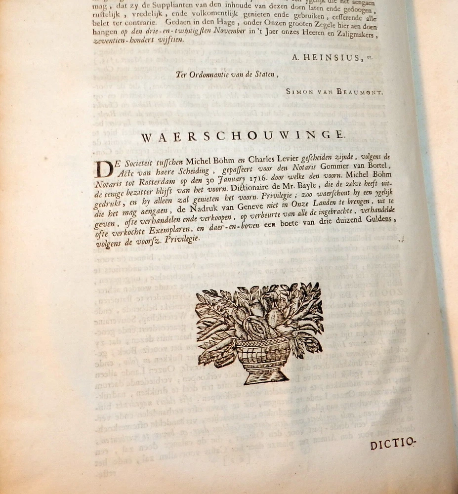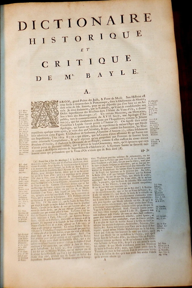 1720 Dictionaire Historique et Critique, Pierre Bayle. Early Encyclopedia 1720 Dictionaire Historique et Critique, Pierre Bayle. Early Encyclopedia Dictionaire Historique et Critique by Pierre Bayle Troisieme edition, Revue, corrigée, Et augmentée Par L'Auteur TOME I A - C Rotterdam, Chez Michel Bohm, 1720. 3rd edition. Hardcover. Full leather, original leather covered boards with later leather spine and spine label. Small thick folio (16 x 10.5 inches), marbled pastedowns half-title, title page, XX, 942 pages. In French. With an illustrated title page and vignette on the first page of the preface. The first volume of the four volume work. A historical and critical dictionary often noted as a forerunner of the Encyclopedists. It was published in Holland, the country to which the author Bayle had escaped to avoid perescution for his protestant faith. Pierre Bayle (French: [bɛl]; 18 November 1647 – 28 December 1706) was a French philosopher, author, and lexicographer. He is best known for his Historical and Critical Dictionary, whose publication began in 1697. A Huguenot, Bayle fled to the Dutch Republic in 1681 because of religious persecution in France. Bayle was a notable advocate of religious toleration and his work had a significant influence on the subsequent growth and development of the European Age of Enlightenment. He is regarded as a forerunner of the Encyclopédistes. The massive Dictionnaire Historique et Critique (Historical and Critical Dictionary), effectively constituted one of the first encyclopaedias (before the term had come into wide circulation) of ideas and their originators. In the Dictionary, Bayle expressed his view that much that was considered to be "truth" was actually just opinion, and that gullibility and stubbornness were prevalent. The Dictionary would remain an important scholarly work for several generations after its publication. Pierre Bayle was a Huguenot, i.e., a French Protestant, who spent almost the whole of his productive life as a refugee in Holland. His life was devoted entirely to scholarship, and his erudition was second to none in his, or perhaps any, period. Although much of what he wrote was embedded in technical religious issues, for a century he was one the most widely read philosophers. In particular, his Dictionnaire historique et critique was among the most popular works of the eighteenth century. The content of this huge and strange, yet fascinating work is difficult to describe: history, literary criticism, theology, obscenity, in addition to philosophical treatments of toleration, the problem of evil, epistemological questions, and much more. His influence on the Enlightenment was, whether intended or not, largely subversive. Said Voltaire: “the greatest master of the art of reasoning that ever wrote, Bayle, great and wise, all systems overthrows.” CONDITION: Good Covers / Near Fine Contents. (The boards have worn edges and corners, superficial chips, rubbing, and soil. The replaced spine is in excellent shape. The front blank endpapers are missing. The half title and title pages have light spotting, some darkening and discoloration. The text pages are complete, clean and intact.) Check our other auctions and store listings for additional unusual items Check our other auctions and store listings for additional unusual items Listing and template services provided by inkFrog
