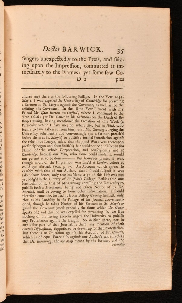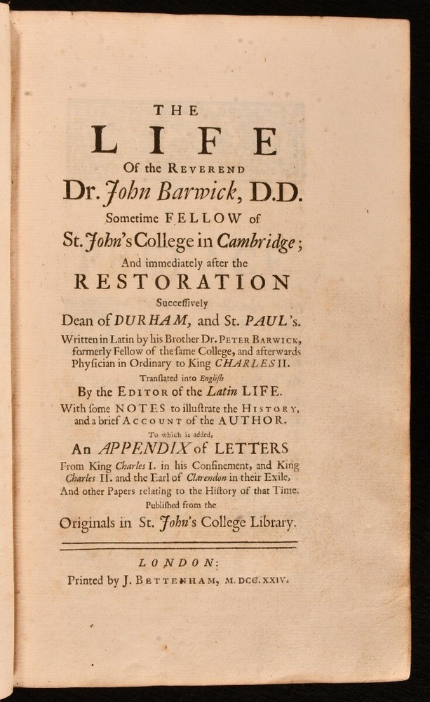 Click here to see our other books! The Life of the Reverend Dr. John Barwick Peter Barwick; Hilkiah Bedford 1724 J. Bettenham : London 9.5" by 6" [24], 552, [40pp] SUMMARY The first edition in English of Peter Barwick's brilliant biography on her brother, John Barwick, complete with two plates. First Edition,Illustrated,Leather Binding,Uncommon Overall Condition: Good This book weighs 2 KG when packed UK Postage: £ 3.99 US Postage: £ 29.99 EU Postage : £ 21.99 European Postage: £ 23.99 Asia Postage: £ 37.99 Worldwide Postage: £ 38.99 DESCRIPTION The first edition in English of this uncommon work, a large paper copy. A biography on the royalist churchman, Dean of St. Paul's, John Barwick. Illustrated with a frontispiece, and one plate, portraits depicting the two brothers. This is an insightful biography on Barwick, and offers a fascinating look at the English Civil War and Restoration. Barwick spend the Interregnum moving around in royalist circles, and corresponded with Charles, relaying to him the designs and attempts of the rebels, and conveying Charles' orders. Originally written in Latin by John's brother, Peter Barwick, here translated into English by Hilkiah Bedford. Peter was a one of the King's physicians in ordinary,and was known for his treatment of smallpox. His house was burned down during the Great Fire of London. CONDITION In a full calf binding. Externally, a little worn, with some rubbing and loss of leather to the spine and extremities, heavier to the rear board. Lacking most of the spine label. Minor bumping to the extremities. Some marks to the boards. Small ring mark to the front board and small damp stain to the rear board. Joints are starting but firm. Front hinge is tender, rear hinge is starting. Ink inscription to the front paste down. Small match of worming to the paste downs and endpapers. Internally, firmly bound. Pages are bright and clean, with a few scattered spots and handling marks. Overall Condition: Good GLOSSARY OF TERMS Overall Condition (Dustwrapper condition rating is shown after that for the book itself, where a dustwrapper is present) Fine - Very well preserved copy showing very little wear Very Good Indeed - Only one or two minor faults, really a very attractive copy Very Good - Quite a wide term meaning no major faults but probably several smaller ones often expected given the age of the book, but still a respectable copy Good - Meaning not very good. Some more serious faults as will be described in the condition report under 'condition' Good Only - Meaning one or more faults that could really do with repair Fair - As with good only above but with other faults leaving a compromised copy even after repair Poor - Really bad and possibly seriously incomplete. We only sell books in this condition where their rarity or value makes them attractive none the less. Major defects will be described. GUARANTEE We offer a full money back guarantee on our descriptions. Please ask for details and conditions. We prefer PAYPAL. If you pay via PAYPAL we will post the item off the same or the next working day with the postage you have selected. Please note we cannot accept USD cheques