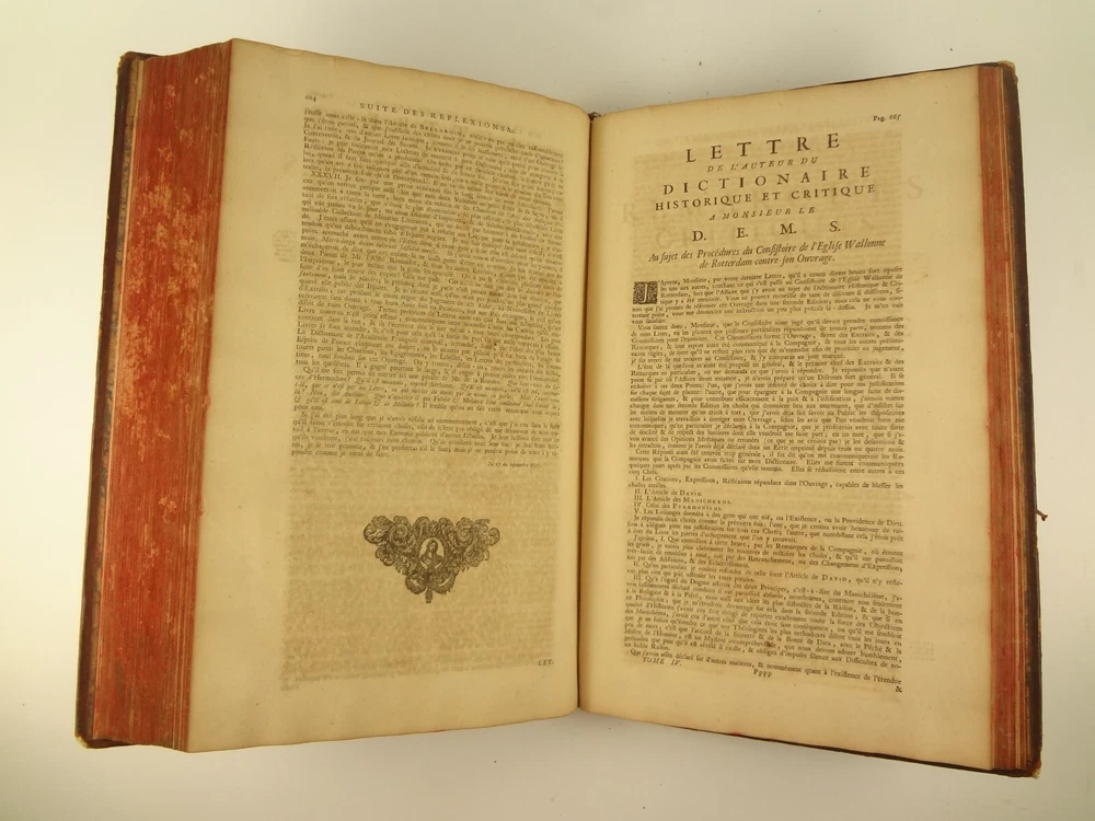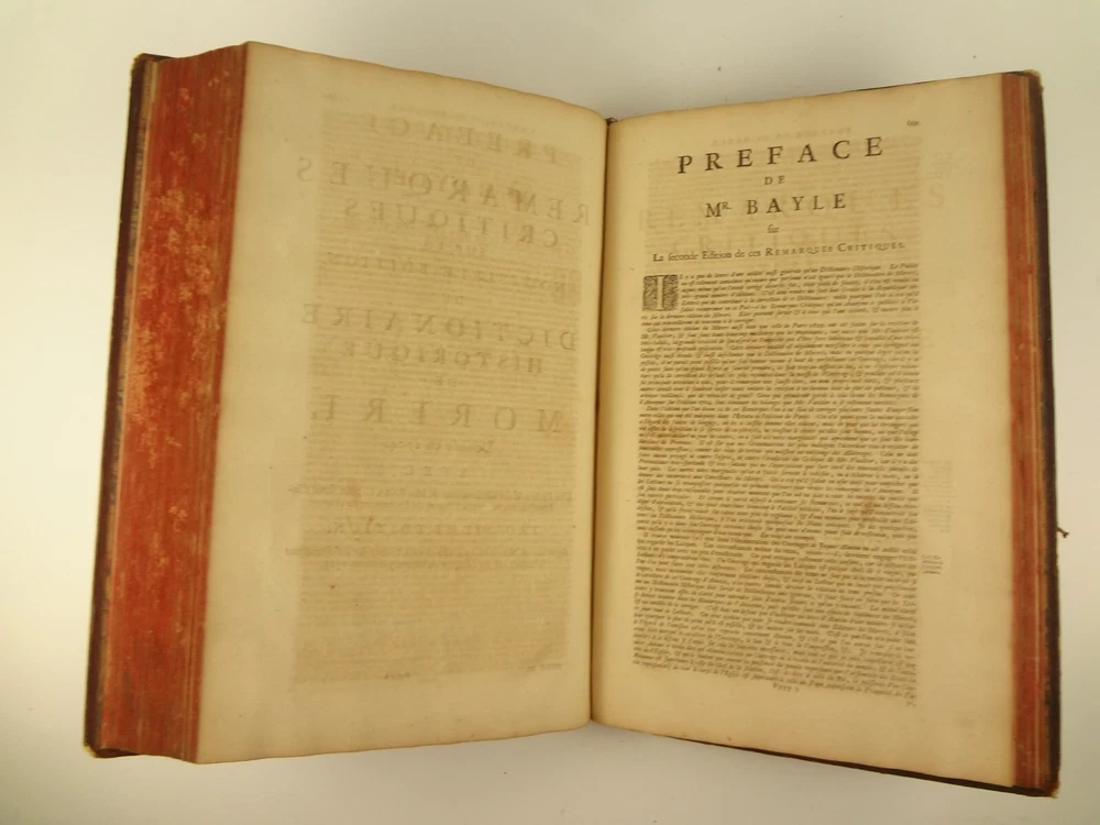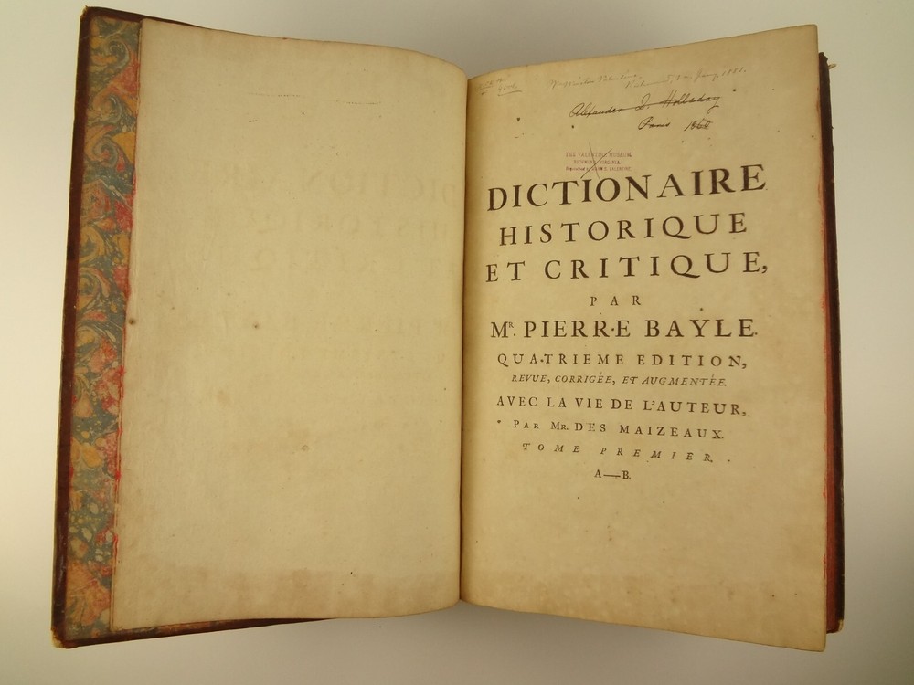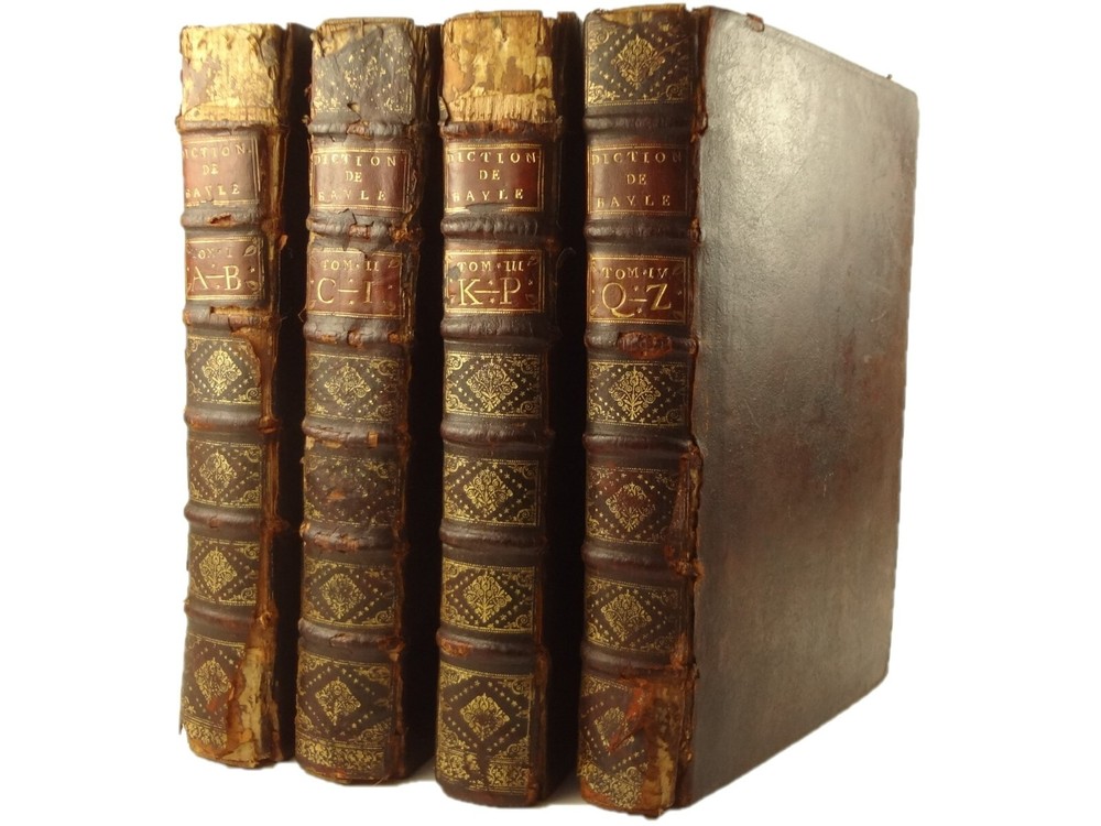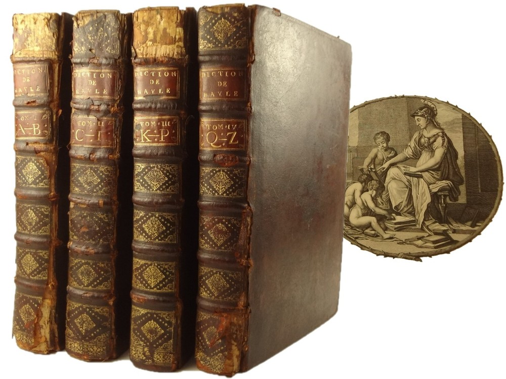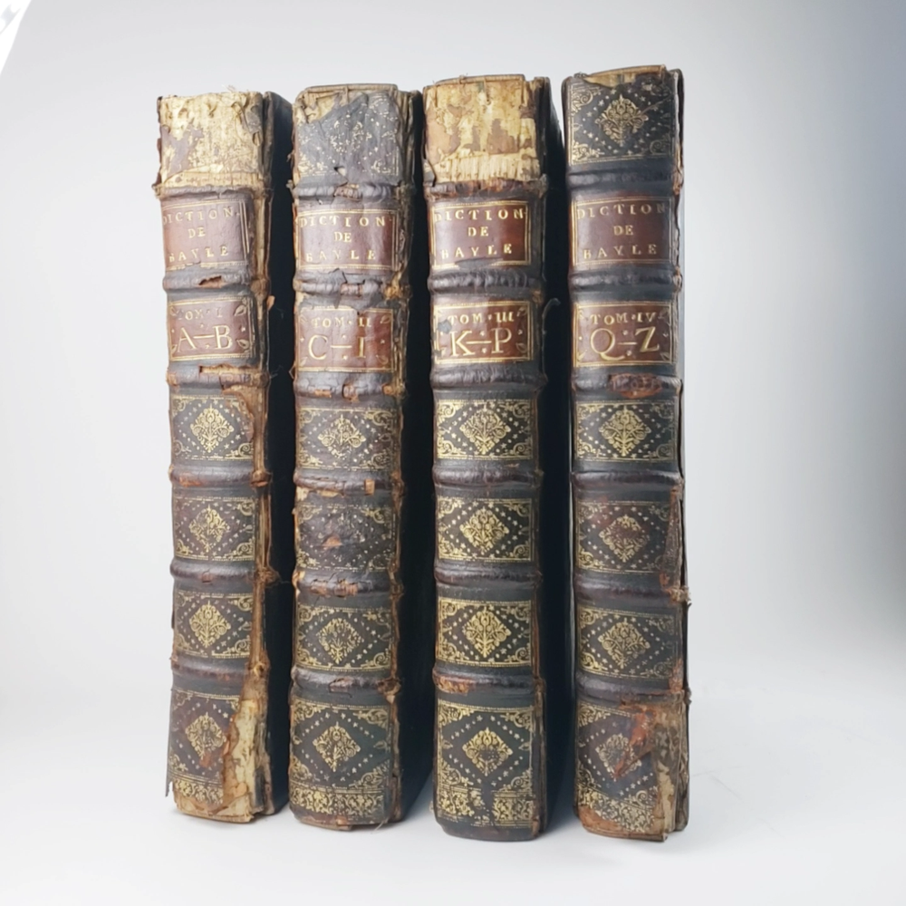 Imposing folio, complete in four volumes, 4th edition of Pierre Bayle's Dictionaire Historique et Critique, printed in 1730. About the Work - Pierre Bayle (1647–1706) was a Huguenot, i.e., a French Protestant, who spent almost the whole of his productive life as a refugee in Holland. His life was devoted entirely to scholarship, and his erudition was second to none in his, or perhaps any, period. Although much of what he wrote was embedded in technical religious issues, for a century he was one the most widely read philosophers. In particular, his Dictionnaire historique et critique was among the most popular works of the eighteenth century. The content of this huge and strange, yet fascinating work is difficult to describe: history, literary criticism, theology, obscenity, in addition to philosophical treatments of toleration, the problem of evil, epistemological questions, and much more. His influence on the Enlightenment was, whether intended or not, largely subversive. Said Voltaire: “the greatest master of the art of reasoning that ever wrote, Bayle, great and wise, all systems overthrows.” – Stanford Encyclopedia of Philosophy Bibliographic Details - Worldcat OCLC catalogue number 6035623. Engraved title page vignettes and head-piece; initials. Vignette has below "A vandr Werf pinxit; G. vandr Geuwen sculpsit." Title page printed in red and black. Amsterdam bookseller in three lines, preceded by bracketed 'chez' Edited by Prosper Marchand "Avec privilege". Privilege on first leaf after title page signed by J.G.V. Boetzelaar and Willem Buys Dedication on following two leaves to the Duc d'Orleans, Regent de France, signed by Michel Bohm Each volume half-title page preceding main title page Includes index Physical Attributes - Each vol. measures approx. 40 x 26 x 4.5 cm, folio. Leather bindings of the time. Spines with 6 raised bands; five compartments with central gilt medallion, two compartments with title, author and "Tom" with letters in gilt on red morocco. All edges red. Tome premier. A-B Tome second. C-I Tome troisieme. K-P Tome quatrieme. Q-Z Condition - See pictures. Well-worn bindings with corner wear, cracked joints, rubs, etc. Some spine compartment loose or flaps. Ex-libris books; stamps on pastedowns, 1/2 title-pages, title pages, etc. "Valentine Museum Richmond Virginia". Some toning, thumbing, foxing, dog-eared pages, occasional page-edge chip, etc. throughout. Half-title pages with Valentine personal signature 1881 and Alexander (?) Holladay Paris 1860. Some pages toned more than others. Some moisture intrusions from edges, mostly marginal but occasionally stretching into text; worst at start of V.1. Occasional candle ember spot. 3rd volume title page quite toned. Crease at top corner of 1st 70 leaves of volume 4. No annotations in text blocks. Despite wear to bindings, holding together well (likely because of the large spine cords) and the pages are easy to turn through.
