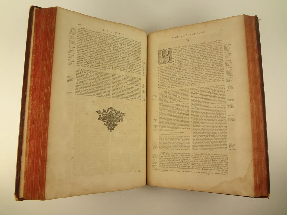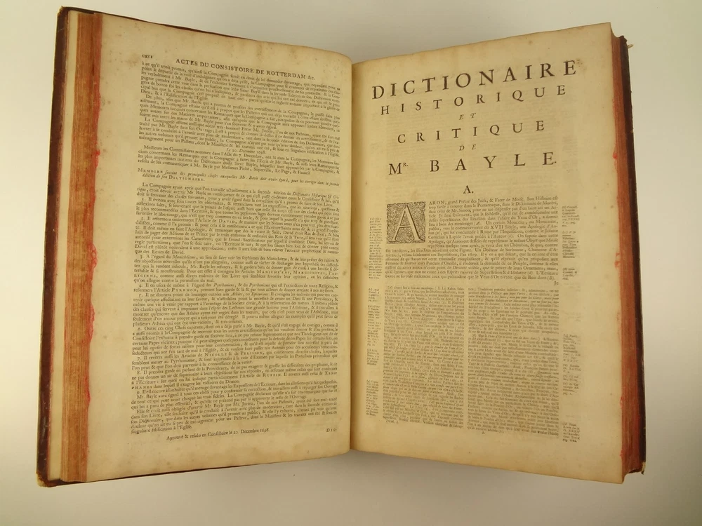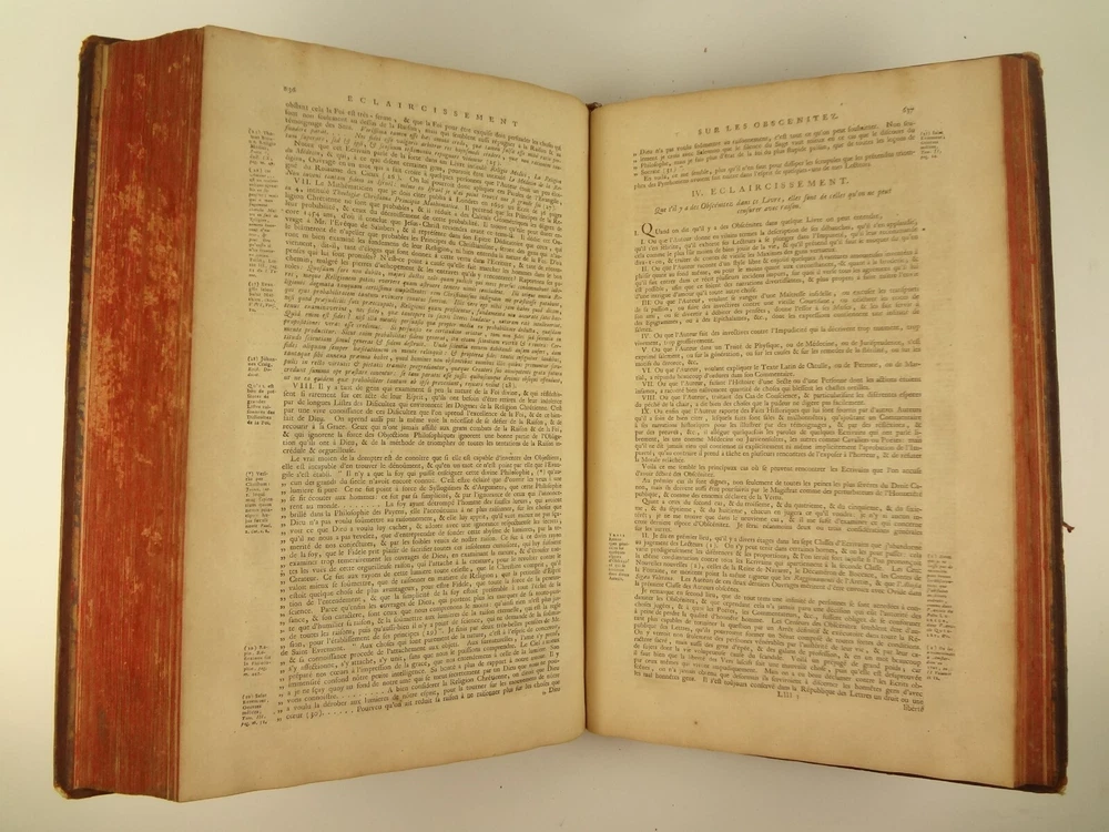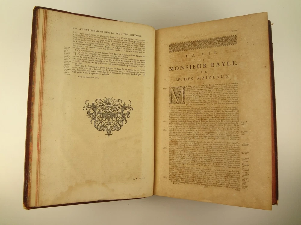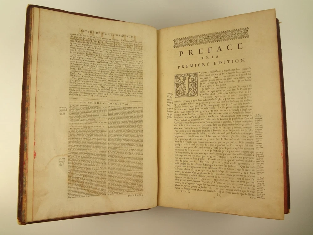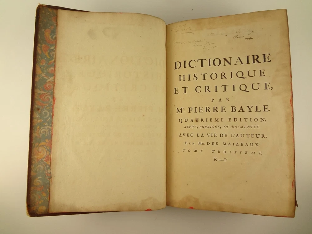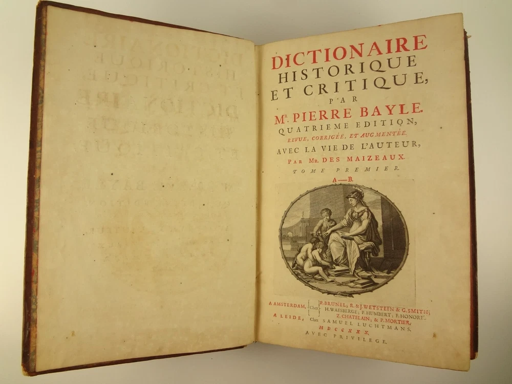 Imposing folio, complete in four volumes, 4th edition of Pierre Bayle's Dictionaire Historique et Critique, printed in 1730. About the Work - Pierre Bayle (1647–1706) was a Huguenot, i.e., a French Protestant, who spent almost the whole of his productive life as a refugee in Holland. His life was devoted entirely to scholarship, and his erudition was second to none in his, or perhaps any, period. Although much of what he wrote was embedded in technical religious issues, for a century he was one the most widely read philosophers. In particular, his Dictionnaire historique et critique was among the most popular works of the eighteenth century. The content of this huge and strange, yet fascinating work is difficult to describe: history, literary criticism, theology, obscenity, in addition to philosophical treatments of toleration, the problem of evil, epistemological questions, and much more. His influence on the Enlightenment was, whether intended or not, largely subversive. Said Voltaire: “the greatest master of the art of reasoning that ever wrote, Bayle, great and wise, all systems overthrows.” – Stanford Encyclopedia of Philosophy Bibliographic Details - Worldcat OCLC catalogue number 6035623. Engraved title page vignettes and head-piece; initials. Vignette has below "A vandr Werf pinxit; G. vandr Geuwen sculpsit." Title page printed in red and black. Amsterdam bookseller in three lines, preceded by bracketed 'chez' Edited by Prosper Marchand "Avec privilege". Privilege on first leaf after title page signed by J.G.V. Boetzelaar and Willem Buys Dedication on following two leaves to the Duc d'Orleans, Regent de France, signed by Michel Bohm Each volume half-title page preceding main title page Includes index Physical Attributes - Each vol. measures approx. 40 x 26 x 4.5 cm, folio. Leather bindings of the time. Spines with 6 raised bands; five compartments with central gilt medallion, two compartments with title, author and "Tom" with letters in gilt on red morocco. All edges red. Tome premier. A-B Tome second. C-I Tome troisieme. K-P Tome quatrieme. Q-Z Condition - See pictures. Well-worn bindings with corner wear, cracked joints, rubs, etc. Some spine compartment loose or flaps. Ex-libris books; stamps on pastedowns, 1/2 title-pages, title pages, etc. "Valentine Museum Richmond Virginia". Some toning, thumbing, foxing, dog-eared pages, occasional page-edge chip, etc. throughout. Half-title pages with Valentine personal signature 1881 and Alexander (?) Holladay Paris 1860. Some pages toned more than others. Some moisture intrusions from edges, mostly marginal but occasionally stretching into text; worst at start of V.1. Occasional candle ember spot. 3rd volume title page quite toned. Crease at top corner of 1st 70 leaves of volume 4. No annotations in text blocks. Despite wear to bindings, holding together well (likely because of the large spine cords) and the pages are easy to turn through.