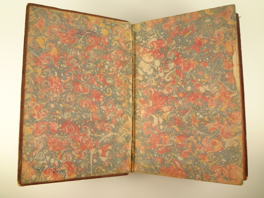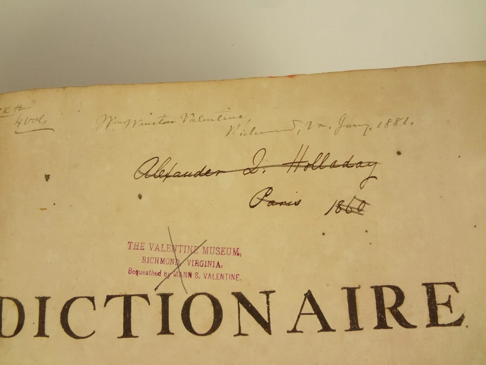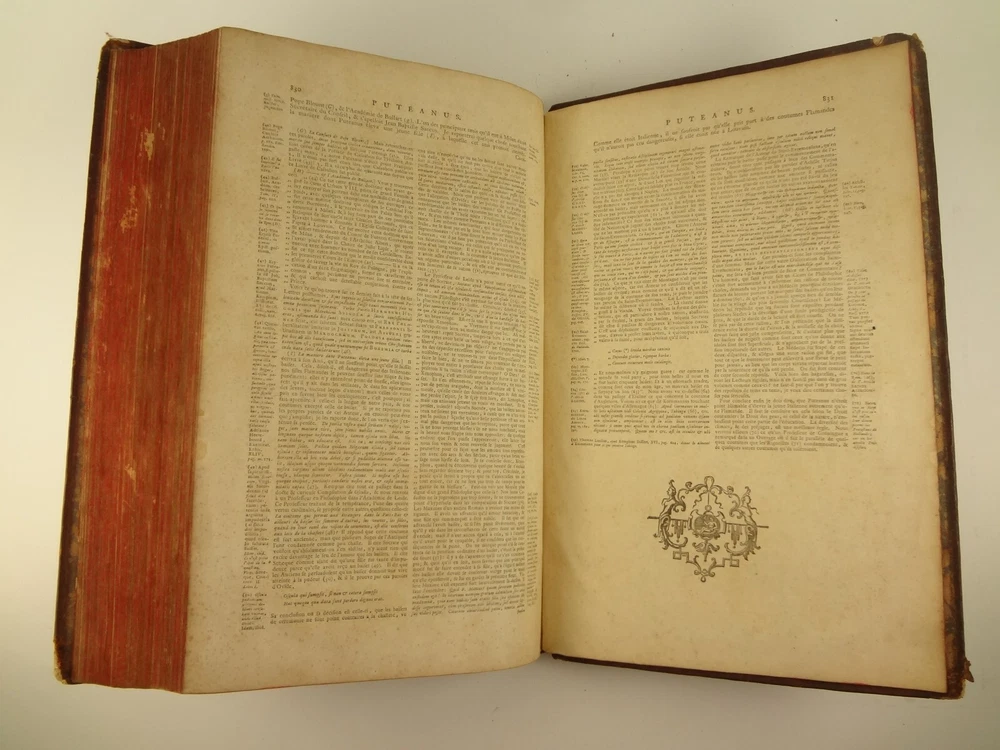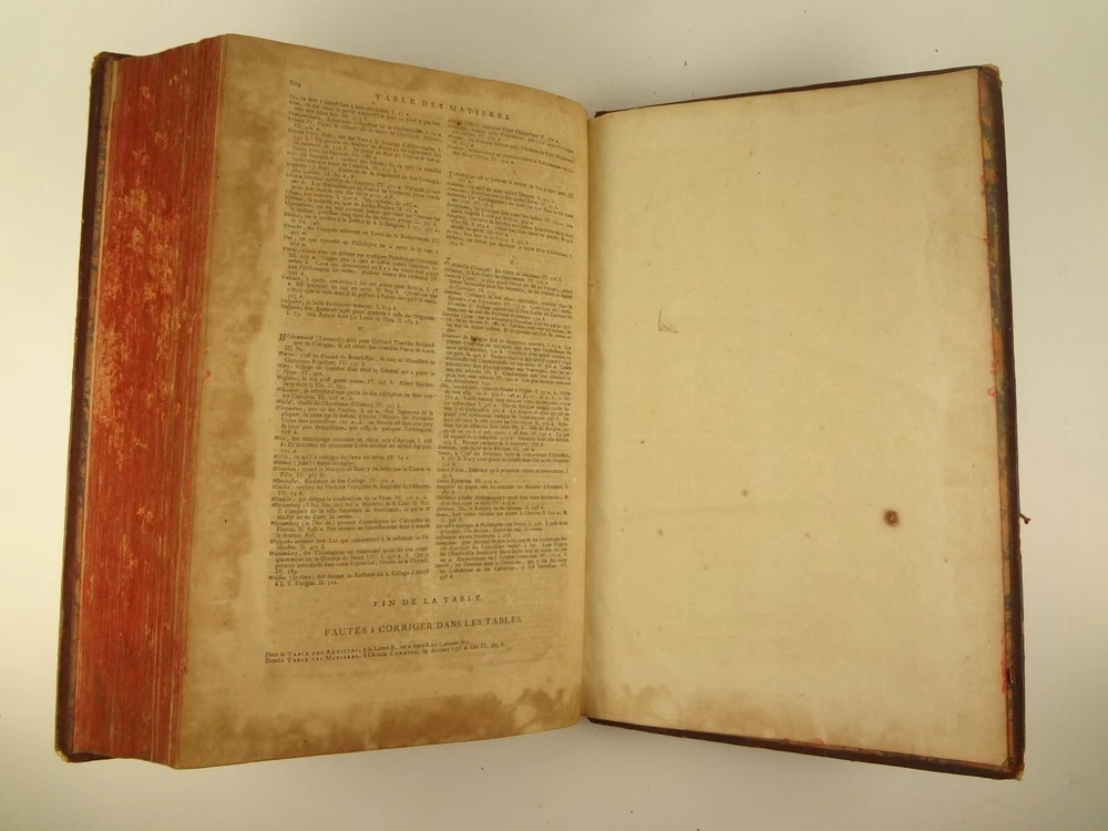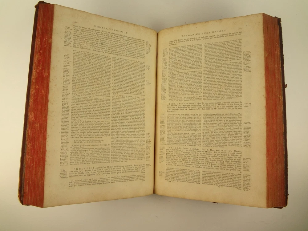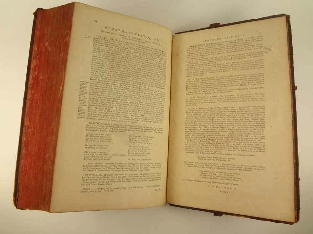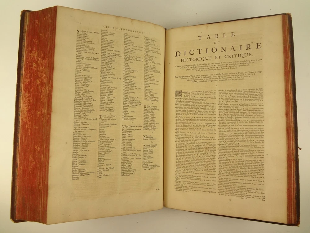 Imposing folio, complete in four volumes, 4th edition of Pierre Bayle's Dictionaire Historique et Critique, printed in 1730. About the Work - Pierre Bayle (1647–1706) was a Huguenot, i.e., a French Protestant, who spent almost the whole of his productive life as a refugee in Holland. His life was devoted entirely to scholarship, and his erudition was second to none in his, or perhaps any, period. Although much of what he wrote was embedded in technical religious issues, for a century he was one the most widely read philosophers. In particular, his Dictionnaire historique et critique was among the most popular works of the eighteenth century. The content of this huge and strange, yet fascinating work is difficult to describe: history, literary criticism, theology, obscenity, in addition to philosophical treatments of toleration, the problem of evil, epistemological questions, and much more. His influence on the Enlightenment was, whether intended or not, largely subversive. Said Voltaire: “the greatest master of the art of reasoning that ever wrote, Bayle, great and wise, all systems overthrows.” – Stanford Encyclopedia of Philosophy Bibliographic Details - Worldcat OCLC catalogue number 6035623. Engraved title page vignettes and head-piece; initials. Vignette has below "A vandr Werf pinxit; G. vandr Geuwen sculpsit." Title page printed in red and black. Amsterdam bookseller in three lines, preceded by bracketed 'chez' Edited by Prosper Marchand "Avec privilege". Privilege on first leaf after title page signed by J.G.V. Boetzelaar and Willem Buys Dedication on following two leaves to the Duc d'Orleans, Regent de France, signed by Michel Bohm Each volume half-title page preceding main title page Includes index Physical Attributes - Each vol. measures approx. 40 x 26 x 4.5 cm, folio. Leather bindings of the time. Spines with 6 raised bands; five compartments with central gilt medallion, two compartments with title, author and "Tom" with letters in gilt on red morocco. All edges red. Tome premier. A-B Tome second. C-I Tome troisieme. K-P Tome quatrieme. Q-Z Condition - See pictures. Well-worn bindings with corner wear, cracked joints, rubs, etc. Some spine compartment loose or flaps. Ex-libris books; stamps on pastedowns, 1/2 title-pages, title pages, etc. "Valentine Museum Richmond Virginia". Some toning, thumbing, foxing, dog-eared pages, occasional page-edge chip, etc. throughout. Half-title pages with Valentine personal signature 1881 and Alexander (?) Holladay Paris 1860. Some pages toned more than others. Some moisture intrusions from edges, mostly marginal but occasionally stretching into text; worst at start of V.1. Occasional candle ember spot. 3rd volume title page quite toned. Crease at top corner of 1st 70 leaves of volume 4. No annotations in text blocks. Despite wear to bindings, holding together well (likely because of the large spine cords) and the pages are easy to turn through.