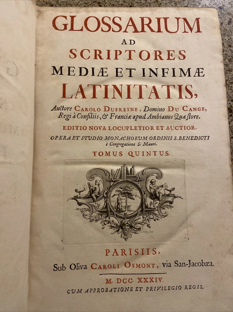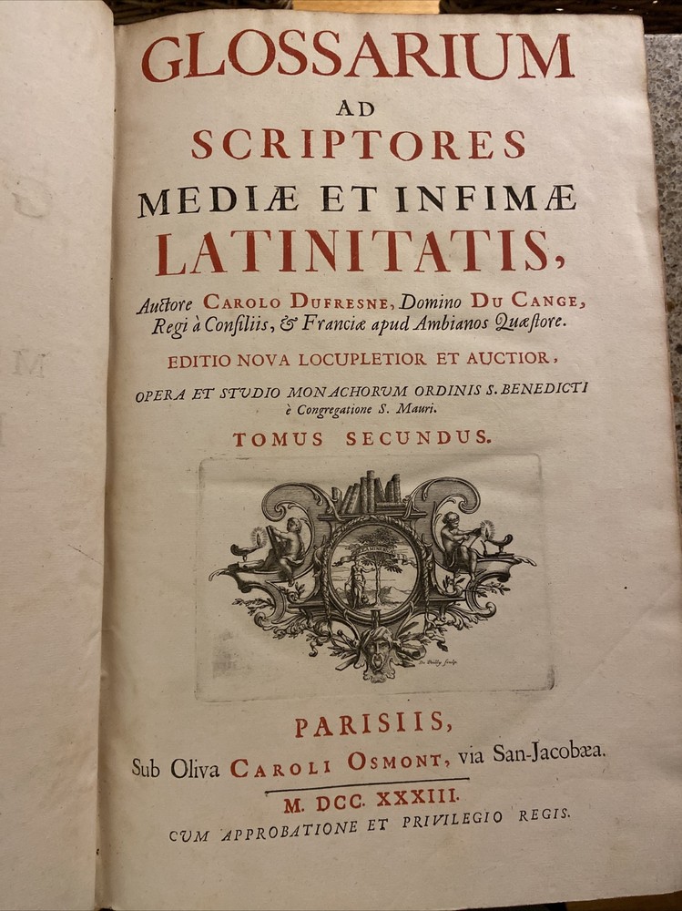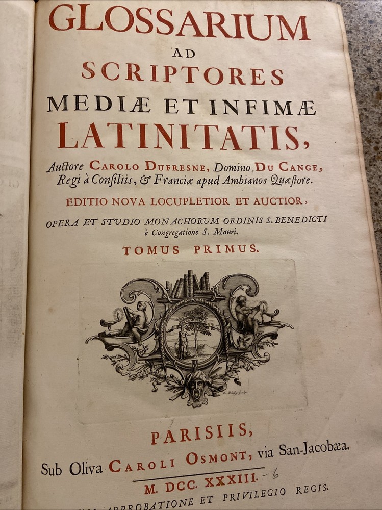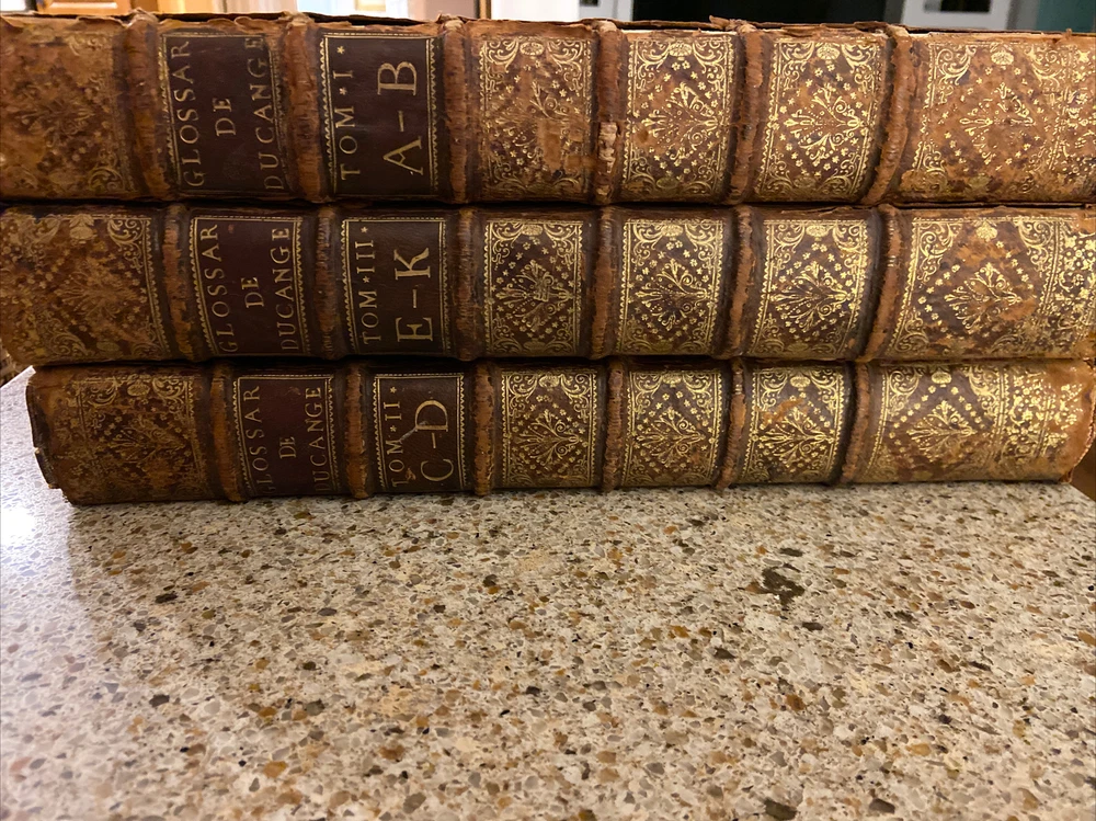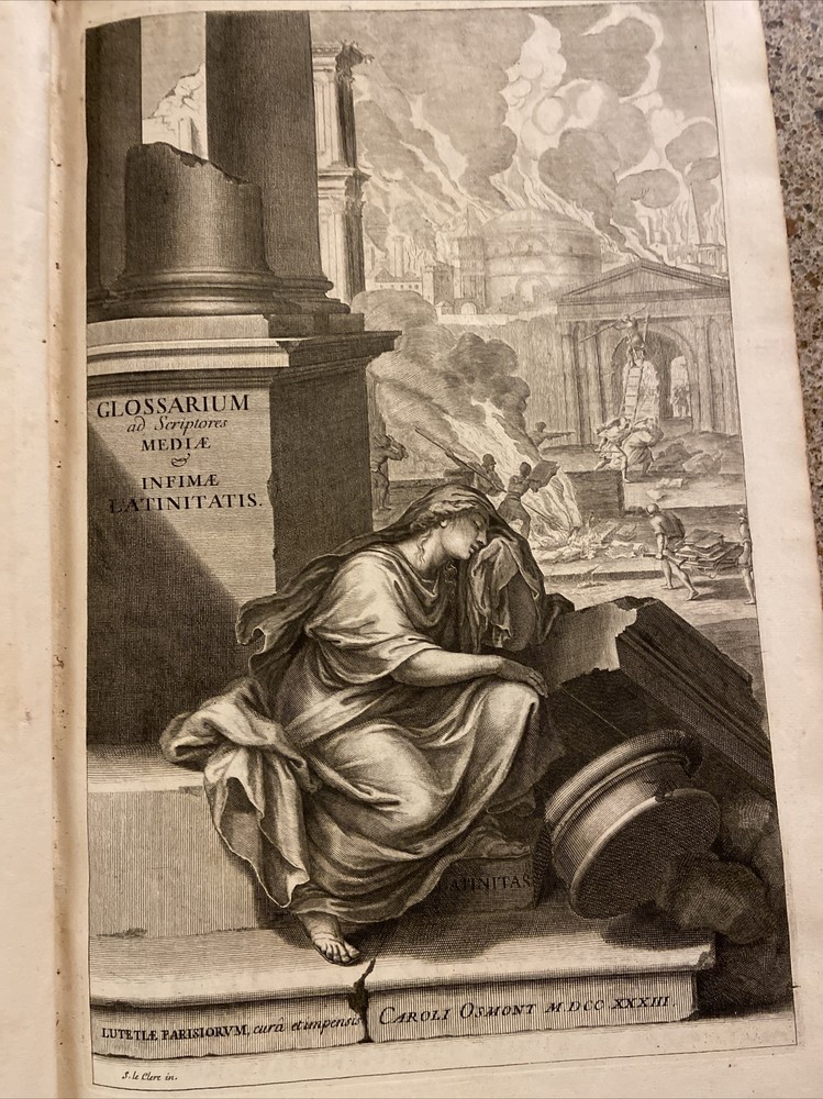 1733 Glossarium and Scriptores 6 volume set. 15.75 x 10.25 inches. Original leather bindings in very good condition considering size and age. Normal wear to boards; scuffs etc. Wear along outside hinges noted ( Tom I exhibits this the most but boards secure) . Binding and contents secure. Raised bands along spine with ornate gilt designs. Marbled end papers. Period writing seen on front free end paper. Contents are well preserved and clean. A very collectible and scarce set. Tom I A-B; 1393 pages Tom II C-D; 1705 pages Tom III E-K; 1679 pages. Tom IV L-O; 1420 pages Tom V P-R; 1562 pages Tom VI S-Z; 1815 pages