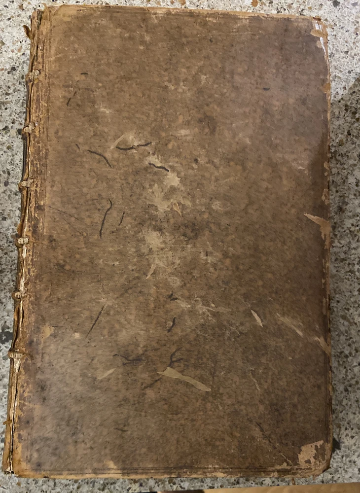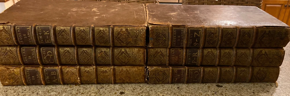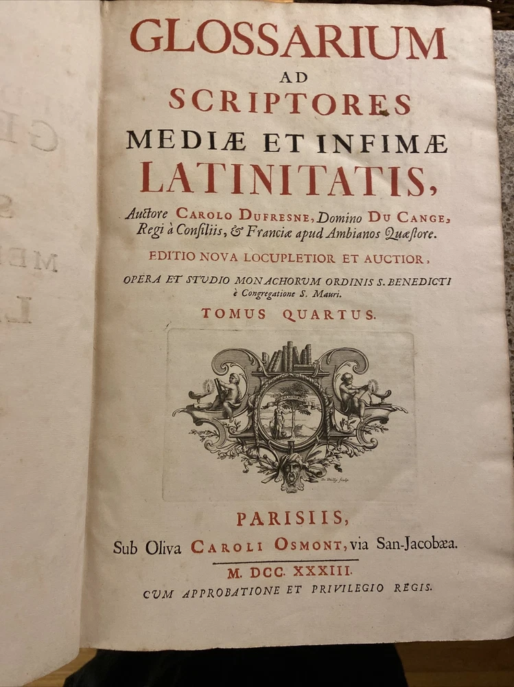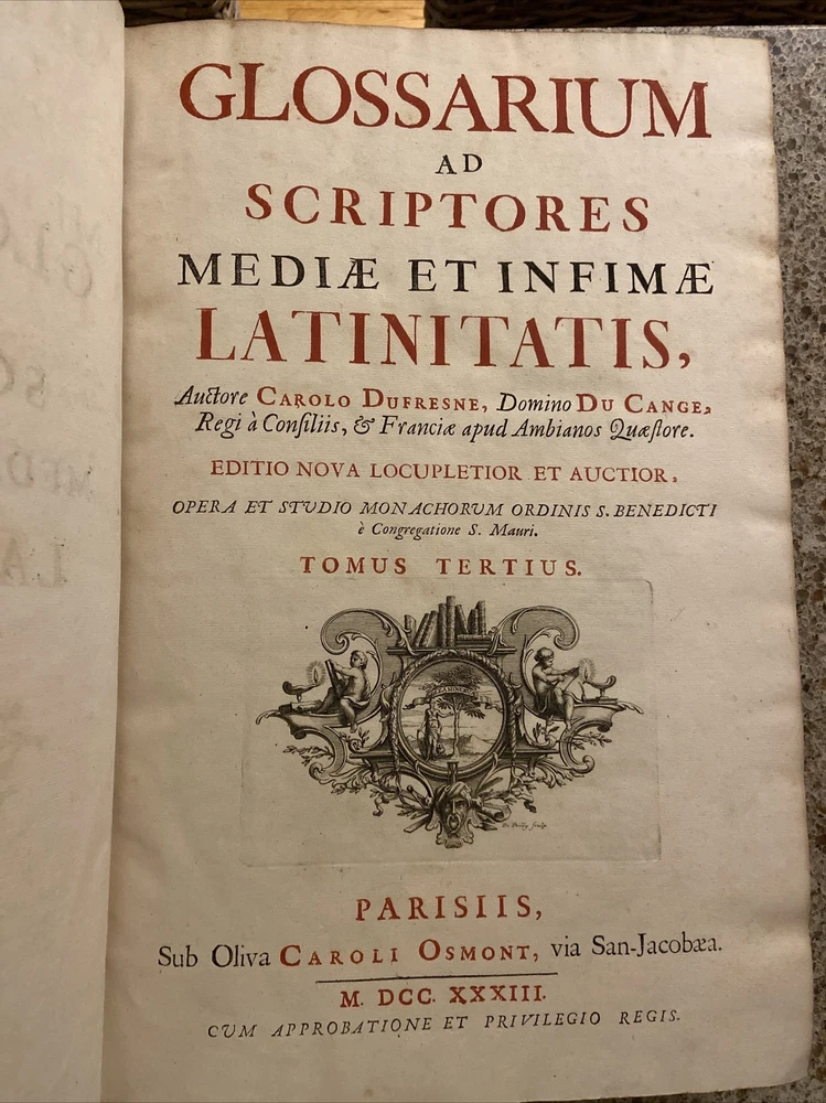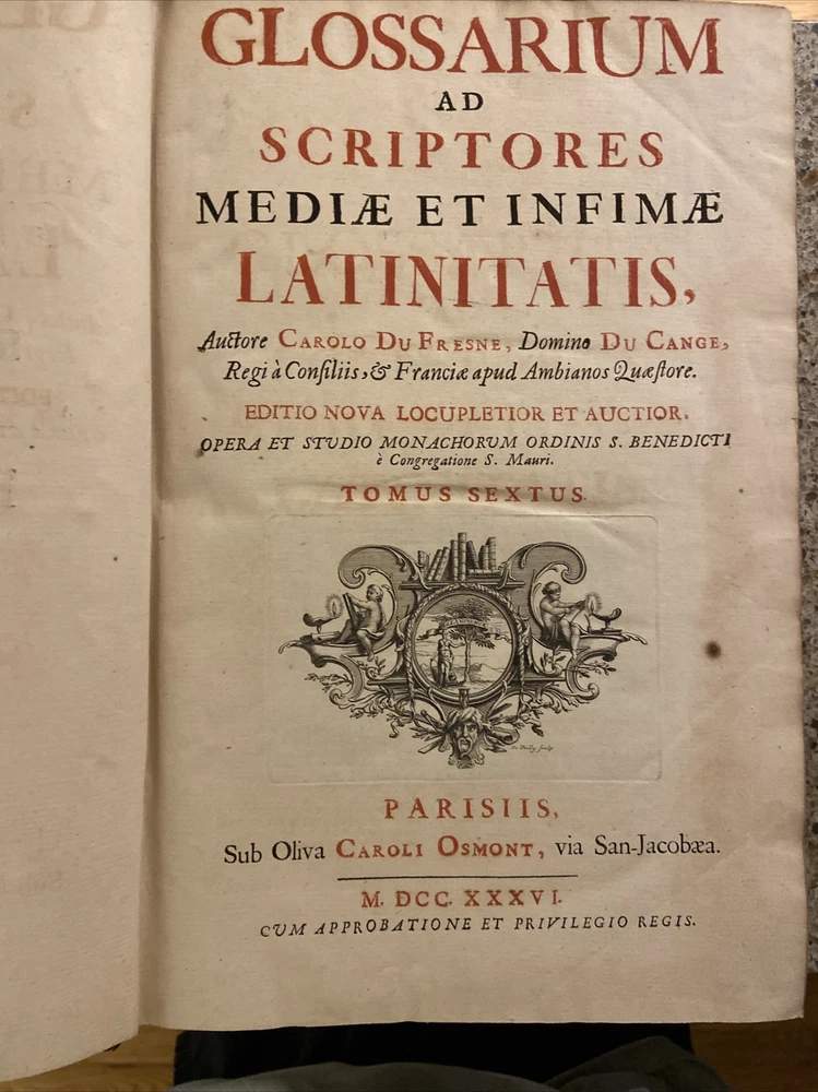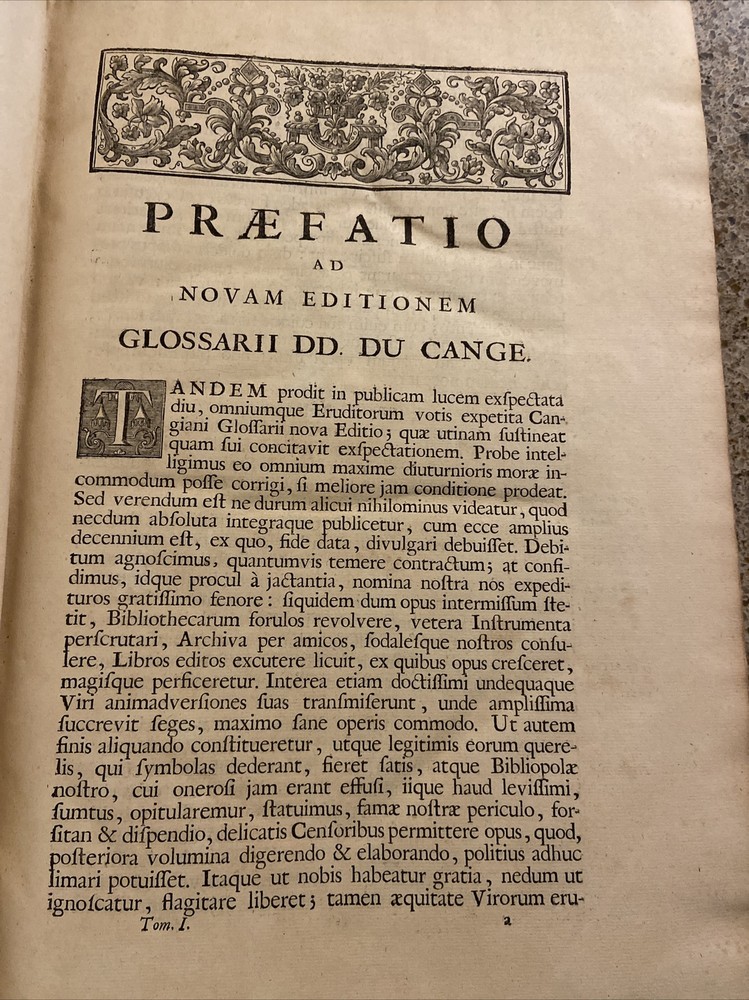 1733 Glossarium and Scriptores 6 volume set. 15.75 x 10.25 inches. Original leather bindings in very good condition considering size and age. Normal wear to boards; scuffs etc. Wear along outside hinges noted ( Tom I exhibits this the most but boards secure) . Binding and contents secure. Raised bands along spine with ornate gilt designs. Marbled end papers. Period writing seen on front free end paper. Contents are well preserved and clean. A very collectible and scarce set. Tom I A-B; 1393 pages Tom II C-D; 1705 pages Tom III E-K; 1679 pages. Tom IV L-O; 1420 pages Tom V P-R; 1562 pages Tom VI S-Z; 1815 pages