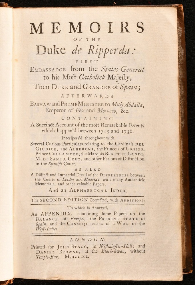 Click here to see our other books! Memoirs of the Duke de Ripperda: first Embassador from the States-General to his most Catholick Majesty, then Duke and Grandee of Spain; afterwards Bashaw and Prime Minister to Muly Abdalla, Emperor of Fez and Morocco, &c. Anonymous [John Campbell] 1740 John Stagg : London 8.5" by 5.5" xv [1], 1-390, 2pp SUMMARY A history of the life and diplomatic career of the eighteenth century Dutch diplomat. Early Edition,Leather Binding,Original Binding Overall Condition: Good This book weighs 0.75 KG when packed UK Postage: £ 3.99 US Postage: £ 19.99 EU Postage : £ 15.99 European Postage: £ 16.99 Asia Postage: £ 21.99 Worldwide Postage: £ 25.99 DESCRIPTION In a full calf binding, this is the second edition of this work. Although published anonymously, this is the work of Scottish author and biographer John Campbell, who also had a diplomatic career as her majesty's agent to one of the lesser American colonies. An entertaining history based around the varied life and diplomatic career of Juan Guillermo, the First Duke de Ripperda, with numerous amusing anecdotes drawn from the Moroccan and Spanish courts, alongside a a running commentary on the character of the two nations. In the final section, comparisons are drawn between the Spanish and English courts of the day. This work focuses on the 1715 to 1736 period of the Baron's life from the acceptance of his role as Dutch ambassador to Madrid, to the end of his life in Morocco. Featuring a two page publisher's advertisement to the rear, and a contemporary inscription to the front free endpaper, 'To: Arnoll'. ESTC reference no. T63900 CONDITION In the original full calf binding. Starting to front joint, with bumping to extremities and spine head and tail. Loss to the leather of the spine, most concentrated to head and tail. Marks to front and rear pastedown. Contemporary owner's inscription to front free endpaper. Internally, firmly bound. Pages are bright, with the odd mark. Overall Condition: Good GLOSSARY OF TERMS Overall Condition (Dustwrapper condition rating is shown after that for the book itself, where a dustwrapper is present) Fine - Very well preserved copy showing very little wear Very Good Indeed - Only one or two minor faults, really a very attractive copy Very Good - Quite a wide term meaning no major faults but probably several smaller ones often expected given the age of the book, but still a respectable copy Good - Meaning not very good. Some more serious faults as will be described in the condition report under 'condition' Good Only - Meaning one or more faults that could really do with repair Fair - As with good only above but with other faults leaving a compromised copy even after repair Poor - Really bad and possibly seriously incomplete. We only sell books in this condition where their rarity or value makes them attractive none the less. Major defects will be described. GUARANTEE We offer a full money back guarantee on our descriptions. Please ask for details and conditions. We prefer PAYPAL. If you pay via PAYPAL we will post the item off the same or the next working day with the postage you have selected. Please note we cannot accept USD cheques