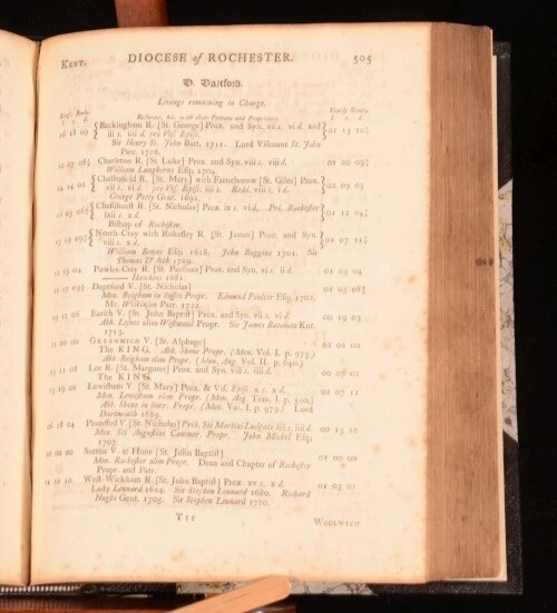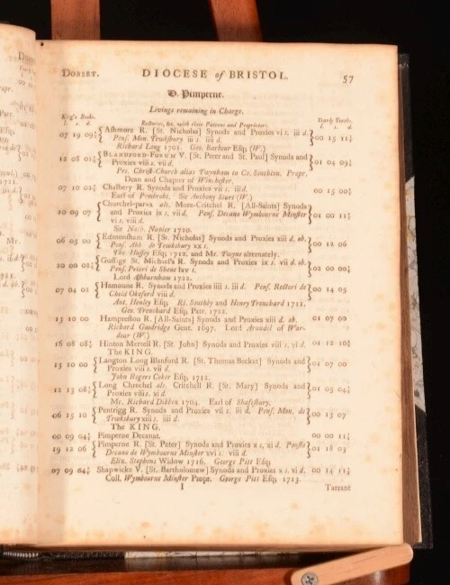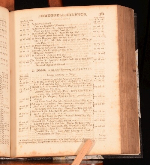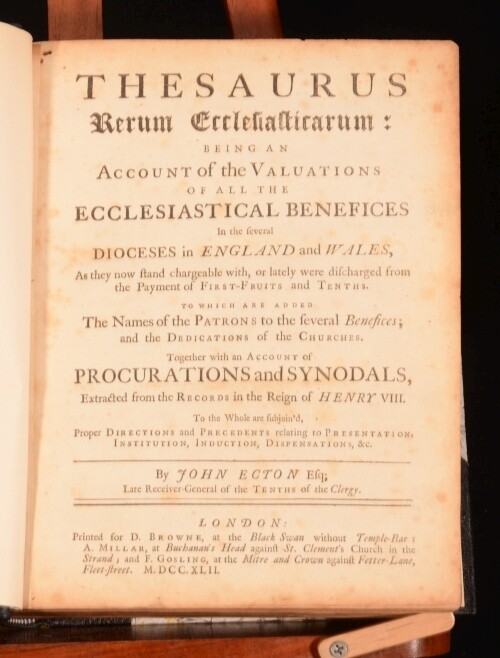 Click here to see our other books! Thesaurus Rerum Ecclesiasticarum: Being an Account of the Valuations of all the Ecclesiastical Benefices in the Several Dioceses in England and Wales John Ecton 1742 D Browne, A Millar and F Gosling : London 10" by 8" xxxix, 784pp, [8] SUMMARY An extremely useful 18th century work listing all the churches by region in England and Wales. Leather Binding Overall Condition: Very Good This book weighs 3 KG when packed UK Postage: £ 3.99 US Postage: £ 36.99 EU Postage : £ 25.99 European Postage: £ 27.99 Asia Postage: £ 47.99 Worldwide Postage: £ 69.99 DESCRIPTION 'As they now stand chargeable with, or lately were discharged from the payment of first-fruits and tenths. To which are added the names of the patrons to the several benefices; and the dedications of the churches. Together with an account of procurations and synodals, extracted from the records in the reign of Henry VIII. To the whole are subjoined, proper directions and precedents relating to presentation, institution, induction, dispensations etc'. John Ecton (died 1730), was an English compiler. Best known for his work ‘Liber Valorum et Decimarum; being an Account of the Valuations and Yearly Tenths of all such Ecclesiastical Benefices in England and Wales as now stand chargeable with the Payment of First-Fruits and Tenths … (Some Things necessary to be … performed by a Clergyman upon his admission to any Benefice),’ 8vo, London, 1711. Of this once useful compilation seven editions appeared between 1723 and 1796, the best being that published as ‘Thesaurus Rerum Ecclesiasticarum’. CONDITION Elegantly rebound in half morocco with marbled boards. Externally excellent with very little shelfwear. Internally, firmly bound. Bright but with marginal foxing throughout, damp staining to the last few pages. Overall Condition: Very Good GLOSSARY OF TERMS Overall Condition (Dustwrapper condition rating is shown after that for the book itself, where a dustwrapper is present) Fine - Very well preserved copy showing very little wear Very Good Indeed - Only one or two minor faults, really a very attractive copy Very Good - Quite a wide term meaning no major faults but probably several smaller ones often expected given the age of the book, but still a respectable copy Good - Meaning not very good. Some more serious faults as will be described in the condition report under 'condition' Good Only - Meaning one or more faults that could really do with repair Fair - As with good only above but with other faults leaving a compromised copy even after repair Poor - Really bad and possibly seriously incomplete. We only sell books in this condition where their rarity or value makes them attractive none the less. Major defects will be described. GUARANTEE We offer a full money back guarantee on our descriptions. Please ask for details and conditions. We prefer PAYPAL. If you pay via PAYPAL we will post the item off the same or the next working day with the postage you have selected. Please note we cannot accept USD cheques