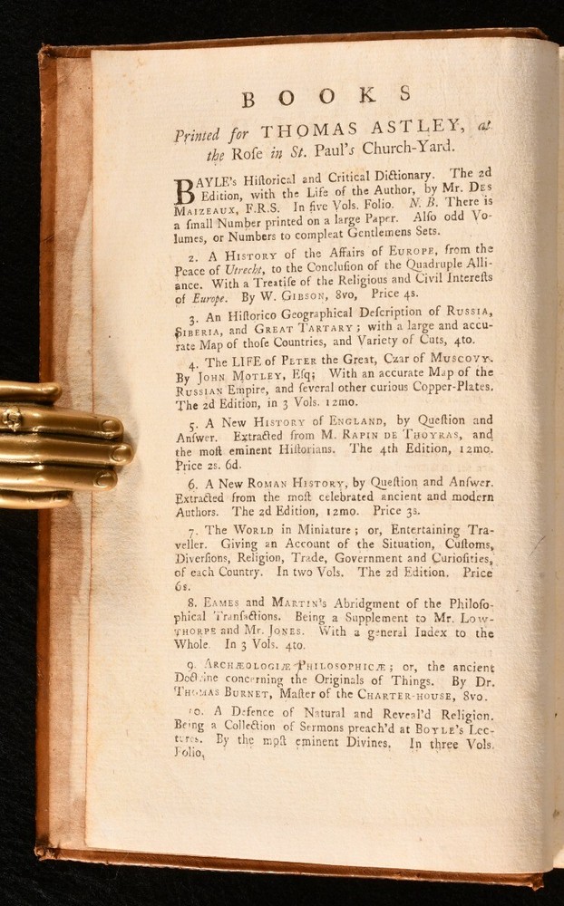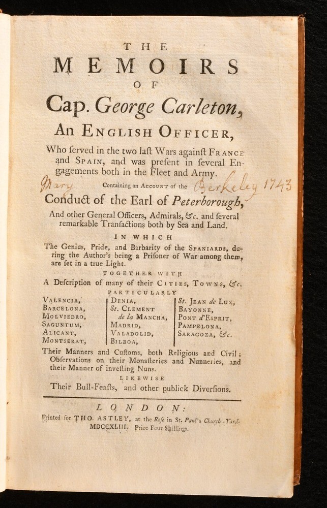 Click here to see our other books! The Memoirs of Cap. George Carleton, an English Officer George Carleton; [Daniel Defoe] 1743 Thomas Astley : London 8" by 5" [10], 2-352, 16pp SUMMARY A scarce reissue of the memoirs of Captain George Carleton, an intriguing work with a complicated authorship history. Leather Binding,Scarce Overall Condition: Good This book weighs 0.75 KG when packed UK Postage: £ 3.99 US Postage: £ 19.99 EU Postage : £ 15.99 European Postage: £ 16.99 Asia Postage: £ 21.99 Worldwide Postage: £ 25.99 DESCRIPTION A scarce work. A reissue with a new title, printed from the unsold sheets of the first edition. ESTC citation number T70329. The memoir of George Carleton, an English officer who served during the Dutch Wars of the 1670s, and in Spain, before he was captured by the Spanish in 1708. The authorship of this memoir has been much refuted since it's publication. It was once attributed to Daniel Defoe, and to Jonathan Swift, though it's now believed that it probably is a genuine memoir. Evidence of a real officer named Captain George Carleton was discovered in the 1920. Bookplate of Robert Berkeley to the front pastedown, an English political writer and significant activist for Catholic emancipation of the 1770s. His family home was Spetchley park, a country mansion in the hamlet of Spetchley near Worcester. One page of adverts to the front. CONDITION In a full calf binding. Externally, generally smart, with some discolouration to the boards and spine. Ringmark to the front board. Light marks to the boards. Faint surface cracks to the spine. Small cracks to the joints. A little loss to the head of the spine. Light bumping to the extremities. Hinges are starting but firm. Bookplate to the front paste down. Ink mark to the recto to the front endpaper. Internally, firmly bound. Pages are bright and clean with the odd spot. Prior owner's ink inscription to the title page. The occasional ink note to the margin. Overall Condition: Good GLOSSARY OF TERMS Overall Condition (Dustwrapper condition rating is shown after that for the book itself, where a dustwrapper is present) Fine - Very well preserved copy showing very little wear Very Good Indeed - Only one or two minor faults, really a very attractive copy Very Good - Quite a wide term meaning no major faults but probably several smaller ones often expected given the age of the book, but still a respectable copy Good - Meaning not very good. Some more serious faults as will be described in the condition report under 'condition' Good Only - Meaning one or more faults that could really do with repair Fair - As with good only above but with other faults leaving a compromised copy even after repair Poor - Really bad and possibly seriously incomplete. We only sell books in this condition where their rarity or value makes them attractive none the less. Major defects will be described. GUARANTEE We offer a full money back guarantee on our descriptions. Please ask for details and conditions. We prefer PAYPAL. If you pay via PAYPAL we will post the item off the same or the next working day with the postage you have selected. Please note we cannot accept USD cheques