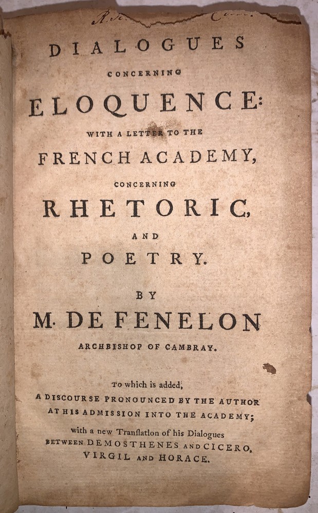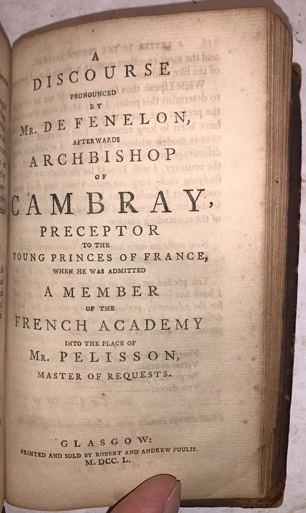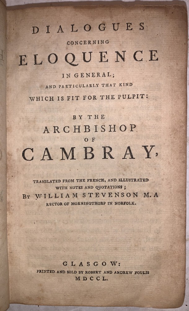 Dialogues Concerning Eloquence in General; and Particularly that Kind Which is Fit for the Pulpit by the Archbishop of Cambray Translated from the French, and Illustrated with Notes and Quotations; by William Stevenson M. A. Glasgow: Printed and Sold by Robert and Andrew Foulis 1750 16mo, xvi, 256, 25, [7] pages, bound in period full leather with gilt lettering and raised bands to spine. Top board detached, some moderate rubbing and wear, rear hinge cracked, light scattered foxing, else in good condition. If you have any questions feel free to ask and don't forget to check out my other listings.