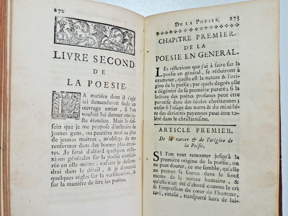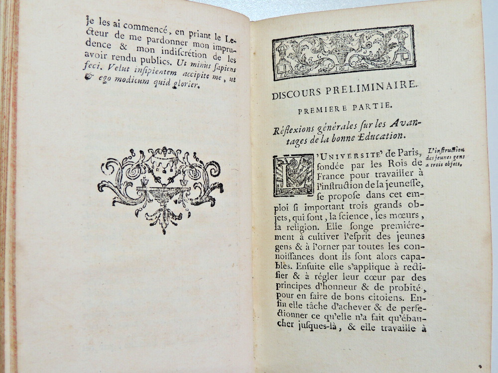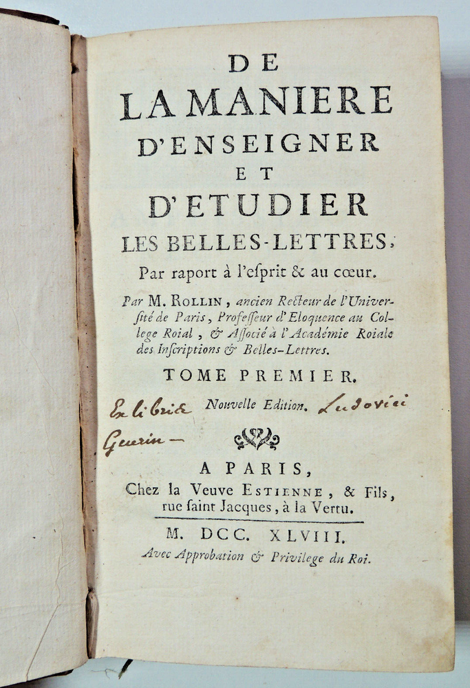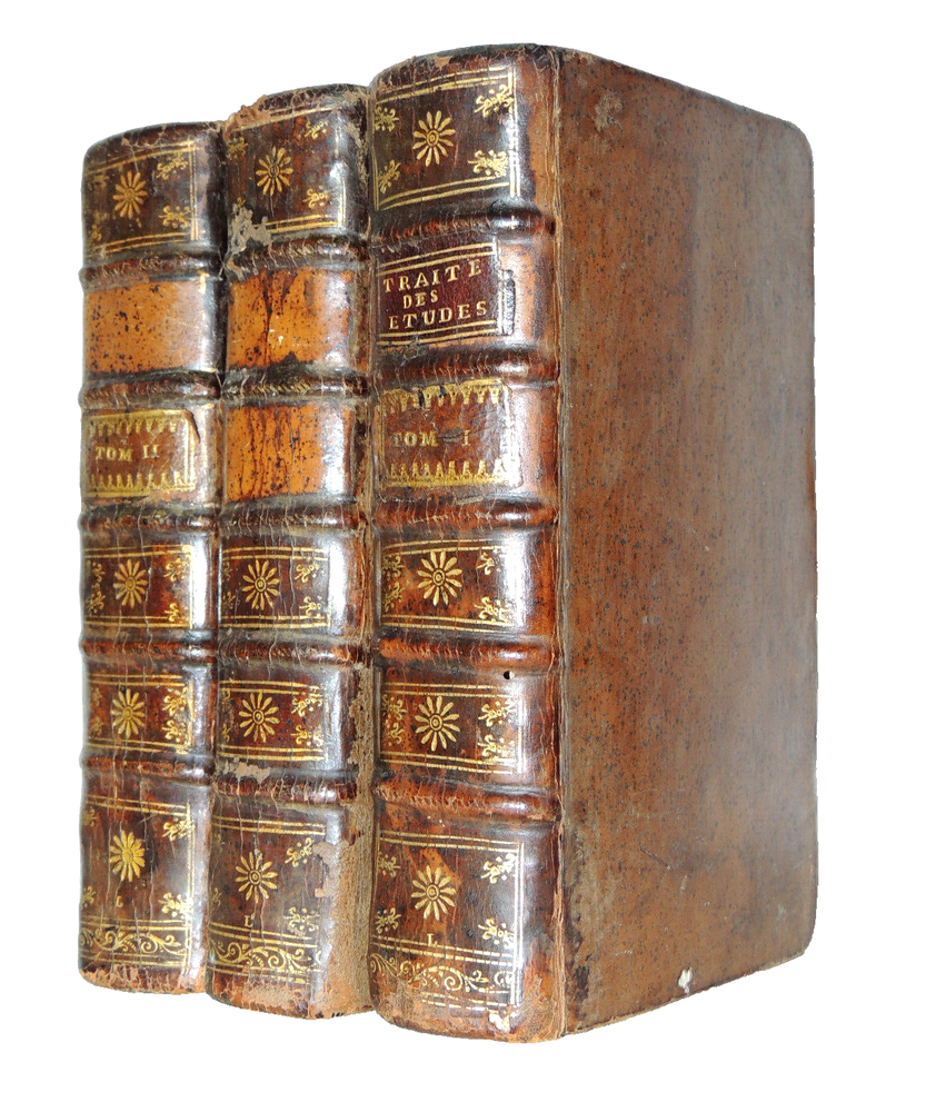 1751. Rollin. On the way to teach and study the fine letters. The description of this item has been automatically translated. If you have any questions, please feel free to contact us. Mr. Charles Rollin. On how to teach and study Belles lettres in relation to the mind & the heart. Also known under the title “Treatise of Studies”, this work enjoyed great success in the 18th century. Written by a famous academic from the Sorbonne keen to defend this institution in the face of the success of the Jesuit colleges, the treatise innovates little in pedagogy stricto sensu but proposes a vast, balanced educational program (notably in favor of French), integrating the use of images and the good use of leisure, open to the poorest and young women. It would be the first educational book written in French and not in Latin. He influenced Rousseau for his Émile. It constitutes a testimony to the amplification of reflection on education in the 18th century. Charles Rollin, born in Paris on January 30, 1661 and died on September 13, 1741 in his hometown, is a historian and professor of French Complete in 3 volumes, extract from the summary: Volume I. 1748: preliminary speech, object of instruction (Fine Arts - Sciences - Morals - Religion), good taste, intelligence of languages, poetry, reading Homer.- Volume II. 1748. (small tear on title page) of rhetoric, reading and explanation of the authors, of the three genres of eloquence - new edition - Volume III. 1741. of History. Holy History, Secular History. period full calfskin bindings, tears, good general condition, some defects from use, 576, 640 & 500pp. Handwritten ex libris Ludovici Guerin Paris At The Widow Estienne 1741/1748 ref/24/2 Also known under the title “Treatise of Studies”, this work enjoyed great success in the 18th century. Written by a famous academic from the Sorbonne keen to defend this institution in the face of the success of the Jesuit colleges, the treatise innovates little in pedagogy stricto sensu but proposes a vast, balanced educational program (notably in favor of French), integrating the use of images and the good use of leisure, open to the poorest and young women. It would be the first educational book written in French and not in Latin. He influenced Rousseau for his Émile. It constitutes a testimony to the amplification of reflection on education in the 18th century. Complete in 3 volumes, extract from the summary: Volume I. 1748: preliminary speech, object of instruction (Fine Arts - Scienc Auteur Rollin Reliure Cuir Langue Français Époque XVIIIème Sujet Essais, études littéraires