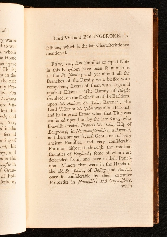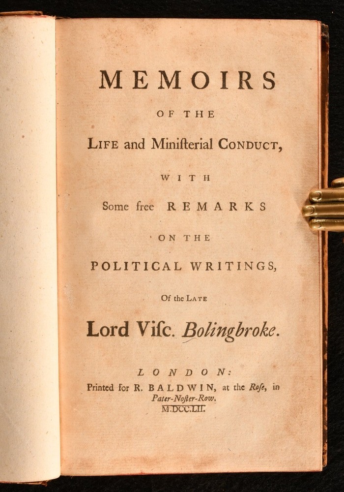 Click here to see our other books! Memoirs of the Life and Ministerial Conduct, with some free Remarks on the Political Writings, of the late Lord Visc. Bolingbroke Lord Viscount Bolingbroke 1752 R. Baldwin : London 8.5" by 5.5" [14], 352pp SUMMARY A fascinating and insightful autobiographical work regarding the life of Henry St John, 1st Viscount Bolingbroke. Leather Binding Overall Condition: Good This book weighs 0.75 KG when packed UK Postage: £ 3.99 US Postage: £ 19.99 EU Postage : £ 15.99 European Postage: £ 16.99 Asia Postage: £ 21.99 Worldwide Postage: £ 25.99 DESCRIPTION ESTC Citation No. N4592. Detailing the life and writings of this important British politician. Henry St. John (1678-1751) was an English politician and government official who led the Tory party. A supporter of the Jacobite rebellion of 1715, he was forced to flee to France and became foreign minister for James Francis Edward Stuart. His works were influential on the likes of Voltaire, John Adams and Thomas Jefferson. Edited and published by David Mallet (c1705-1765), a Scottish writer and dramatist. Printed the year subsequent to the subject's death. CONDITION In a contemporary full calf binding. Externally generally smart; spine and extremities are somewhat rubbed, with a sticker to the head of the spine. Contemporary inscription to the front endpaper, as well as annotations throughout the text. Internally, generally firmly bound; front hinge is starting, but binding is otherwise tight. Pages are generally bright and clean. Overall Condition: Good GLOSSARY OF TERMS Overall Condition (Dustwrapper condition rating is shown after that for the book itself, where a dustwrapper is present) Fine - Very well preserved copy showing very little wear Very Good Indeed - Only one or two minor faults, really a very attractive copy Very Good - Quite a wide term meaning no major faults but probably several smaller ones often expected given the age of the book, but still a respectable copy Good - Meaning not very good. Some more serious faults as will be described in the condition report under 'condition' Good Only - Meaning one or more faults that could really do with repair Fair - As with good only above but with other faults leaving a compromised copy even after repair Poor - Really bad and possibly seriously incomplete. We only sell books in this condition where their rarity or value makes them attractive none the less. Major defects will be described. GUARANTEE We offer a full money back guarantee on our descriptions. Please ask for details and conditions. We prefer PAYPAL. If you pay via PAYPAL we will post the item off the same or the next working day with the postage you have selected. Please note we cannot accept USD cheques