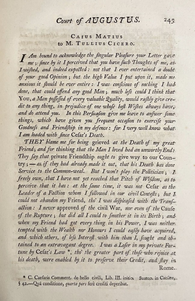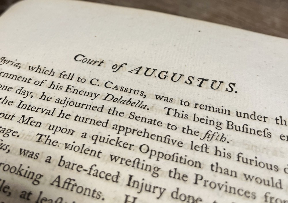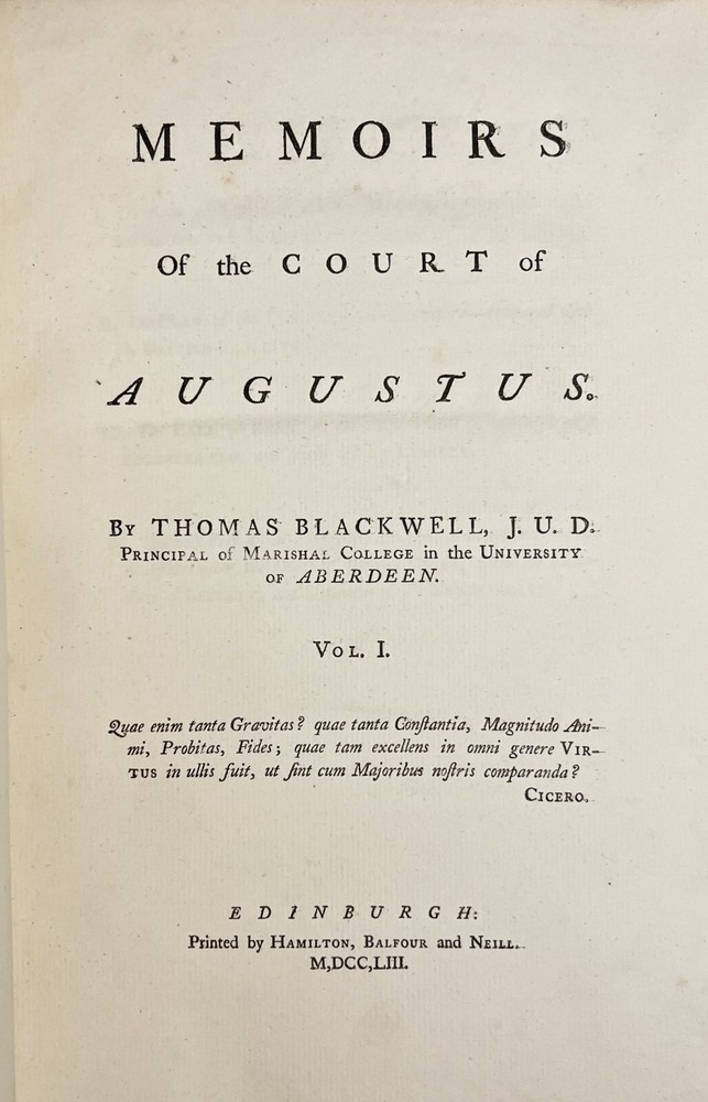 Memoirs of the Court of Augustus. (two volumes). Thomas Blackwell. [1753] first edition; Hamilton; about good antiquarian hardcovers. Illustrated with b/w plates [generally mint profile types of images]. A very scarce two-volume set; text in English. The collection of first-person accounts of select contemporaries of Emperor Augustus. Quarto (or slightly larger) hardcovers in original period calf with raised spine bands and worn ribbon markers. A few inventory markings - light and out of the way. Worn labels; typical rubbing and bumping; moderate to heavy wear at spine extremes. Both boards cracked at front joints, with boards kept in place by internal tan tape of unknown age. Both volumes complete; internally tidy with occasional toning, spotting. Overall, quite a find for the collector, researcher, and/or Rome enthusiast. Thanks for visiting Forgotten Lore.