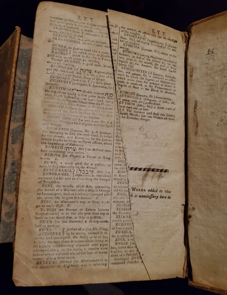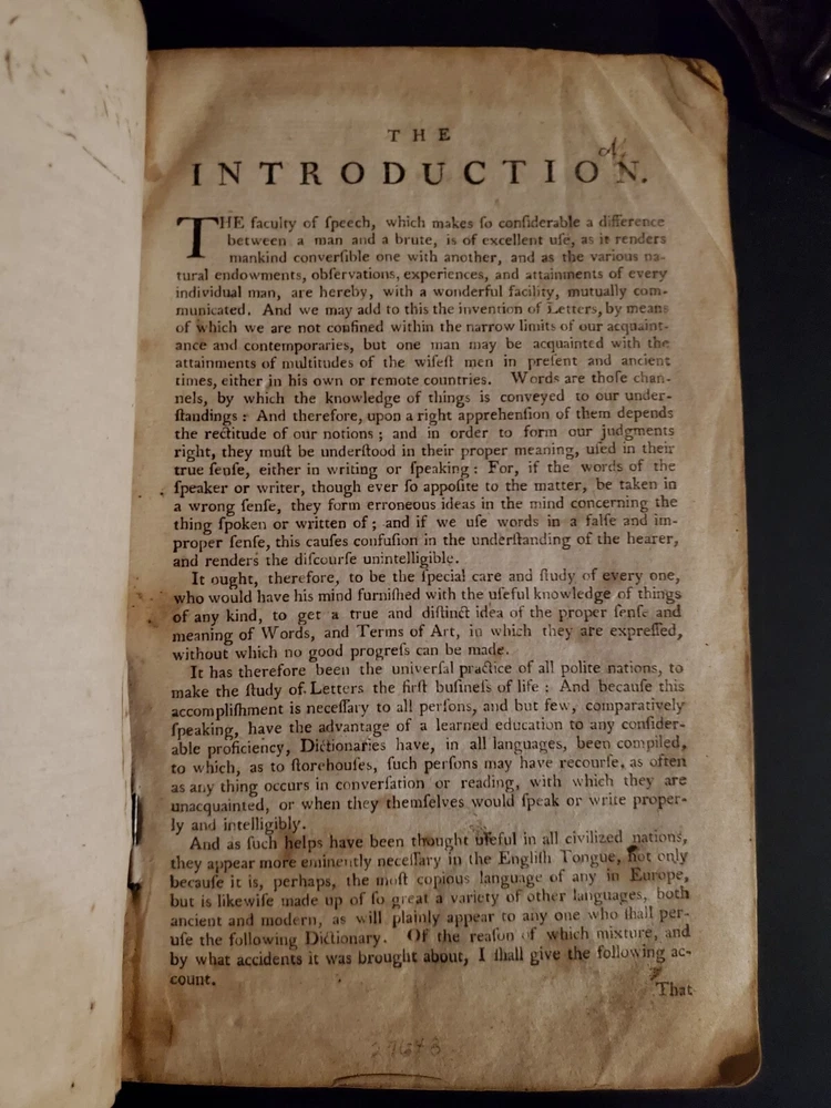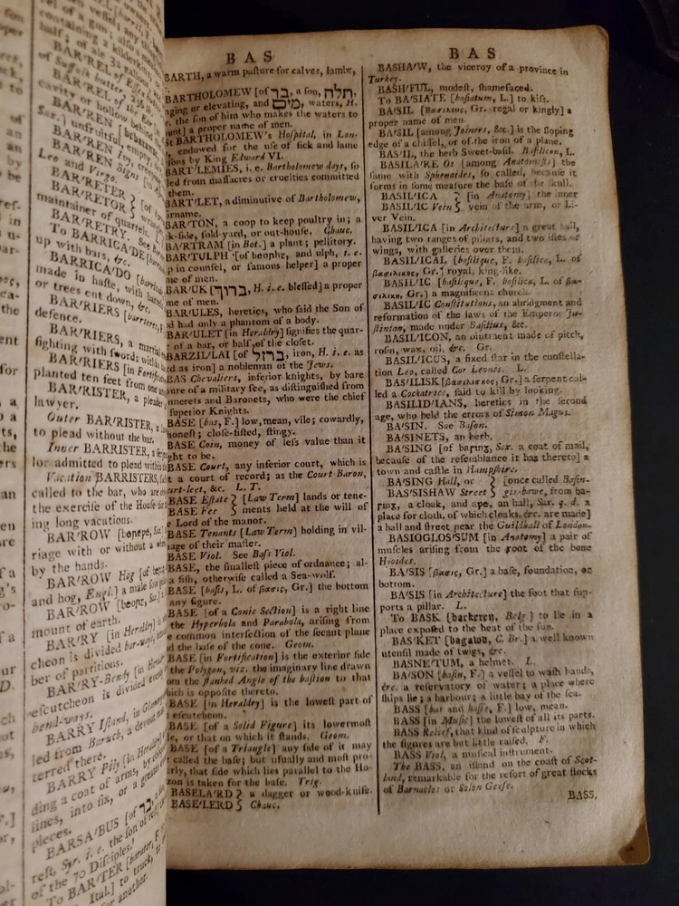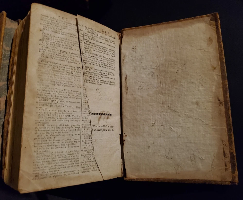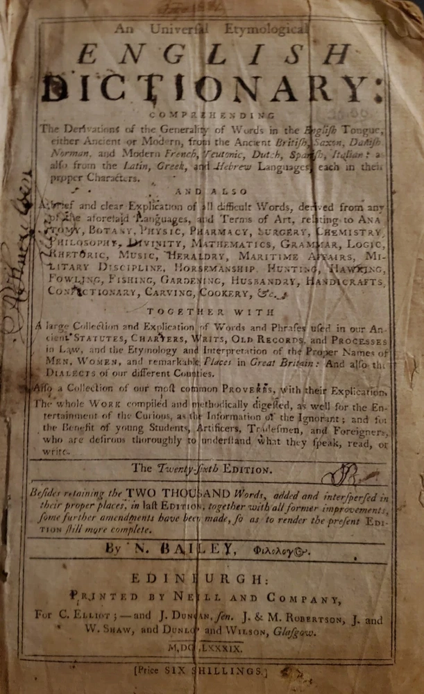 An universal etymological English dictionary: comprehending the derivations of the generality of words in the English tongue, either ancient or modern, from the ancient British, Saxon, Danish, Norman, and modern French, Teutonic, Dutch, Spanish, Italian; as also from the Latin, Greek, and Hebrew languages, each in their proper characters The twenty-sixth edition By Bailey, Nathan Published by printed by Neill and Company, for C. Elliot;--and J. Duncan, sen. J. & M. Robertson, J. and W. Shaw, and Dunlop and Wilson, Glasgow, Edinburgh, 1789 Scarce early edition printed in 1789. Heavy wear to boards, corners and edges. In its original leather binding. Writing on interior front end board. Appears to be missing front end-paper. Last page is torn in half as shown. Missing rear end paper. Overall wear as shown in our photos. SunRise Rare Books - We ship items world-wide, daily. - Each item is carefully stored and protected in our temperature controlled library. We securely pack each item tightly in cardboard boxes to ensure safe delivery. - Returns accepted within 30 days.