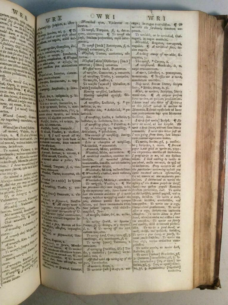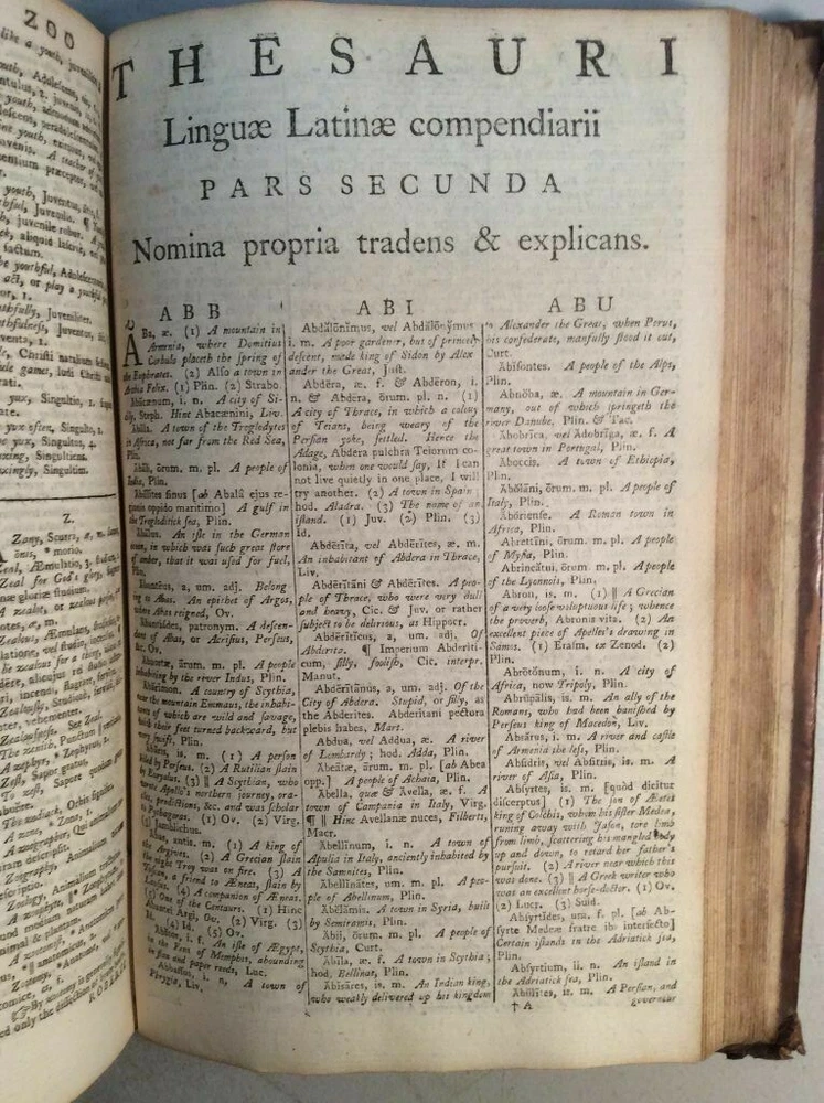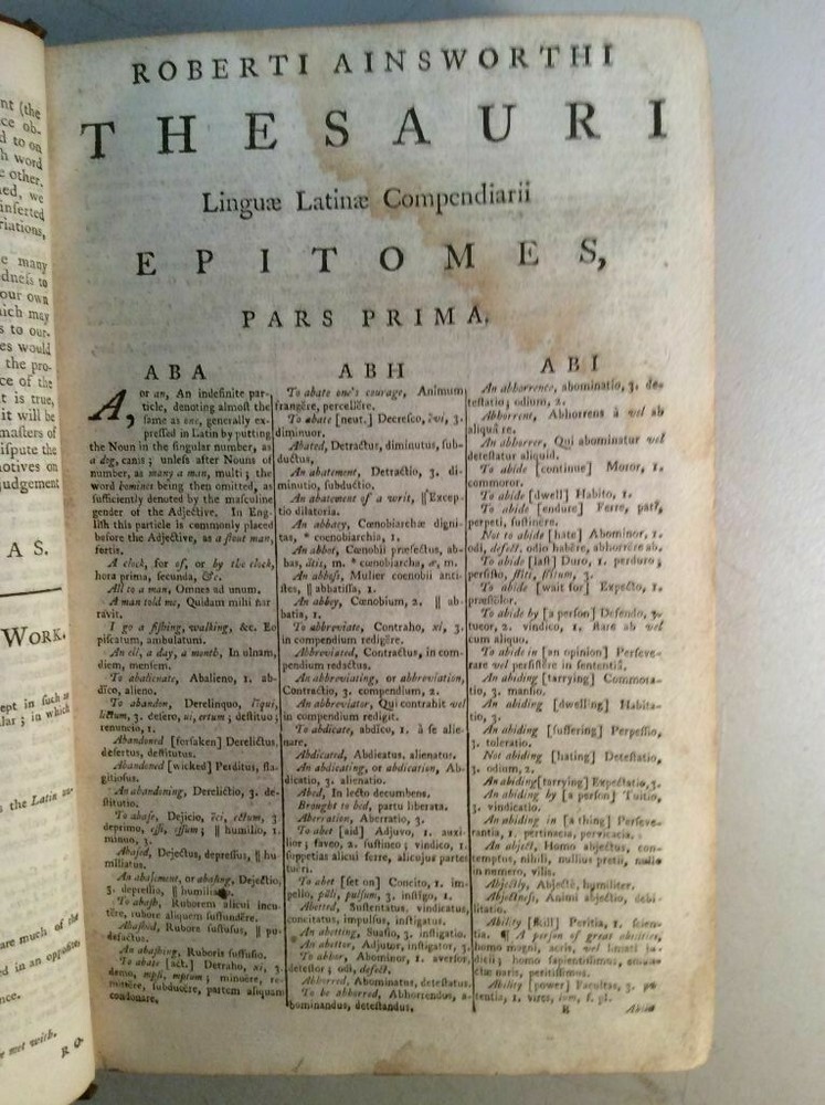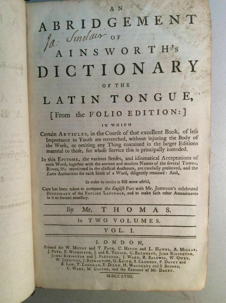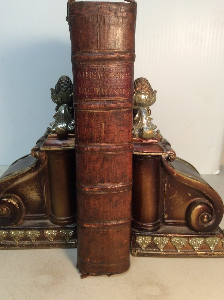 Attention Collectors!!! You are bidding on a super rare hardcover book titled An Abridgement of Ainsworth's Dictionary of the Latin Tongue. fROM THE FOLIO EDITION. bY mR. tHOMAS. Printed in London by W. Mount and T. Page (along with a lenghthy list of other names), 1758. This book is over 260 years old!!!! I conducted a search and could not find another one from this date. This is Volume I only of a two volume set. It includes the Dictionary and at rear of book is the Thesauri. I'm not sure what is in Volume II but the Dictionary and the Thesauri each appear to be complete from A to Z. The book features full leather binding. It measures approximately 9" high and 6" wide and is 2" thick. The spine features five raised bands and gold titling. The covers are securely attached. The leather shows wear, but considering the age of the book, it remains in pretty good condition. Book has 573 pages. All pages are present and tightly bound (the front flyleaf is a little loose). The pages are not numbered but my guess is there has to be easily over 1,000 pages here. A few pages show pages toning/browning/staining but almost all pages are clean and bright with no foxing. Previous owner name written on title page (Ja Sinclair??). The book remains in good condition. This is an extremely rare antique book. This is a terrific book to add to a collection! Great gift idea! (Inventory: 356-C) Track Page Views With Auctiva's FREE Counter