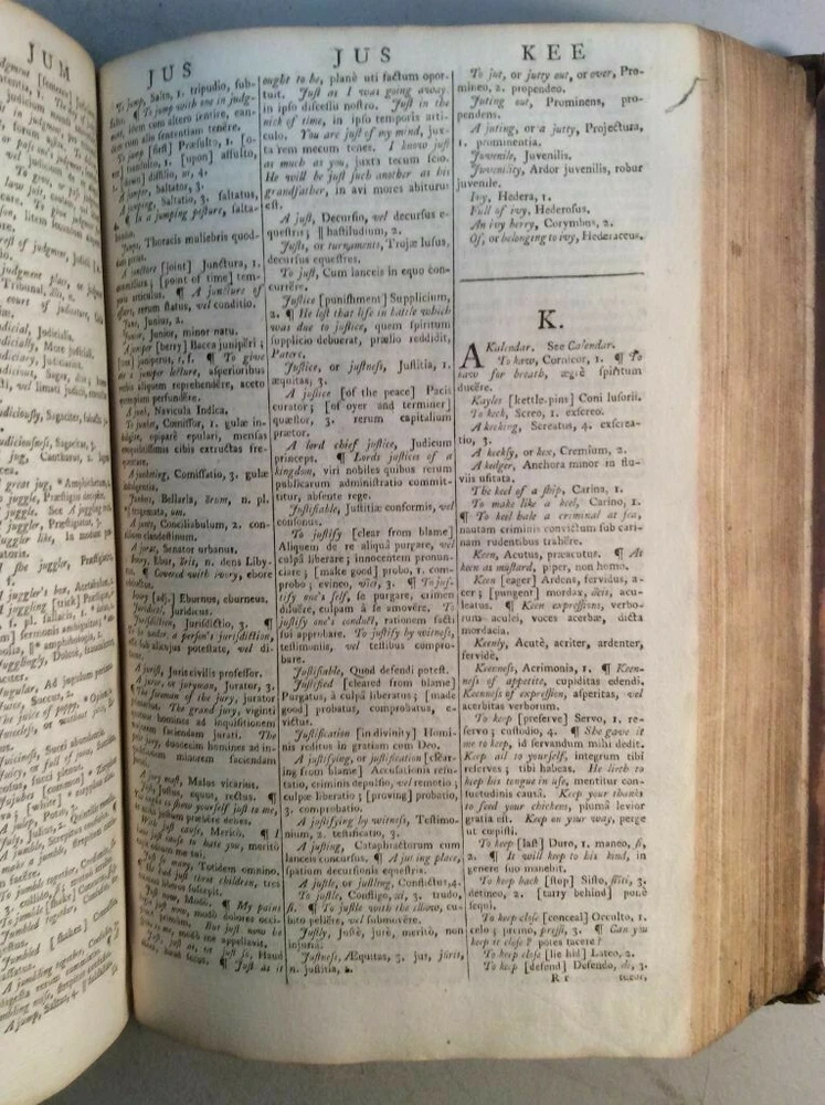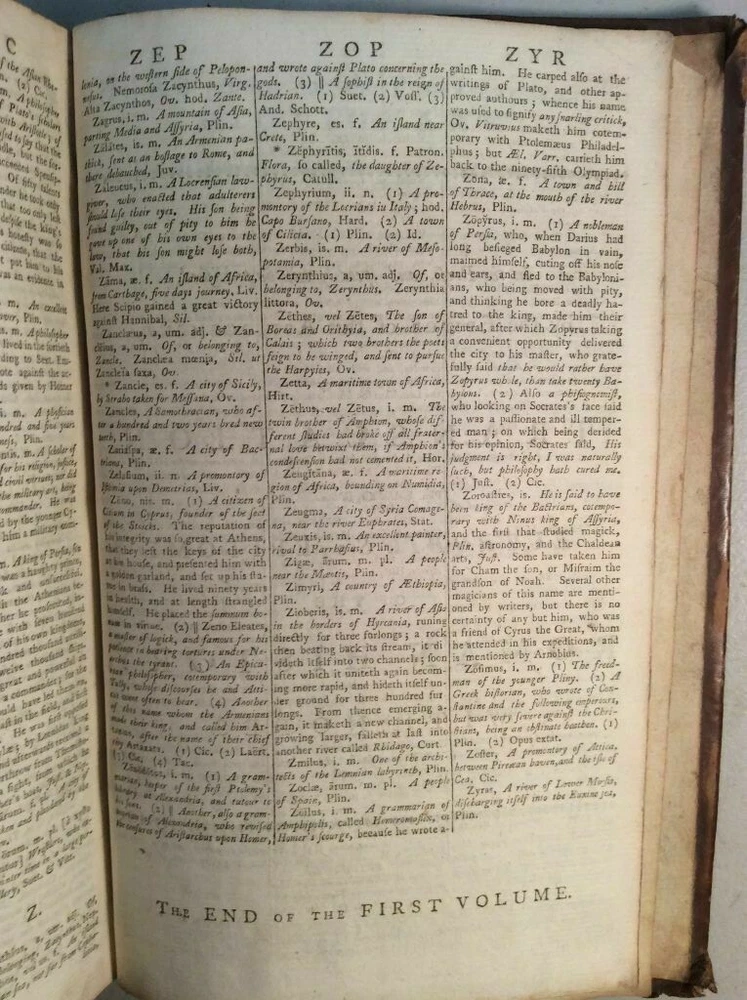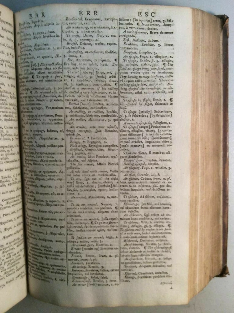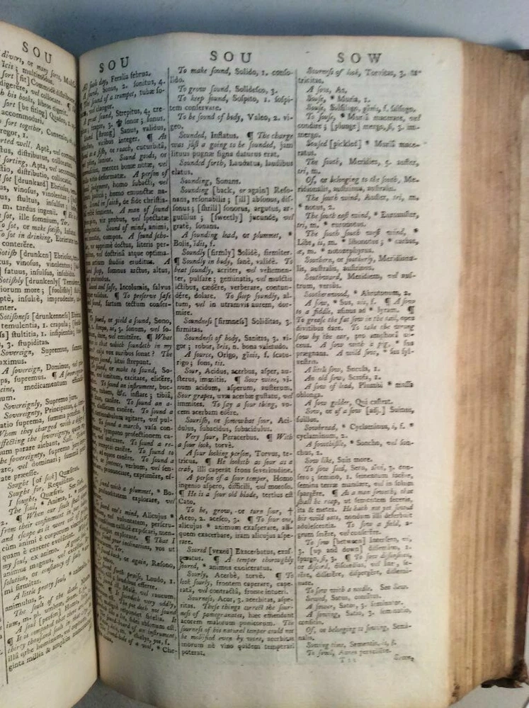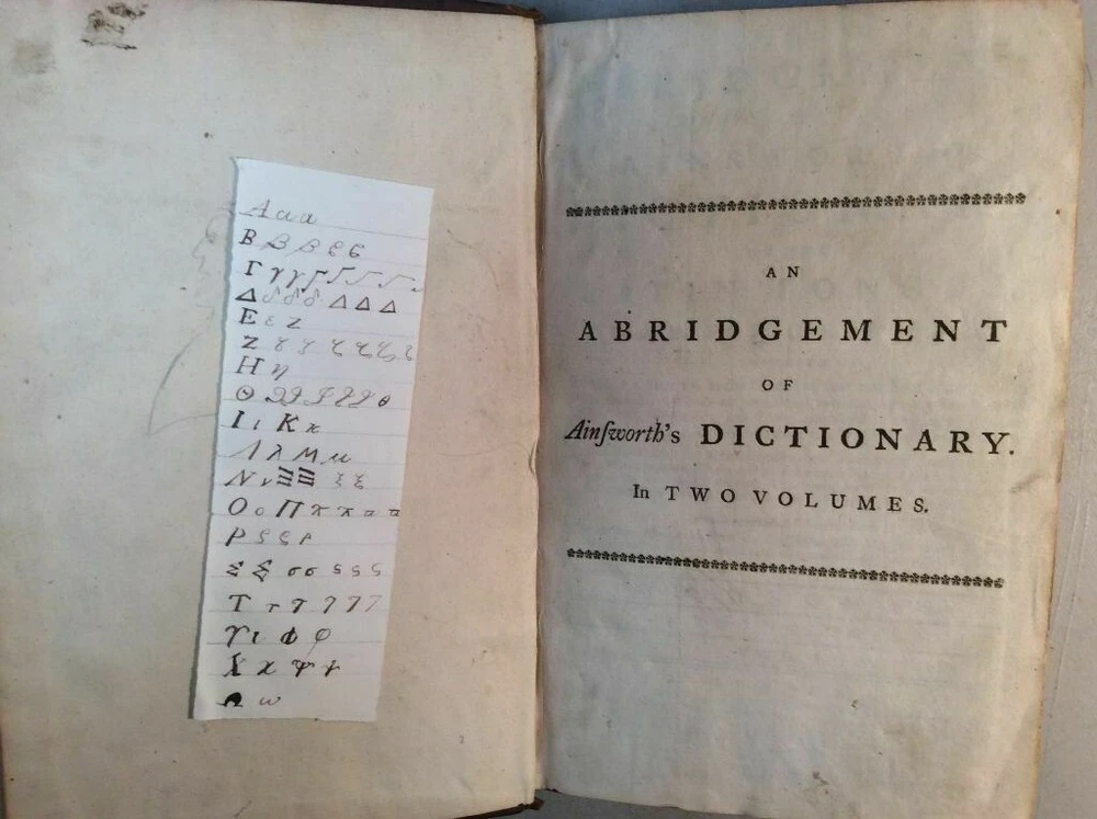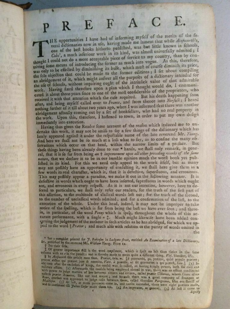Attention Collectors!!! You are bidding on a super rare hardcover book titled An Abridgement of Ainsworth's Dictionary of the Latin Tongue. fROM THE FOLIO EDITION. bY mR. tHOMAS. Printed in London by W. Mount and T. Page (along with a lenghthy list of other names), 1758. This book is over 260 years old!!!! I conducted a search and could not find another one from this date. This is Volume I only of a two volume set. It includes the Dictionary and at rear of book is the Thesauri. I'm not sure what is in Volume II but the Dictionary and the Thesauri each appear to be complete from A to Z. The book features full leather binding. It measures approximately 9" high and 6" wide and is 2" thick. The spine features five raised bands and gold titling. The covers are securely attached. The leather shows wear, but considering the age of the book, it remains in pretty good condition. Book has 573 pages. All pages are present and tightly bound (the front flyleaf is a little loose). The pages are not numbered but my guess is there has to be easily over 1,000 pages here. A few pages show pages toning/browning/staining but almost all pages are clean and bright with no foxing. Previous owner name written on title page (Ja Sinclair??). The book remains in good condition. This is an extremely rare antique book. This is a terrific book to add to a collection! Great gift idea! (Inventory: 356-C) Track Page Views With Auctiva's FREE Counter
