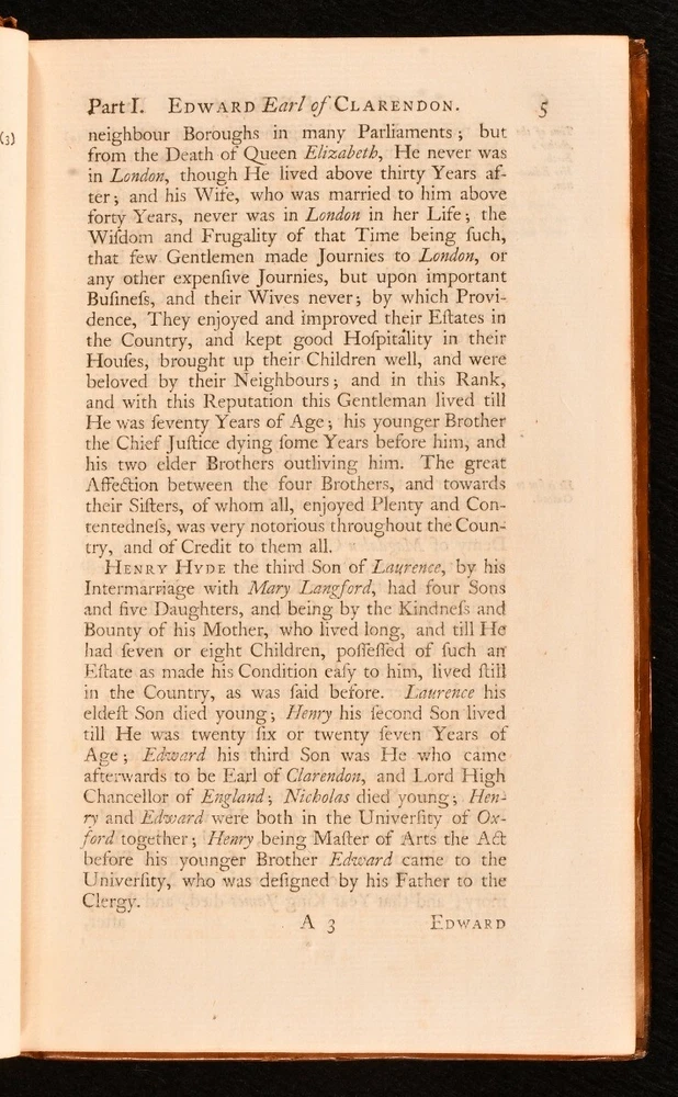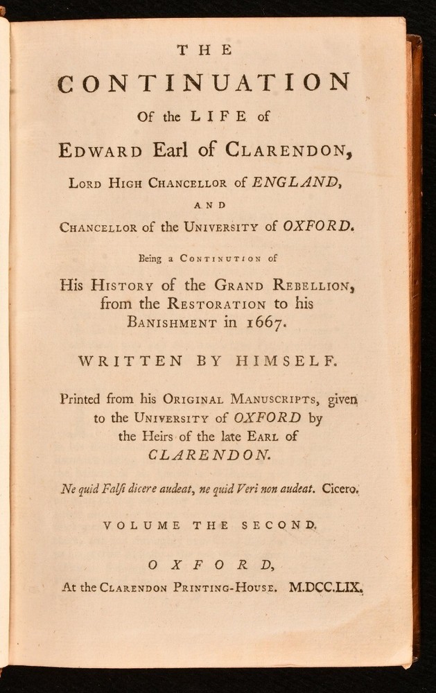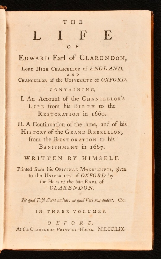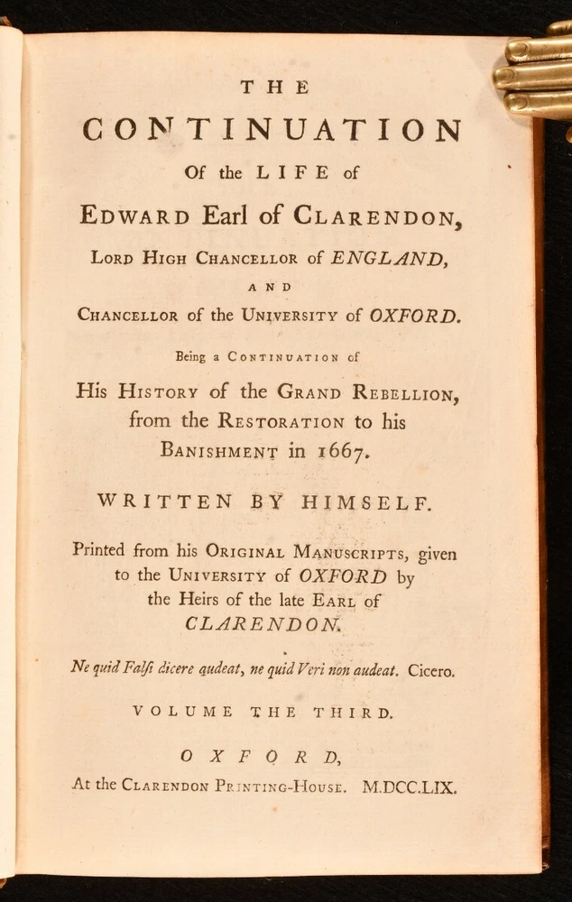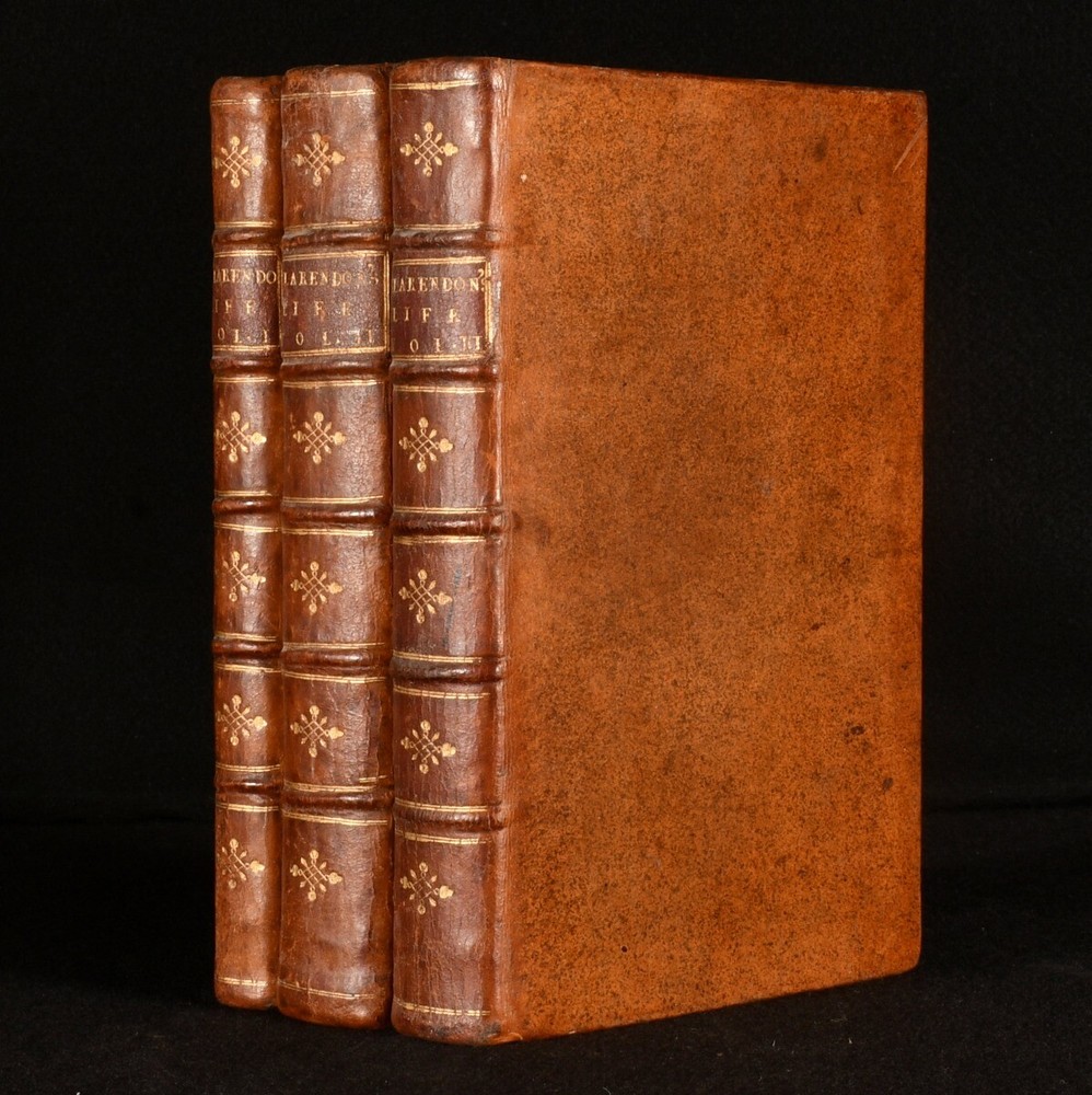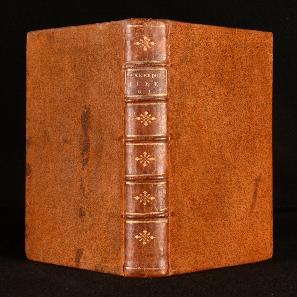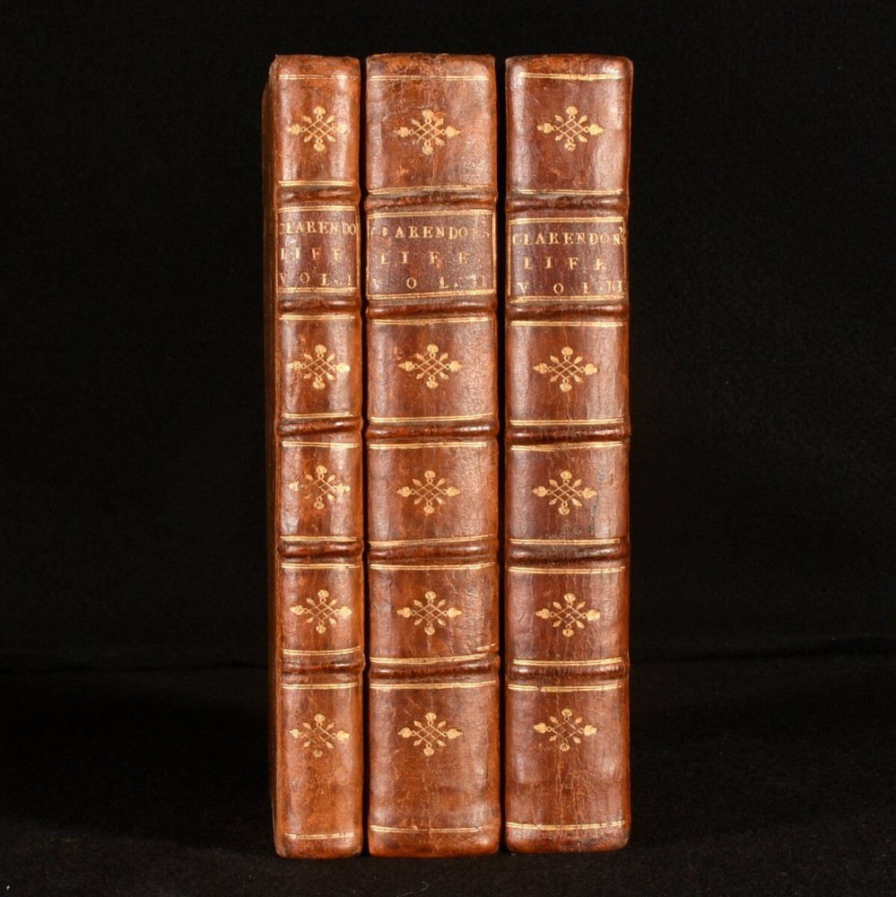 Click here to see our other books! The Life of Edward Earl of Clarendon, Lord High Chancellor of England, and Chancellor of the University of Oxford. Containing, I. An Account of the Chancellor's Life from his Birth to the Restoration in 1660. II. A Continuation of the same, and of his History of the Grand Rebellion, from Restoration to his Banishment in 1667. Edward Earl of Clarendon 1759 Clarendon Printing-House : Oxford 8" by 5" vi, 264, [10]; 539; 541-993, [23]pp. SUMMARY A smart three volume autobiographical work on the Earl of Clarendon. First Edition,Leather Binding,Rebound Overall Condition: Very Good Indeed This book weighs 2 KG when packed UK Postage: £ 3.99 US Postage: £ 29.99 EU Postage : £ 21.99 European Postage: £ 23.99 Asia Postage: £ 37.99 Worldwide Postage: £ 38.99 DESCRIPTION The first edition. Complete in three volumes. Volume one is paginated separately with volumes two and three being paginated continuously. Uniformly bound in full mottled calf with gilt detail to the spine. A rare large paper copy was also issued in the same year, the present group is of the ordinary paper edition. A comprehensive autobiography of Edward Earl of Clarendon. Containing an account of his life from birth to the Restoration in 1660. Followed by his history of the Grand Rebellion, from the Restoration to his banishment in 1667. Printed from his original manuscripts, given to the University of Oxford by the heirs of the late Earl of Clarendon. Edward Hyde, the First Earl of Clarendon was an English statesman, lawyer, and historian, chief advisor to Charles I during the First English Civil War, and Lord Chancellor to Charles II until 1667, when he fell out of favour and was exiled. Volume one has two title pages. Indexes to the rear of volumes one and three. CONDITION Uniformly bound in full calf. Externally, very smart with some rubbing to the edges. Light marks to the boards, slightly heavier to the rear board of volume two. Spines are darkened. Hinges strained but still firm. Offsetting to the paste-downs and free endpapers. Stamp for, 'Cornwell House', to the front free endpapers. Small mark to the front paste-down of volume three. Internally, firmly bound. Pages age-toned but otherwise bright and clean. The odd spot and handling mark throughout. Light offsetting towards the front of the volumes. Overall Condition: Very Good Indeed GLOSSARY OF TERMS Overall Condition (Dustwrapper condition rating is shown after that for the book itself, where a dustwrapper is present) Fine - Very well preserved copy showing very little wear Very Good Indeed - Only one or two minor faults, really a very attractive copy Very Good - Quite a wide term meaning no major faults but probably several smaller ones often expected given the age of the book, but still a respectable copy Good - Meaning not very good. Some more serious faults as will be described in the condition report under 'condition' Good Only - Meaning one or more faults that could really do with repair Fair - As with good only above but with other faults leaving a compromised copy even after repair Poor - Really bad and possibly seriously incomplete. We only sell books in this condition where their rarity or value makes them attractive none the less. Major defects will be described. GUARANTEE We offer a full money back guarantee on our descriptions. Please ask for details and conditions. We prefer PAYPAL. If you pay via PAYPAL we will post the item off the same or the next working day with the postage you have selected. Please note we cannot accept USD cheques