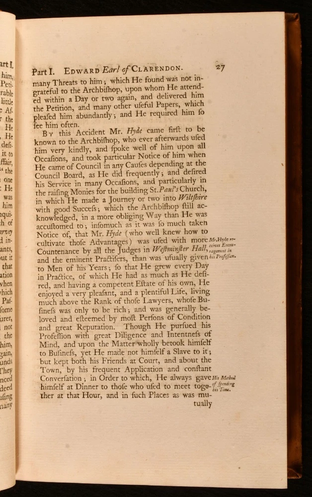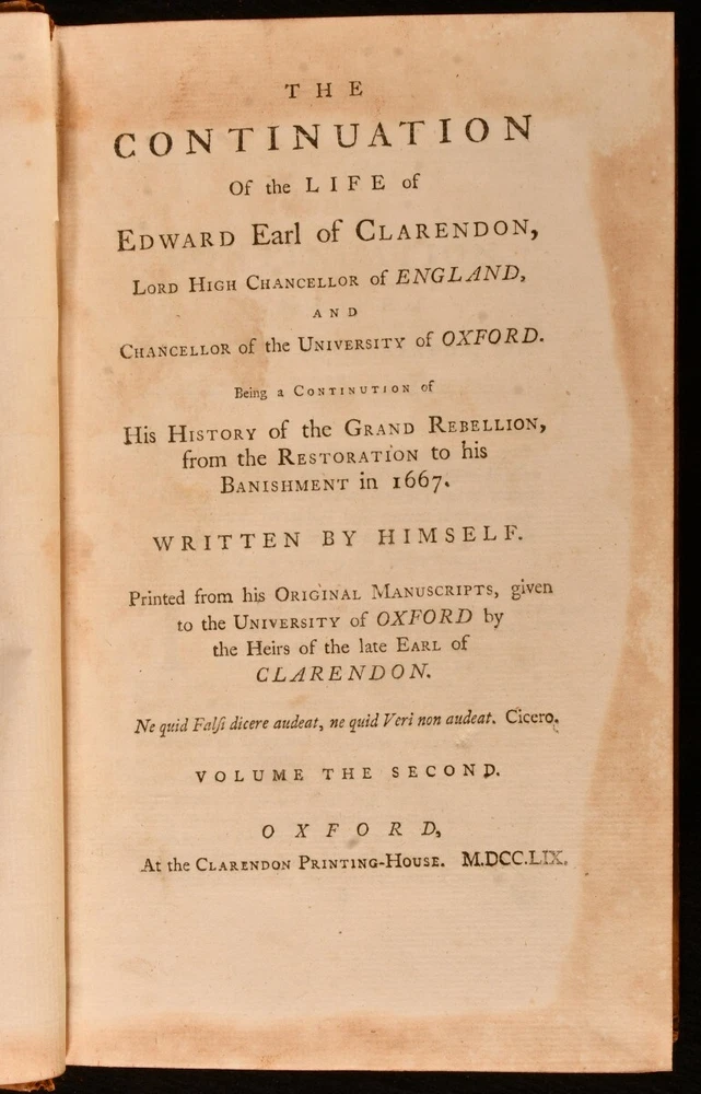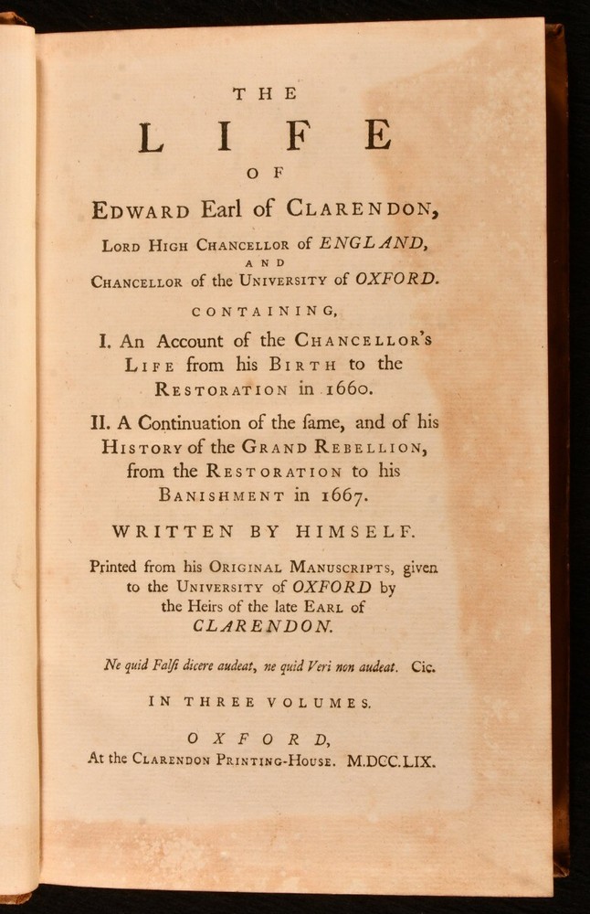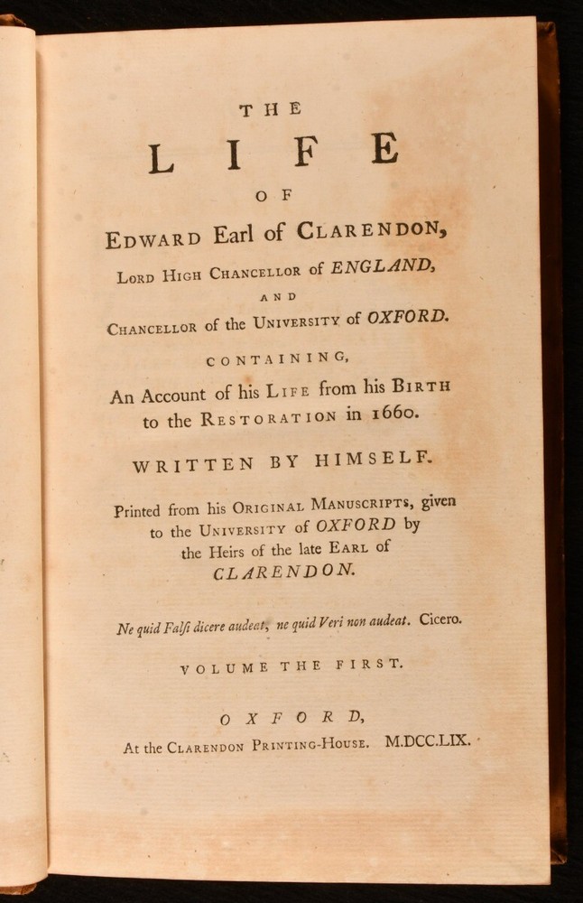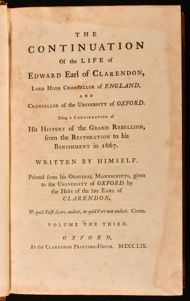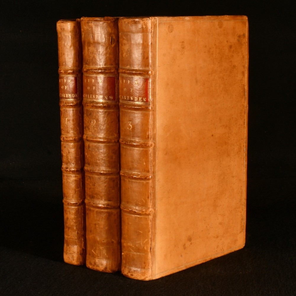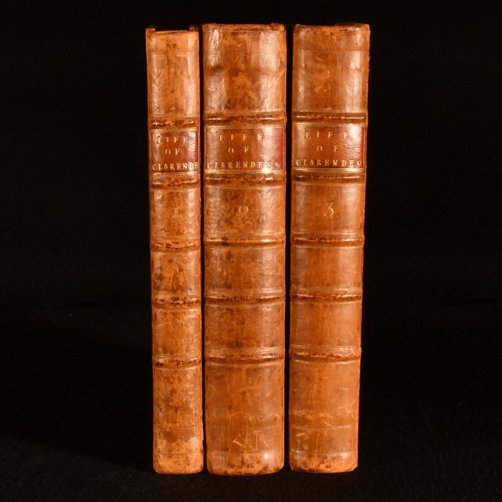 Click here to see our other books! The Life of Edward Earl of Clarendon, Lord High Chancellor of England Edward Hyde, the Earl of Clarendon 1759 Clarendon Printing-House : Oxford 10" by 6.5" i-vi, 1-264 [10]; 539; 993 [22]pp SUMMARY A smart example of the first edition of this account of the life of the Earl of Clarendon. First Edition,Leather Binding Overall Condition: Very Good This book weighs 3 KG when packed UK Postage: £ 3.99 US Postage: £ 36.99 EU Postage : £ 25.99 European Postage: £ 27.99 Asia Postage: £ 47.99 Worldwide Postage: £ 69.99 DESCRIPTION The first edition of this work, complete in three volumes. The ordinary paper edition. A comprehensive autobiography of Edward Earl of Clarendon. Containing an account of his life from birth to the Restoration in 1660. Followed by his history of the Grand Rebellion, from the Restoration to his banishment in 1667. Printed from his original manuscripts, given to the University of Oxford by the heirs of the late Earl of Clarendon. Edward Hyde, the First Earl of Clarendon was an English statesman, lawyer, and historian, chief advisor to Charles I during the First English Civil War, and Lord Chancellor to Charles II until 1667, when he fell out of favour and was exiled. Volumes II and III title pages read 'Continuation of the Life of Edward Earl of Clarendon'. With two title pages to volume I, as called for. Vol I has separate pagination, while that of vols II and III is continuous. ESTC T55769 With the bookplate of baronet Sir John Dashwood King to each front pastedown. CONDITION In full calf bindings. Significant rubbing to back strips, most concentrated to heads and tails. Head of rear joint of volume I, and front joint of volume I strained, but firmly held. Centre of front hinge of volume III strained, but firmly held. Bookplates to front pastedowns. Internally, firmly bound. Pages clean and bright. Overall Condition: Very Good GLOSSARY OF TERMS Overall Condition (Dustwrapper condition rating is shown after that for the book itself, where a dustwrapper is present) Fine - Very well preserved copy showing very little wear Very Good Indeed - Only one or two minor faults, really a very attractive copy Very Good - Quite a wide term meaning no major faults but probably several smaller ones often expected given the age of the book, but still a respectable copy Good - Meaning not very good. Some more serious faults as will be described in the condition report under 'condition' Good Only - Meaning one or more faults that could really do with repair Fair - As with good only above but with other faults leaving a compromised copy even after repair Poor - Really bad and possibly seriously incomplete. We only sell books in this condition where their rarity or value makes them attractive none the less. Major defects will be described. GUARANTEE We offer a full money back guarantee on our descriptions. Please ask for details and conditions. We prefer PAYPAL. If you pay via PAYPAL we will post the item off the same or the next working day with the postage you have selected. Please note we cannot accept USD cheques