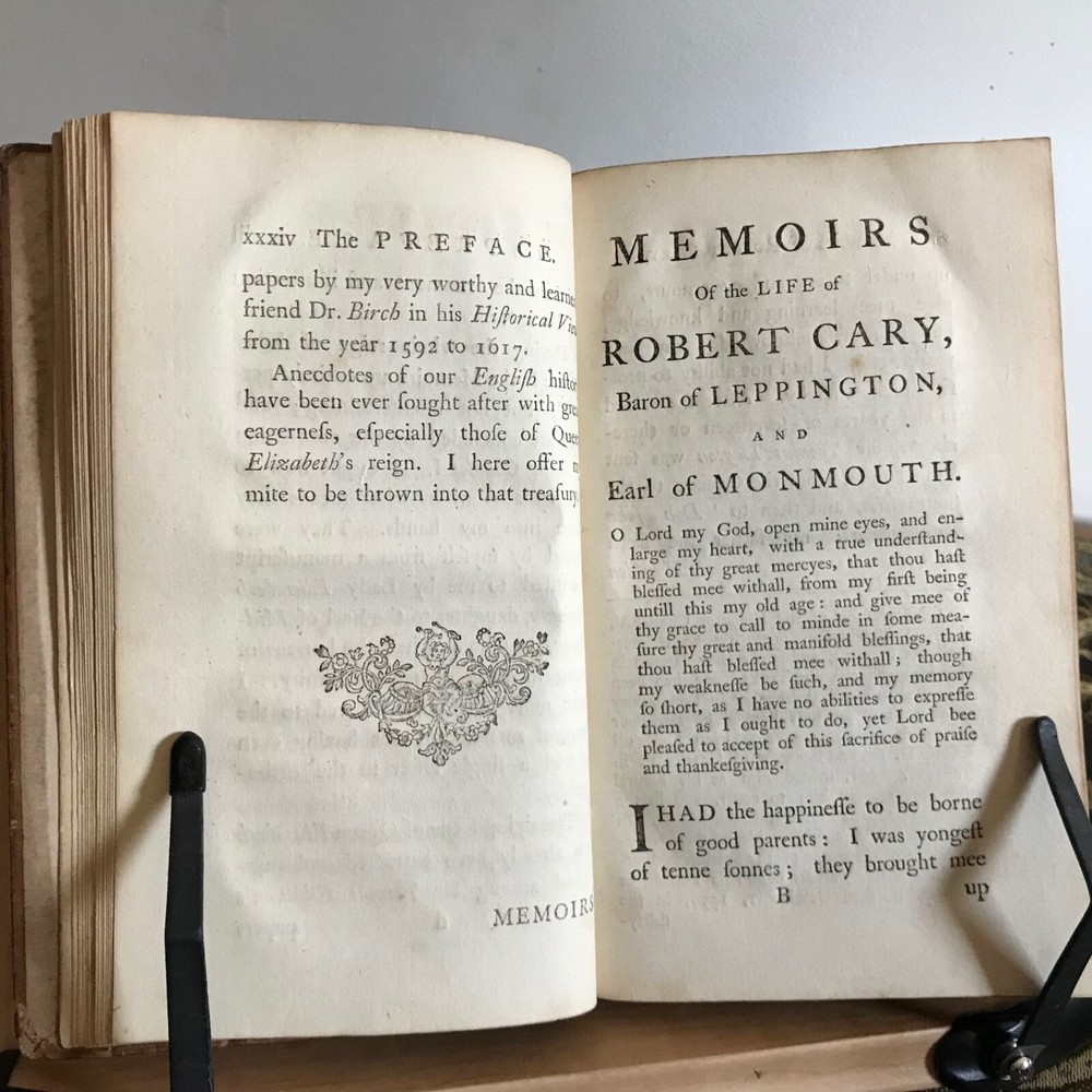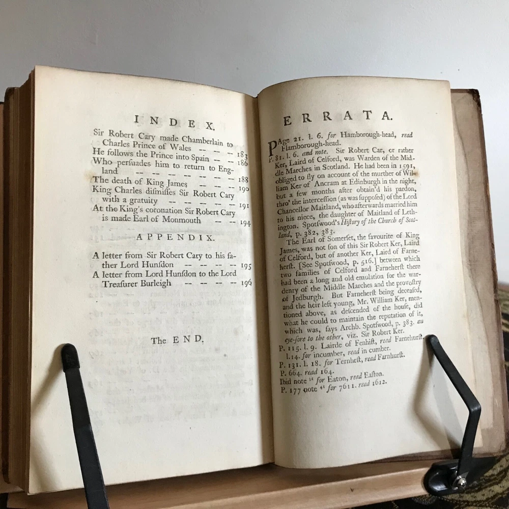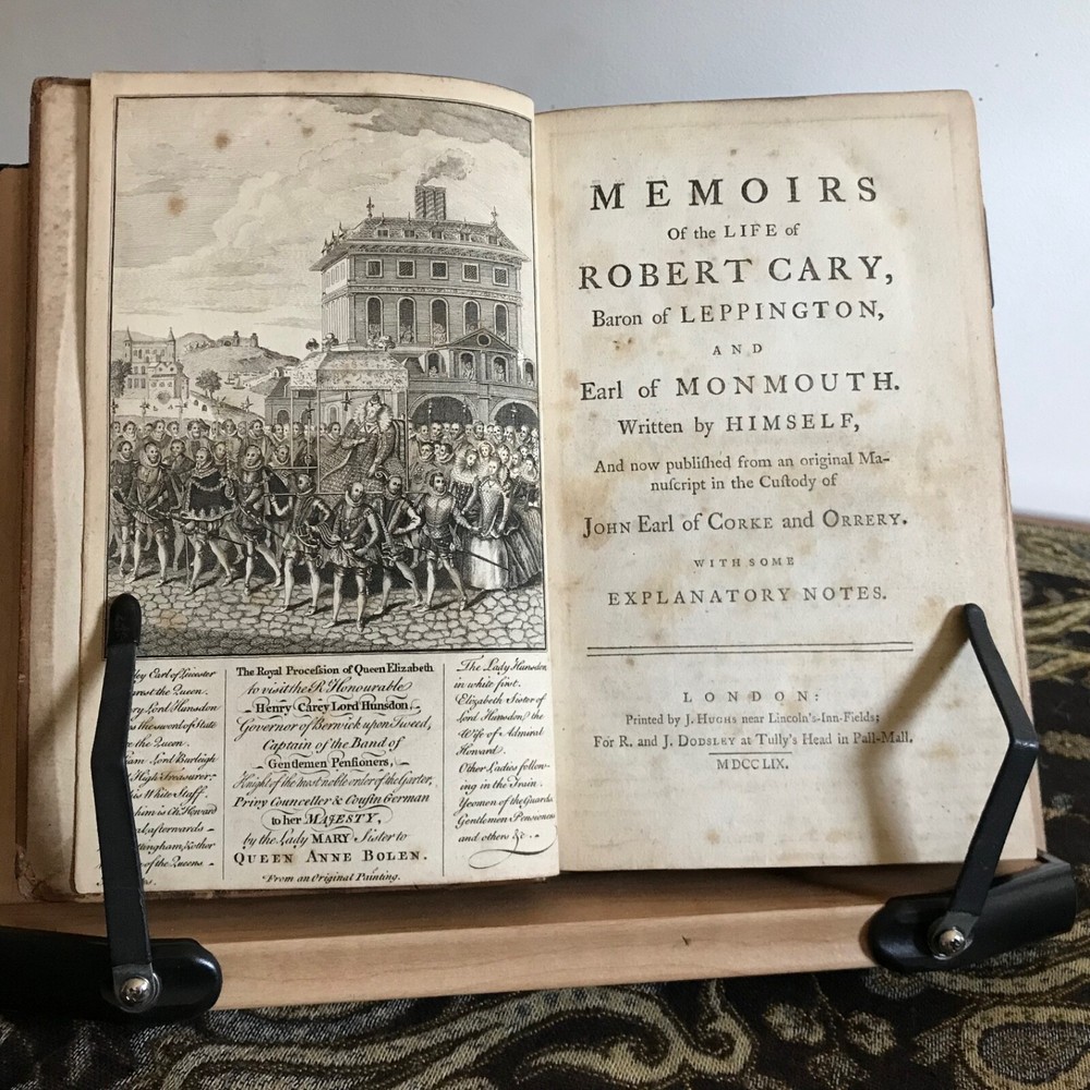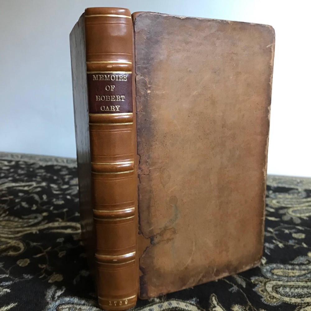 Memoirs Of the Life of Robert Cary, Baron of Leppington, and Earl of Monmouth. Written by Himself, and now published from an Original Manuscript in the Custody of John Earl of Corke and Orrery with some Explanatory Notes. Robert Carey, Printed by J. Hughs near Lincoln’s-Inn-Fields, London,1759, frontispiece, 200 pp plus index and errata, full leather, 8.25 x 5.5”, 8vo. In good condition. Spine has been nicely redone in recent years. Dated with gilt work, five raised bands. Original boards have been nicely incorporated into new spine. Original boards exhibit wear along edges and corners.. scuffing and light abrasions to surface. End papers have been kept in their original state. Interior has minor toning with light foxing. Free of known marginalia. Binding tight and secure. Please see photos. Great frontispiece of Elizabeth I in Royal Procession with her court. Robert Carey, 1st Earl of Monmouth was an English nobleman and courtier. He was the youngest son of Henry Carey, 1st Baron Hunsdon, chamberlain and first cousin of Queen Elizabeth I, and Anne Morgan, daughter of Sir Thomas Morgan and Anne Whitney. COLH1759CHJL-variant