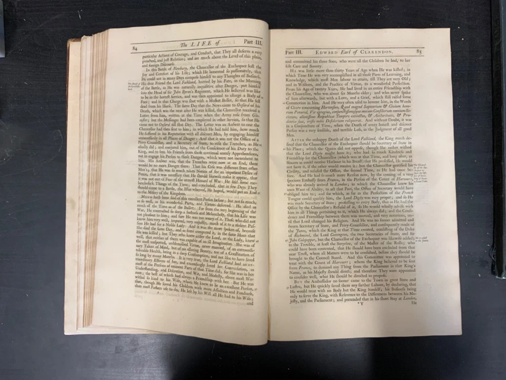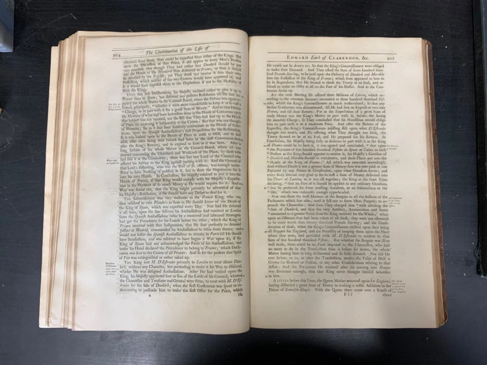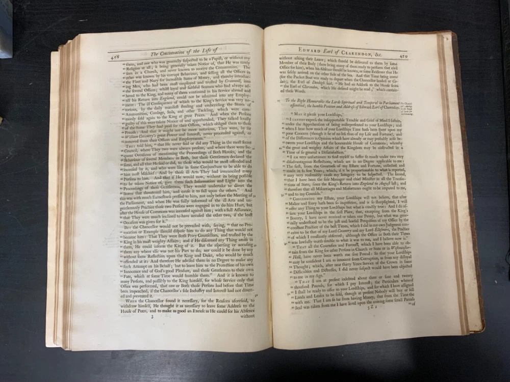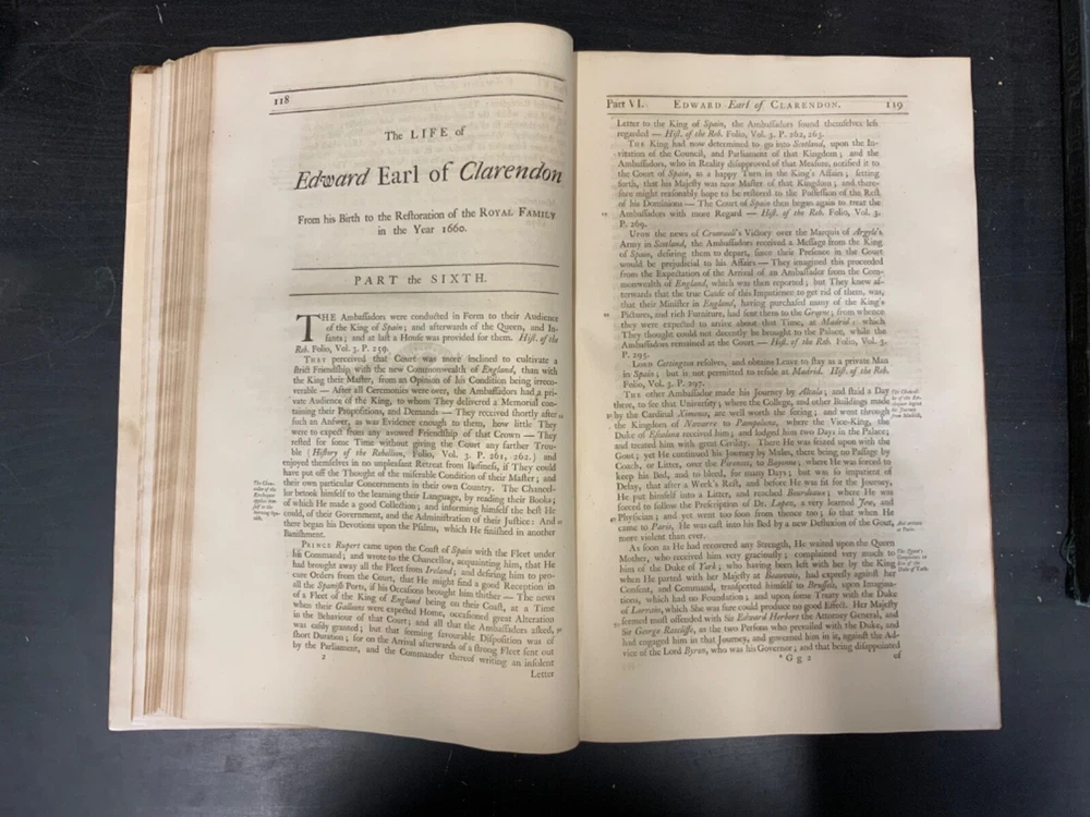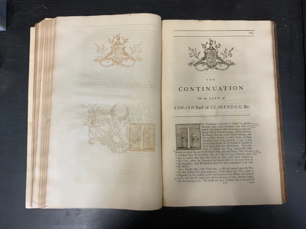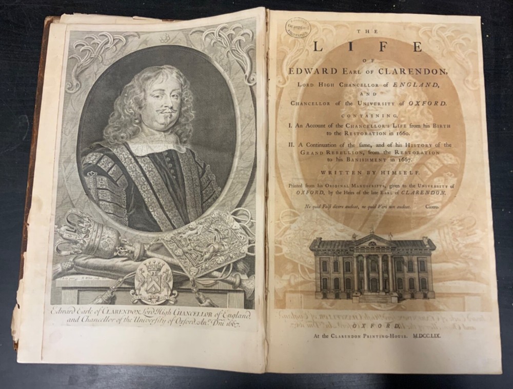 The Life of Edward Earl of Clarendon, Lord High Chancellor of England, and Chancellor of the University of Oxford. Containing, I. An Account of the Chancellor's Life from his Birth to the Restoration in 1660. II. A Continuation of the same, and of his History of the Grand Rebellion, from the Restoration to his Banishment in 1667, Written by Himself, Printed from his Original Manuscripts, given to the University of Oxford, by the Heirs of the late Earl of Clarendon, Clarendon Printing-House, Oxford, 1759, leather, 10 x 16", 4to Poor condition/as is. Wear and chipping to boards with redrot. Tips are bumped with exposed boards. Edges are scuffed. Boards are completely detached from binding. Chipping and cracking to spine; title in gilt is still legible. Endpapers up to frontispiece have come loose from binding. Frontispiece opposite title page. Toning, age-staining, tea-staining, and foxing throughout textblock. Binding is fragile. Please see photos and ask any questions prior to purchase. Edward Hyde, 1st Earl of Clarendon (18 February 1609 - 9 December 1674) was an English statesman, lawyer, diplomat, and historian who served as chief advisor to Charles I during the First English Civil War, and Lord Chancellor to Charles II from 1660 to 1667. Hyde largely avoided involvement in the political disputes of the 1630s until elected to the long Parliament in November 1640. Like many moderates, he felt that attempts by Charles I to rule without Parliament had gone too far, but by 1642, felt Parliament's leaders were, in turn, seeking too much power. A devout believer in an Episcopalian Church of England, his opposition to Puritan attempts to reform it drove much of his policy over the next two decades. He joined Charles in York shortly before the First English Civil War began in August 1642, and initially served as his senior political advisor. However, as the war turned against the Royalists, his rejection of attempts to build alliances with Scots Covenanters or Irish Catholics lead to a decline in his influence. FORN-SHELF-0522-XX-2408-JC1135