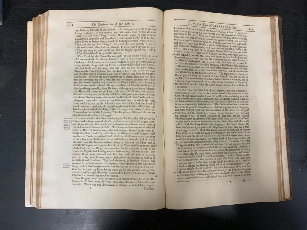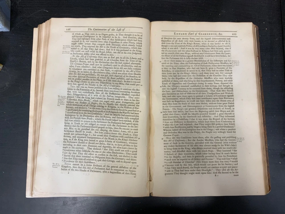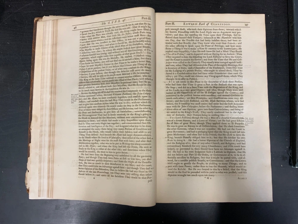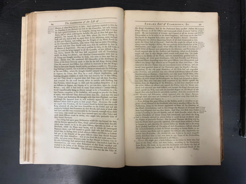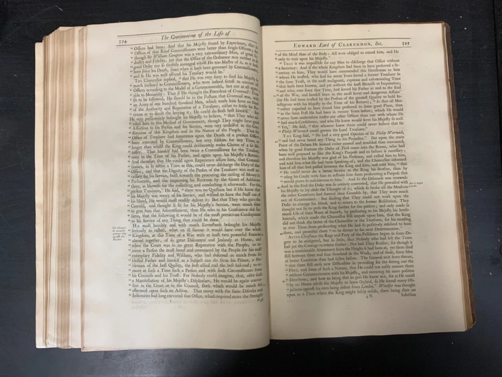 The Life of Edward Earl of Clarendon, Lord High Chancellor of England, and Chancellor of the University of Oxford. Containing, I. An Account of the Chancellor's Life from his Birth to the Restoration in 1660. II. A Continuation of the same, and of his History of the Grand Rebellion, from the Restoration to his Banishment in 1667, Written by Himself, Printed from his Original Manuscripts, given to the University of Oxford, by the Heirs of the late Earl of Clarendon, Clarendon Printing-House, Oxford, 1759, leather, 10 x 16", 4to Poor condition/as is. Wear and chipping to boards with redrot. Tips are bumped with exposed boards. Edges are scuffed. Boards are completely detached from binding. Chipping and cracking to spine; title in gilt is still legible. Endpapers up to frontispiece have come loose from binding. Frontispiece opposite title page. Toning, age-staining, tea-staining, and foxing throughout textblock. Binding is fragile. Please see photos and ask any questions prior to purchase. Edward Hyde, 1st Earl of Clarendon (18 February 1609 - 9 December 1674) was an English statesman, lawyer, diplomat, and historian who served as chief advisor to Charles I during the First English Civil War, and Lord Chancellor to Charles II from 1660 to 1667. Hyde largely avoided involvement in the political disputes of the 1630s until elected to the long Parliament in November 1640. Like many moderates, he felt that attempts by Charles I to rule without Parliament had gone too far, but by 1642, felt Parliament's leaders were, in turn, seeking too much power. A devout believer in an Episcopalian Church of England, his opposition to Puritan attempts to reform it drove much of his policy over the next two decades. He joined Charles in York shortly before the First English Civil War began in August 1642, and initially served as his senior political advisor. However, as the war turned against the Royalists, his rejection of attempts to build alliances with Scots Covenanters or Irish Catholics lead to a decline in his influence. FORN-SHELF-0522-XX-2408-JC1135