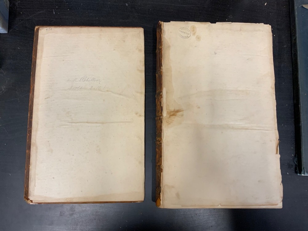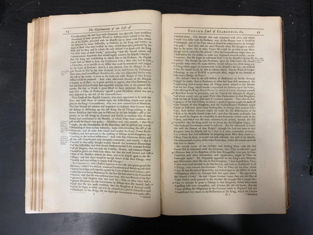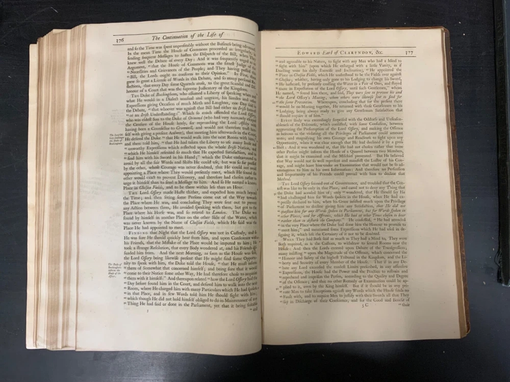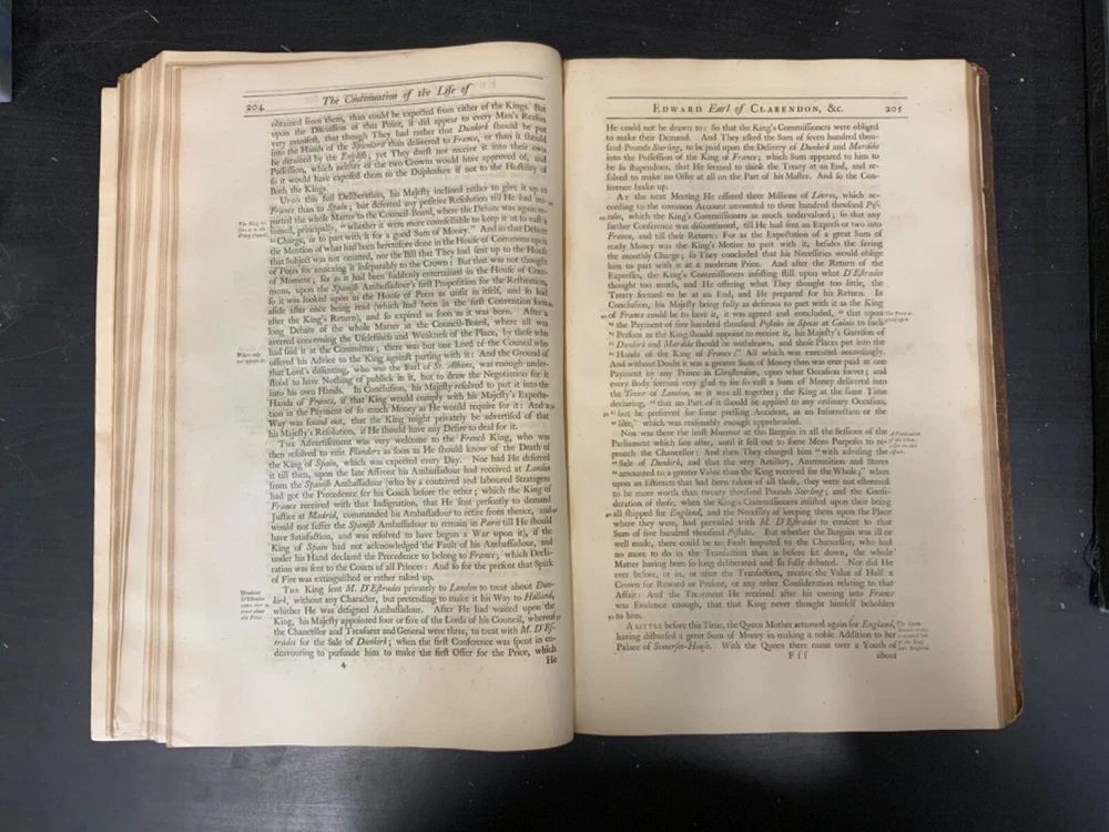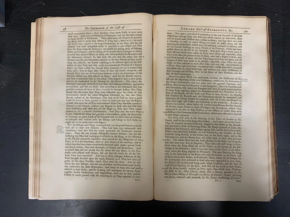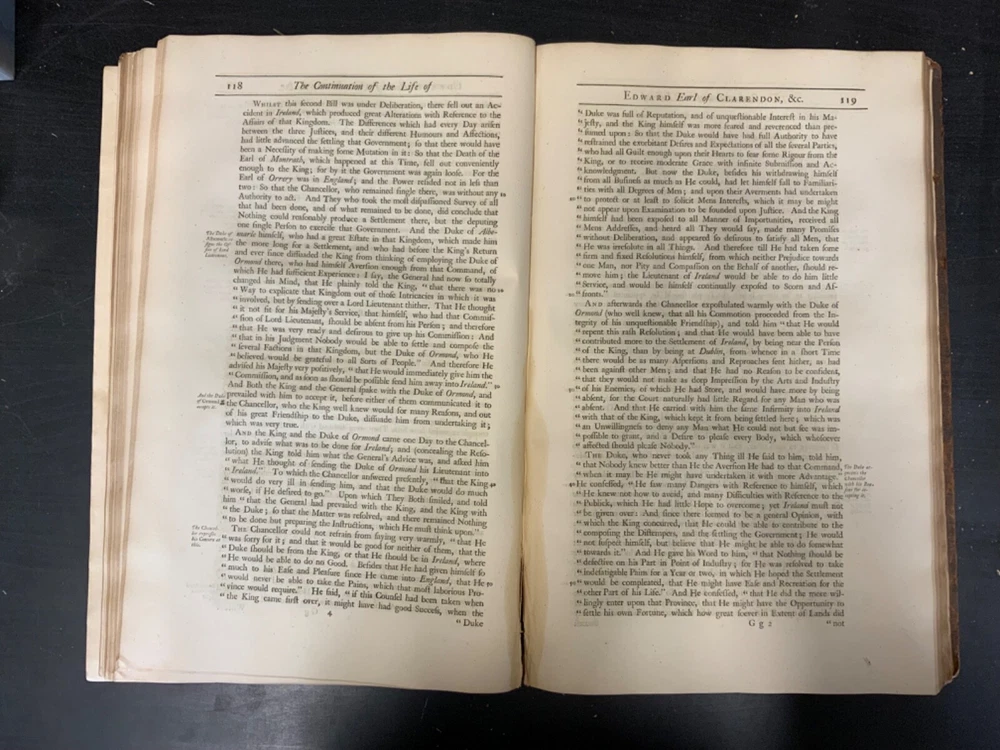 The Life of Edward Earl of Clarendon, Lord High Chancellor of England, and Chancellor of the University of Oxford. Containing, I. An Account of the Chancellor's Life from his Birth to the Restoration in 1660. II. A Continuation of the same, and of his History of the Grand Rebellion, from the Restoration to his Banishment in 1667, Written by Himself, Printed from his Original Manuscripts, given to the University of Oxford, by the Heirs of the late Earl of Clarendon, Clarendon Printing-House, Oxford, 1759, leather, 10 x 16", 4to Poor condition/as is. Wear and chipping to boards with redrot. Tips are bumped with exposed boards. Edges are scuffed. Boards are completely detached from binding. Chipping and cracking to spine; title in gilt is still legible. Endpapers up to frontispiece have come loose from binding. Frontispiece opposite title page. Toning, age-staining, tea-staining, and foxing throughout textblock. Binding is fragile. Please see photos and ask any questions prior to purchase. Edward Hyde, 1st Earl of Clarendon (18 February 1609 - 9 December 1674) was an English statesman, lawyer, diplomat, and historian who served as chief advisor to Charles I during the First English Civil War, and Lord Chancellor to Charles II from 1660 to 1667. Hyde largely avoided involvement in the political disputes of the 1630s until elected to the long Parliament in November 1640. Like many moderates, he felt that attempts by Charles I to rule without Parliament had gone too far, but by 1642, felt Parliament's leaders were, in turn, seeking too much power. A devout believer in an Episcopalian Church of England, his opposition to Puritan attempts to reform it drove much of his policy over the next two decades. He joined Charles in York shortly before the First English Civil War began in August 1642, and initially served as his senior political advisor. However, as the war turned against the Royalists, his rejection of attempts to build alliances with Scots Covenanters or Irish Catholics lead to a decline in his influence. FORN-SHELF-0522-XX-2408-JC1135
