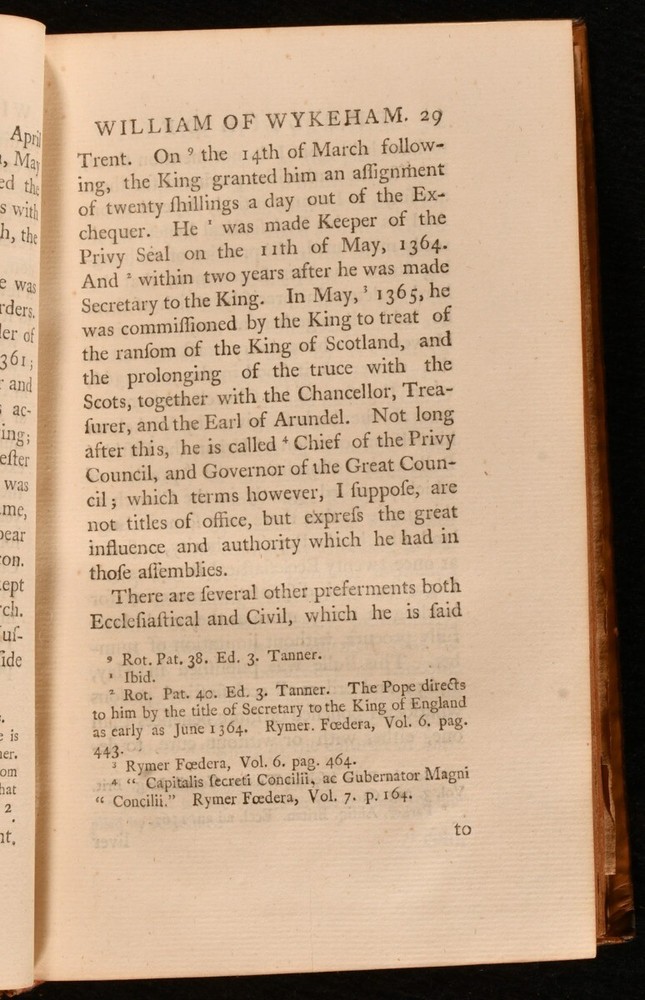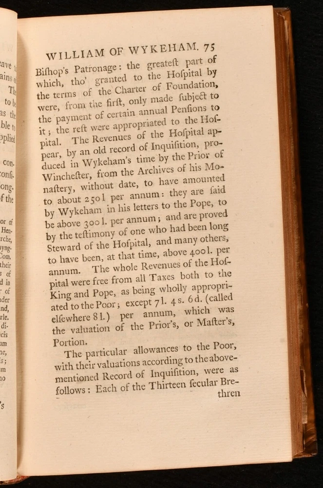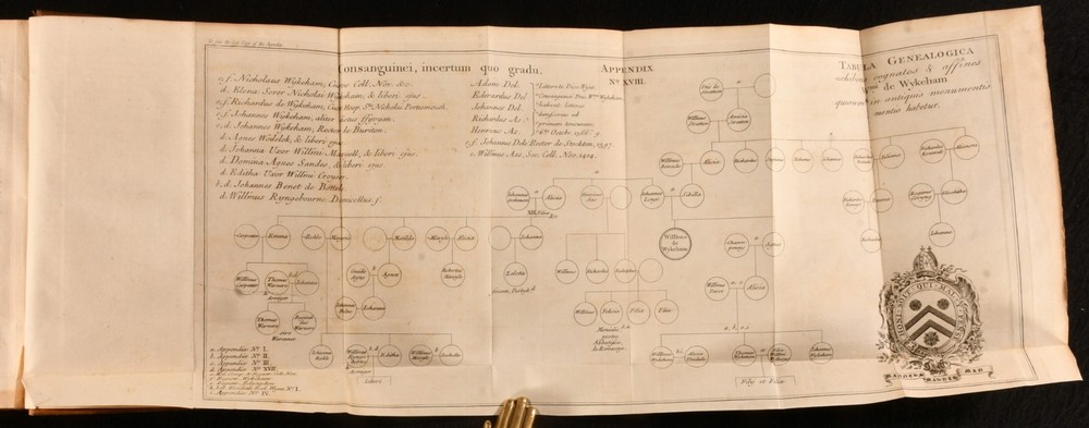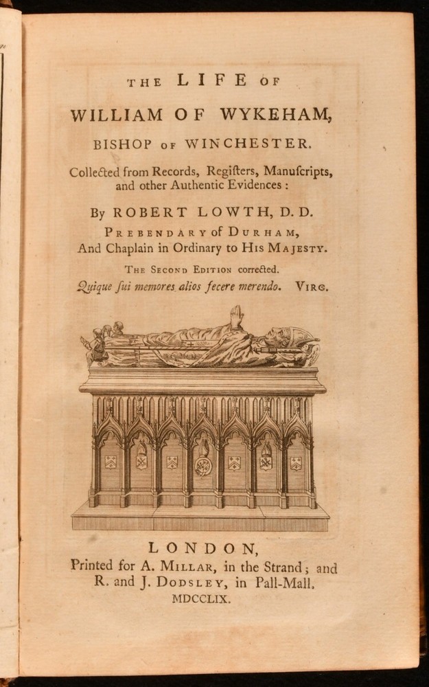 Click here to see our other books! The Life of William of Wykeham, Bishop of Winchester Robert Lowth 1759 A. Millar, R. and J. Dodsley : London 8.5" by 5.5" xxxiv, 1-357, i-liv pp SUMMARY The scarce second edition of Robert Lowth's account of the life of fourteenth century Bishop William of Wykeham. Fine Binding,Folding Plates,Illustrated,Leather Binding,Scarce Overall Condition: Very Good This book weighs 1 KG when packed UK Postage: £ 3.99 US Postage: £ 22.99 EU Postage : £ 16.99 European Postage: £ 17.99 Asia Postage: £ 22.99 Worldwide Postage: £ 28.99 DESCRIPTION The scarce corrected second edition of this work, published the year after the first. Illustrated with a frontispiece, vignette title page, one further plate, and a folding genealogical table to the rear. Collated, complete. Anglican Bishop Robert Lowth utilises records, records and manuscripts to provide an account of the life and career of the fourteenth century Catholic Bishop, a Chancellor of England who founded Winchester College in 1382. ESTC reference T113064 With the stamp of Cornwell House to the front free endpaper, alongside a contemporary inscription remarking on the topics covered at page 107. A bright copy of this scarce early edition of Lowth's work. CONDITION In a full calf binding, with gilt detailing to back strip. Joints starting, with boards holding firm. Inscription and stamp to front free endpaper. Internally, firmly bound. Pages clean and bright. Overall Condition: Very Good GLOSSARY OF TERMS Overall Condition (Dustwrapper condition rating is shown after that for the book itself, where a dustwrapper is present) Fine - Very well preserved copy showing very little wear Very Good Indeed - Only one or two minor faults, really a very attractive copy Very Good - Quite a wide term meaning no major faults but probably several smaller ones often expected given the age of the book, but still a respectable copy Good - Meaning not very good. Some more serious faults as will be described in the condition report under 'condition' Good Only - Meaning one or more faults that could really do with repair Fair - As with good only above but with other faults leaving a compromised copy even after repair Poor - Really bad and possibly seriously incomplete. We only sell books in this condition where their rarity or value makes them attractive none the less. Major defects will be described. GUARANTEE We offer a full money back guarantee on our descriptions. Please ask for details and conditions. We prefer PAYPAL. If you pay via PAYPAL we will post the item off the same or the next working day with the postage you have selected. Please note we cannot accept USD cheques