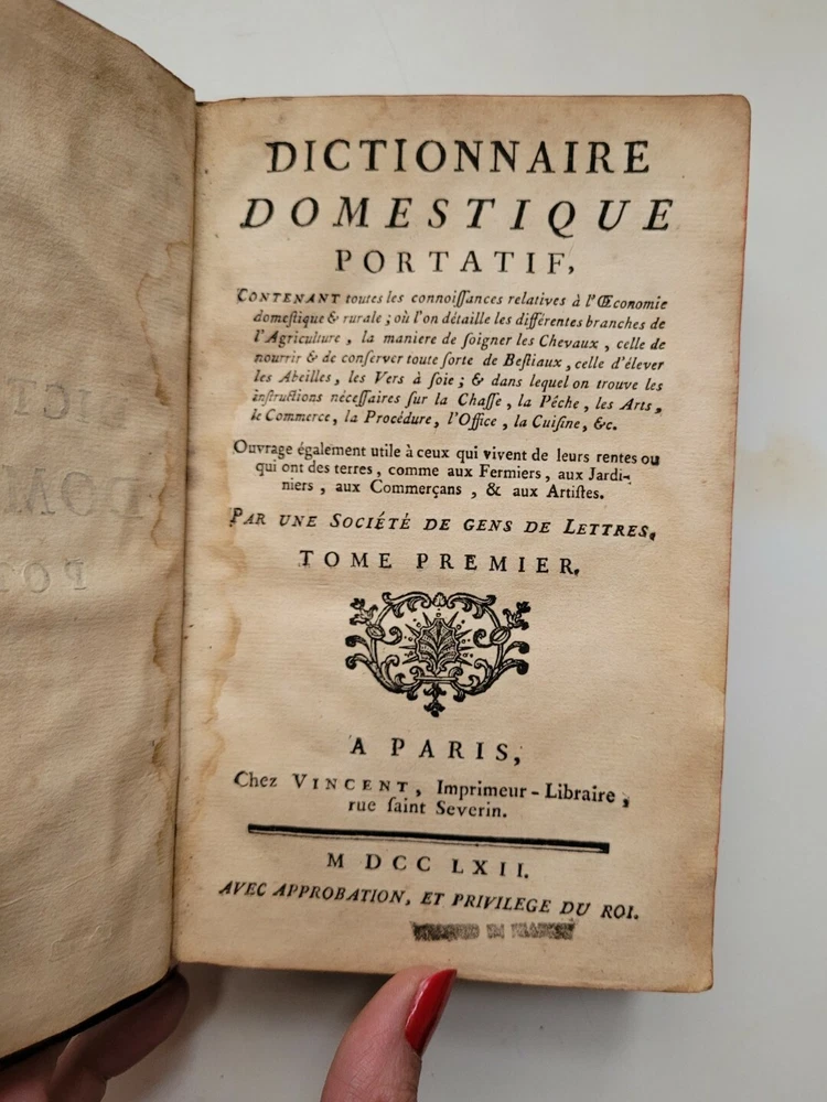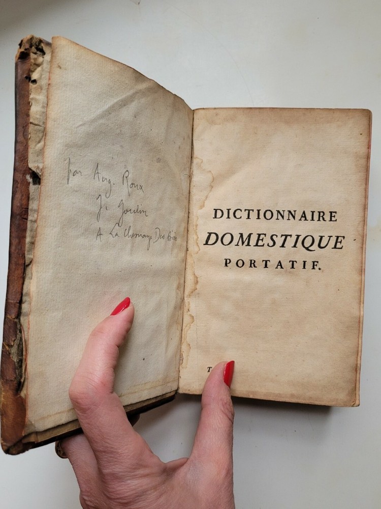 Dictionnaire Domestique Portatif 1762 Leather TOME PREMIER 1ST VOLUME in French. French portable dictionary. Paris Condition: fair. Covers firmly attached. Writing in front. Pages rather toned. Lots of handling wear and age. Binding is decent and secure. Let the photos be your guide. Lovingly packed and shipped with USPS Media Mail and insured.