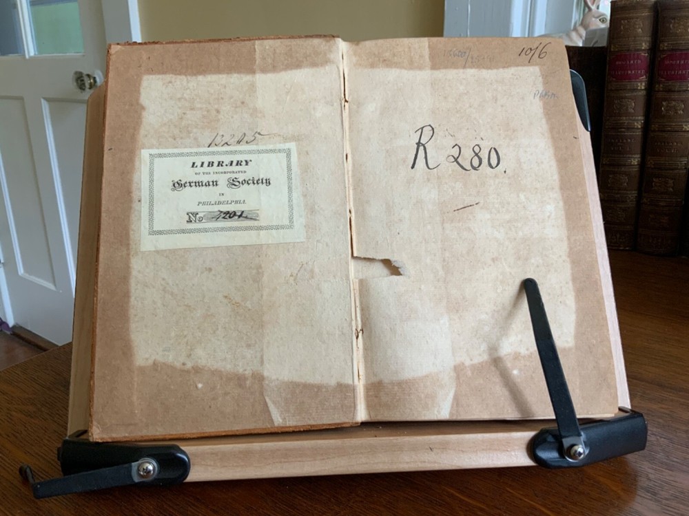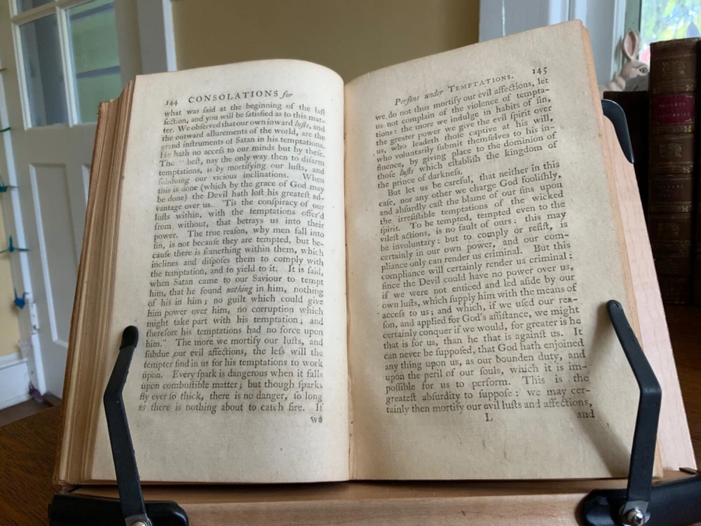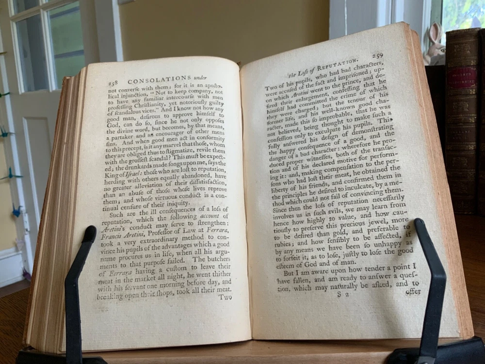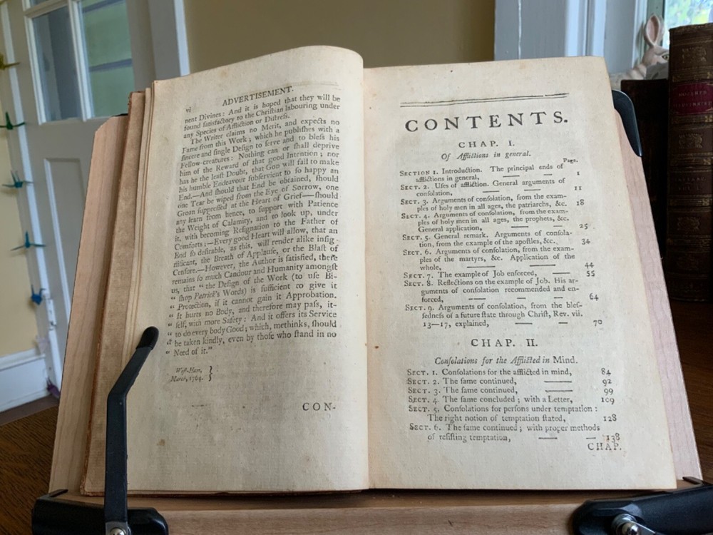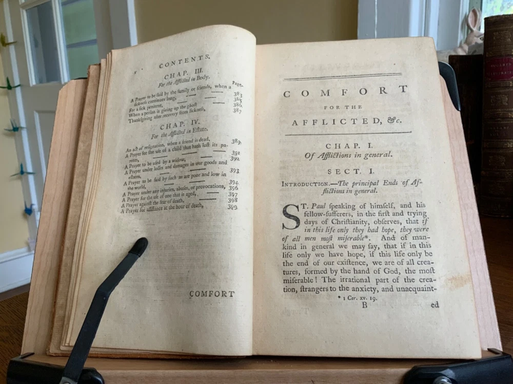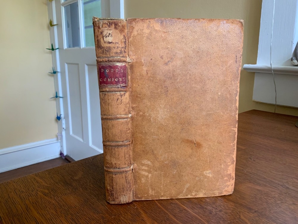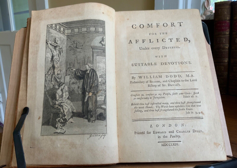 Comfort for the Afflicted, Under every Distress. With Suitable Devotions. By William Dodd, M.A. Printed for Edward and Charles Dilly at the Poultry, London, 1764, frontispiece by Gwin, 399 plus publisher’s list, full original speckled sheep, 8.25 x 5.25”, 8vo. In fair condition. Ex-library of the German Society in Philadelphia. Antiquarian plate adhered to pastedown. Call number of R280 along with notations written in old hand on fly. Tear at gutter of fly. Moderate wear to extremities with scuffing to edges and corners. Spine abraded with desiccation. Chipped spine ends with loss. Joints abraded with cracking. Front board tender. Light toning throughout text block with minor instances of foxing. Light offsetting from frontis to title. Free of known marginalia. All edges speckled. Binding intact. Please see photos. First edition of these discourses for the benefit of those suffering from poor health, loss of loved ones, strained finances, etc. COLR1764CDHX-923