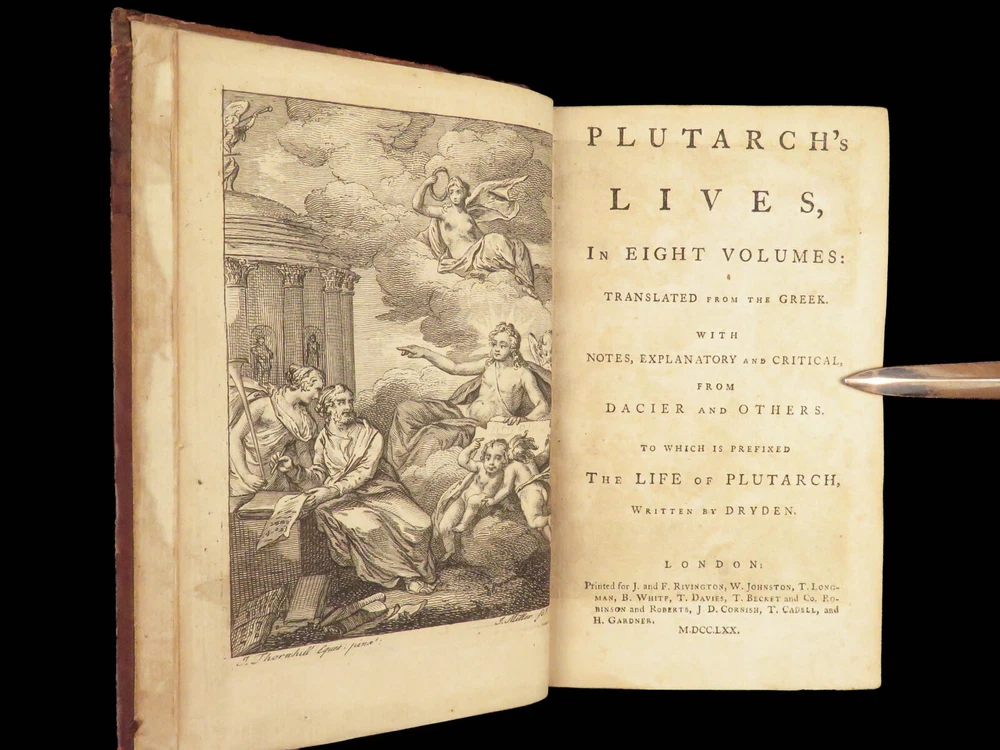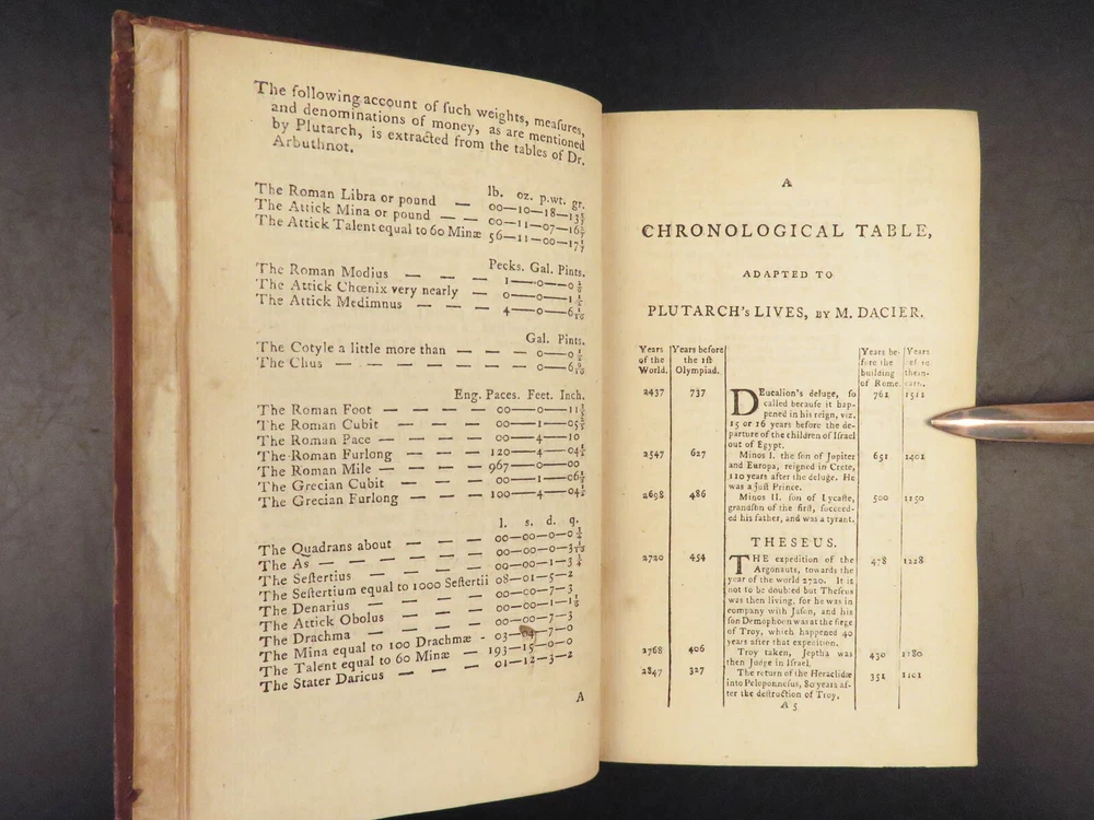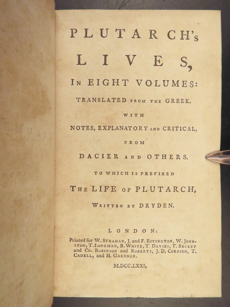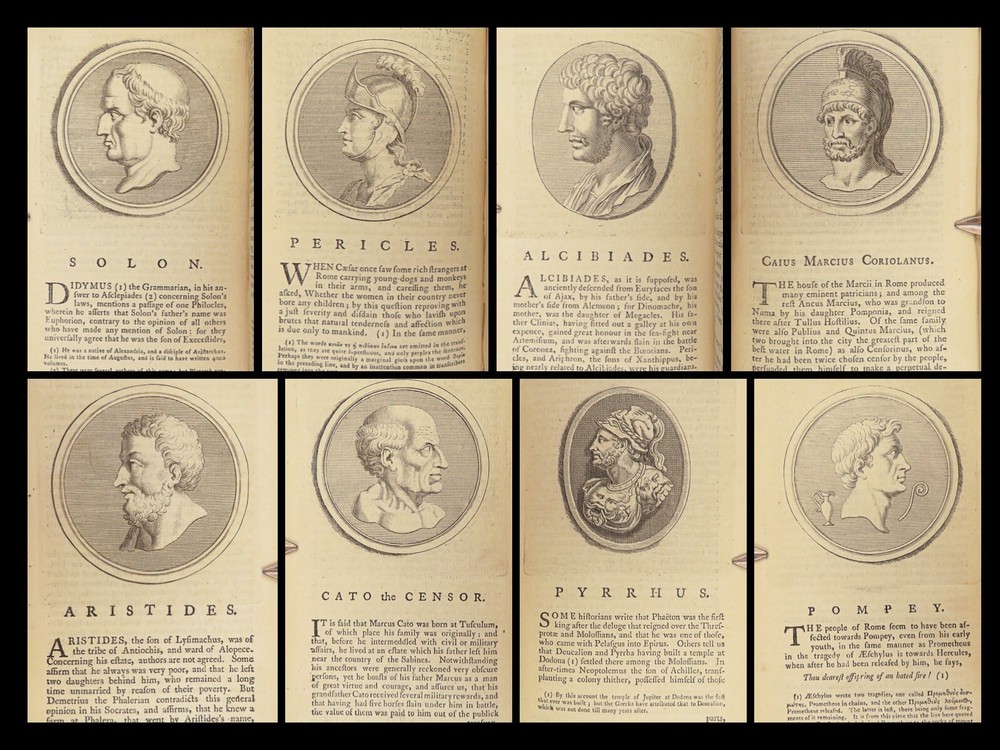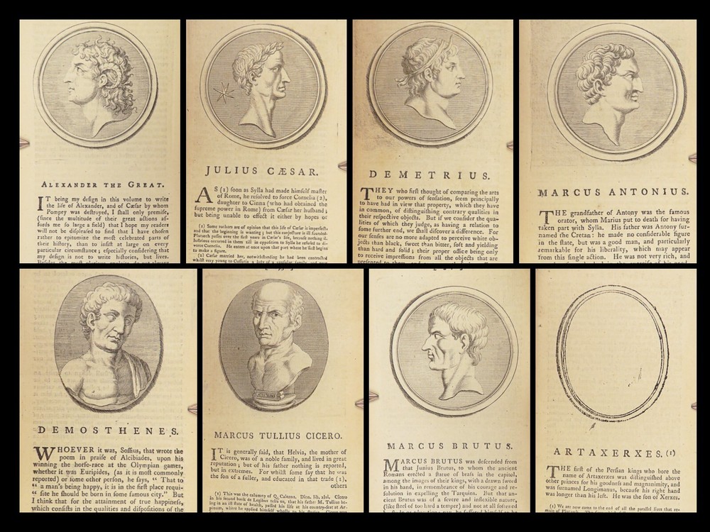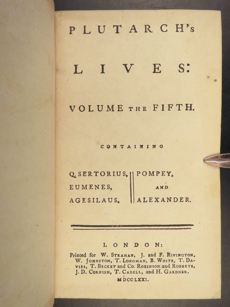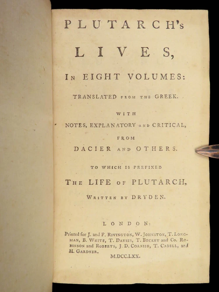 1770 PLUTARCH Parallel Lives ENGLISH Pyrrhus Aristides Cato Dryden 8v SET Illust “The mind is not a vessel to be filled, but a fire to be kindled.” ― Plutarch ‘ Plutarch’s Lives’ or ‘Parallel Lives’ is one of the most important and comprehensive collection of biographies of famous Greek and Roman figures. Plutarch was not so much focused on providing a historical account of these famous individuals as much as he was seeking to write of the type of person they were and the life in which they lived. He focuses on Alexander the Great, Romulus and Remus, Demosthenes, Cicero, Brutus, Julius Caesar, and many other important figures. The Langhornes' translation is considered more correct than North's spirited version and more even than the translation called Dryden's. Lowndes considered it an "accurate and elegant version". This rare, eight-volume English edition was translated by Anne Dacier and features a life of Plutarch by John Dryden. Item number: #24374 Price: $750 PLUTARCH Plutarch's Lives, in eight volumes: translated from the Greek. With notes, explanatory and critical, from Dacier and others London: Printed for J. and F. Rivington, et al, 1770. Details : · Collation: Complete with all pages; 8 volumes o Each volume individually paginated o 38 engravings, plus frontispiece in Vol. 1 · References: Lowndes 1891 · Language: English · Binding: Leather o Visible repair at front inner hinge in Vols. 1 and 7, rear inner hinge in Vol. 7 · Size : ~7in X 4.5in (18cm x 11cm) Our Guarantee: Very Fast. Very Safe. Free Shipping Worldwide. Customer satisfaction is our priority! Notify us with 7 days of receiving, and we will offer a full refund without reservation! 24374