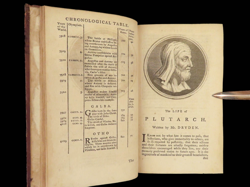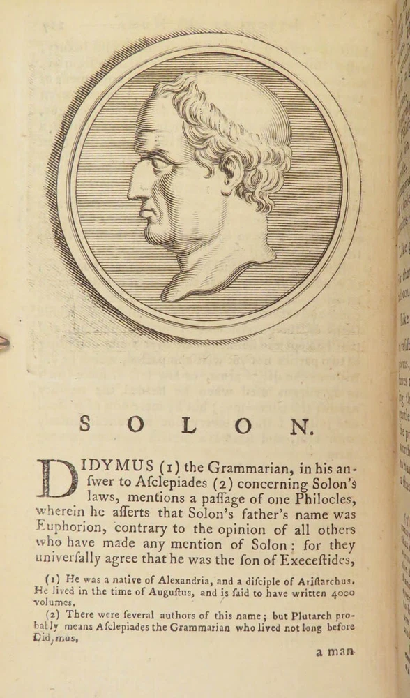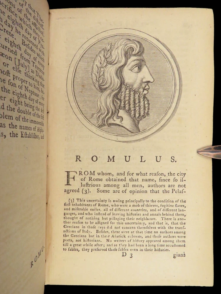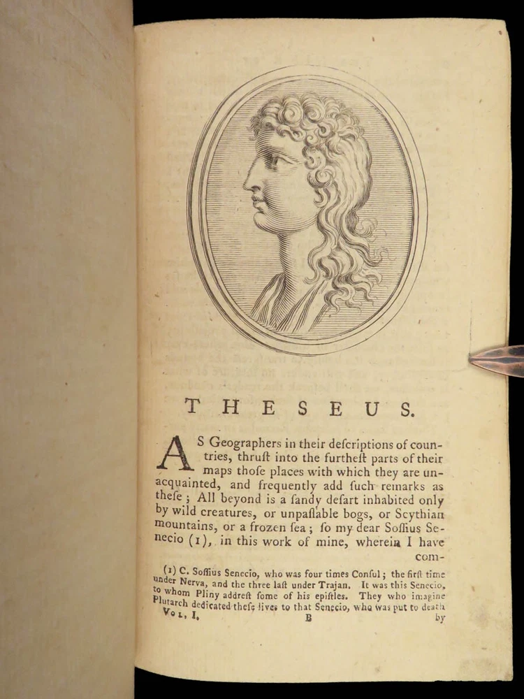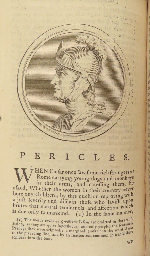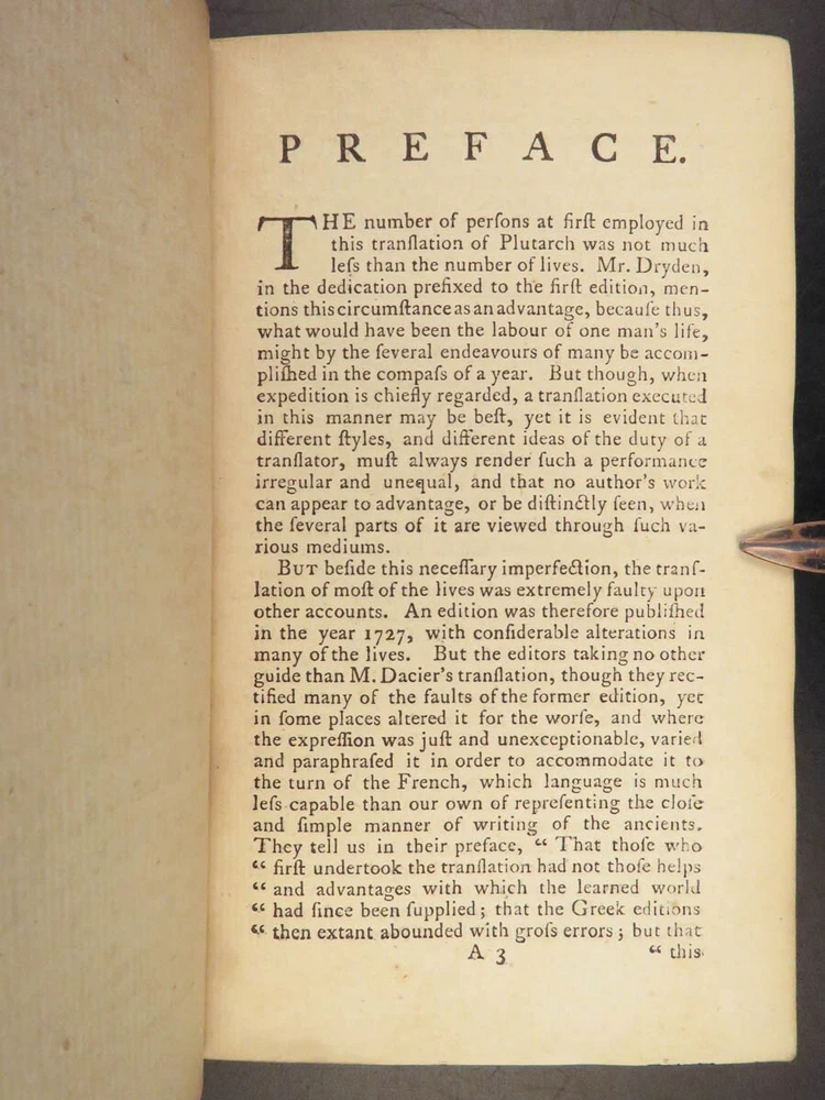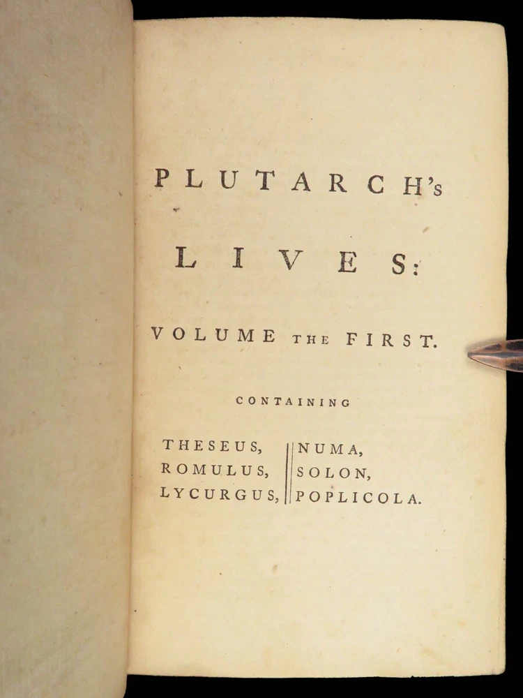 1770 PLUTARCH Parallel Lives ENGLISH Pyrrhus Aristides Cato Dryden 8v SET Illust “The mind is not a vessel to be filled, but a fire to be kindled.” ― Plutarch ‘ Plutarch’s Lives’ or ‘Parallel Lives’ is one of the most important and comprehensive collection of biographies of famous Greek and Roman figures. Plutarch was not so much focused on providing a historical account of these famous individuals as much as he was seeking to write of the type of person they were and the life in which they lived. He focuses on Alexander the Great, Romulus and Remus, Demosthenes, Cicero, Brutus, Julius Caesar, and many other important figures. The Langhornes' translation is considered more correct than North's spirited version and more even than the translation called Dryden's. Lowndes considered it an "accurate and elegant version". This rare, eight-volume English edition was translated by Anne Dacier and features a life of Plutarch by John Dryden. Item number: #24374 Price: $750 PLUTARCH Plutarch's Lives, in eight volumes: translated from the Greek. With notes, explanatory and critical, from Dacier and others London: Printed for J. and F. Rivington, et al, 1770. Details : · Collation: Complete with all pages; 8 volumes o Each volume individually paginated o 38 engravings, plus frontispiece in Vol. 1 · References: Lowndes 1891 · Language: English · Binding: Leather o Visible repair at front inner hinge in Vols. 1 and 7, rear inner hinge in Vol. 7 · Size : ~7in X 4.5in (18cm x 11cm) Our Guarantee: Very Fast. Very Safe. Free Shipping Worldwide. Customer satisfaction is our priority! Notify us with 7 days of receiving, and we will offer a full refund without reservation! 24374