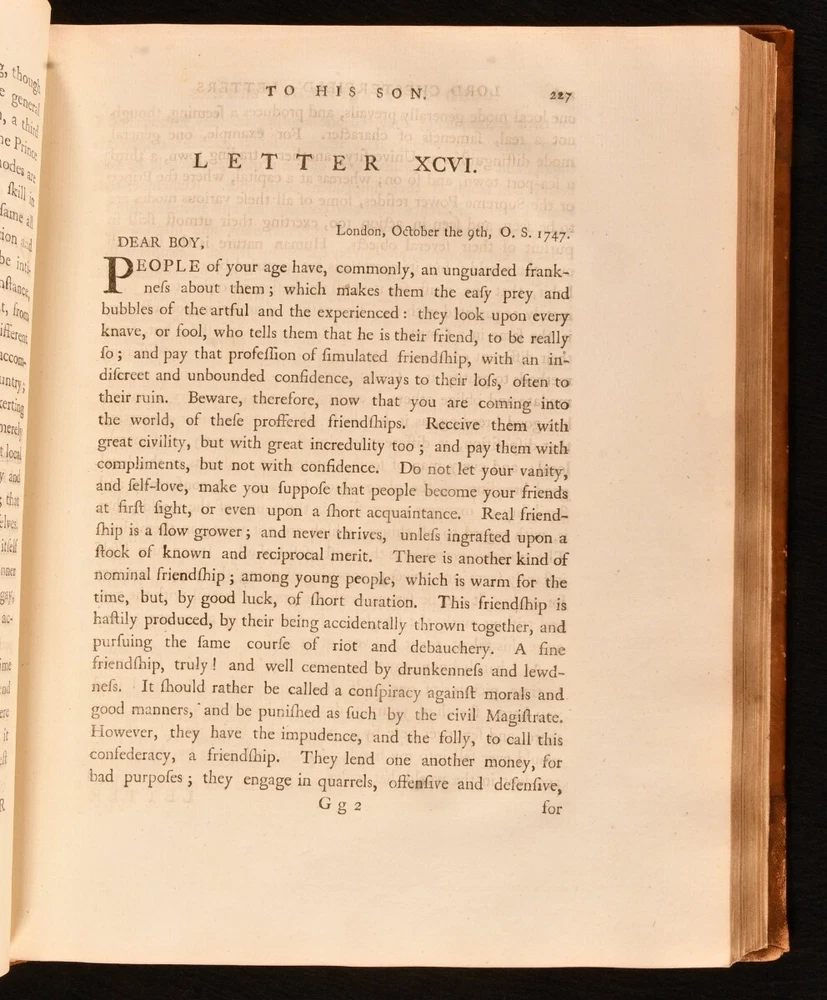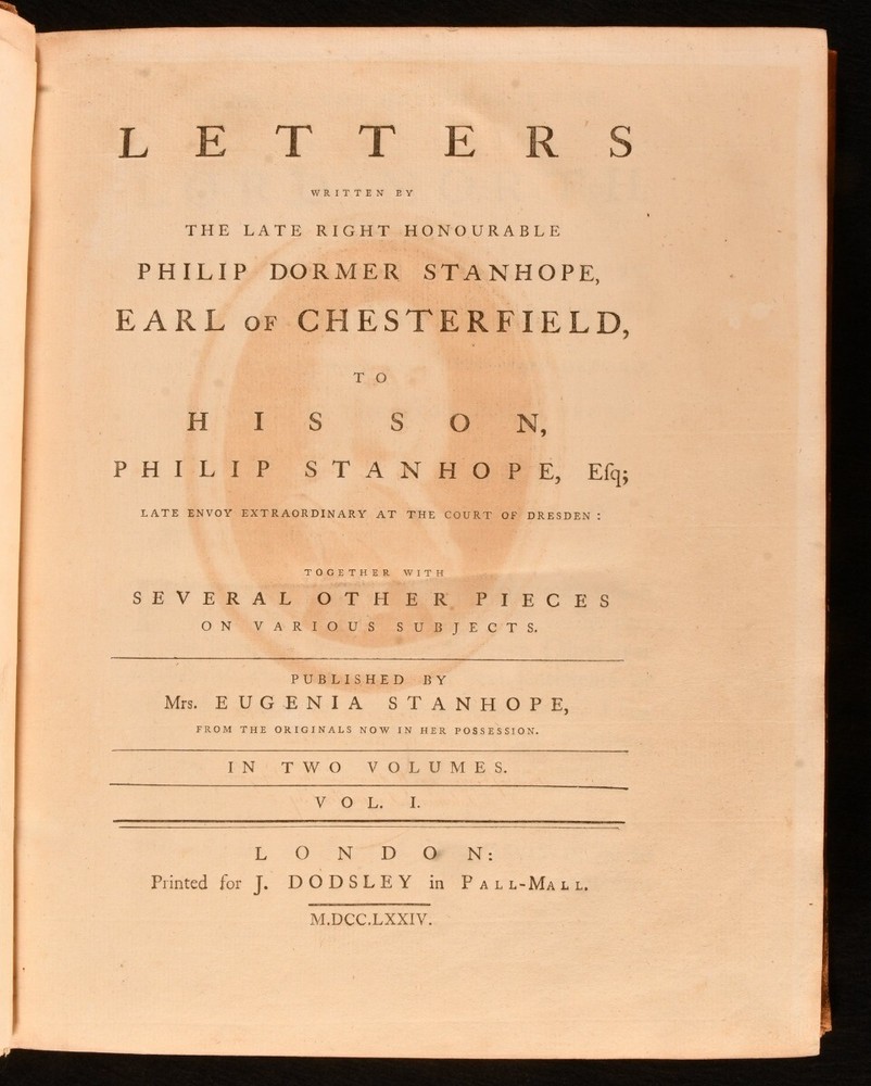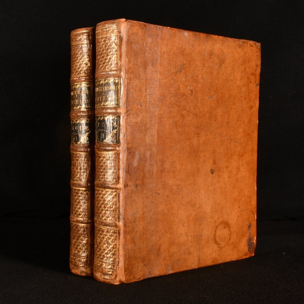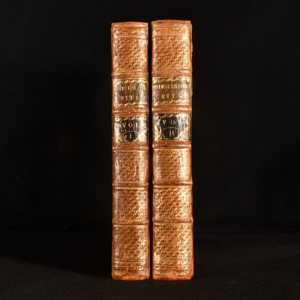 Click here to see our other books! Letters Written By the Late Right Honourable Philip Dormer Stanhope, Earl of Chesterfield, to His Son, Philip Stanhope, Esq; Late Envoy Extraordinary at the Court of Dresden: Together With Several Other Pieces on Various Subjects Philip Dormer Stanhope, Earl of Chesterfield 1774 J. Dodsley : London 11.5" by 9.5" [4], vii, [1], 568; [4], 606, [1pp] SUMMARY A lovely first edition, second state, of Philip Dormer Chesterfield's important instructional letters written to his son. First Edition,Illustrated,Leather Binding Overall Condition: Very Good This book weighs 5 KG when packed UK Postage: £ 4.49 US Postage: £ 42.99 EU Postage : £ 27.99 European Postage: £ 45.99 Asia Postage: £ 74.99 Worldwide Postage: £ 129.99 DESCRIPTION The first edition, second state, with 'quia uroit' corrected to 'quia auroit' in Volume 1 leaf H4 line 16. Complete in two volumes. Volume I illustrated with a frontispiece. ESTC citation number T136181. Half-title is present to each volume. A selection of the letters from Philip Dormer Stanhope, the 4th Earl of Chesterfield, addressed to his son Philip Stanhope, who he had with a French governess. This collection comprises of a thirty year correspondence containing more than four hundred letters, written between 1737 to 1768, when the son died. Stanhope was a notable man of letters and an acclaimed wit of his time. His letters to his son were mostly instructive, discussing geography, history, classical literature, and politics. Though Stanhope never intended these letters for publication, they have become his best known work from which his literary reputation dervies today. Edited by Eugenie Stanhope, the wife of Stanhope's illegitimate son to whom these letters are addressed. CONDITION In a full rebacked calf binding. Externally, smart, with some light marks to the boards and spine, including a small ring mark to the tail of the front board of Volume II. Minor bumping to the extremities. Spine labels are lightly rubbed. Evidence of former wear and loss to the boards prior to rebacking, including loss to the tail of the front board of Volume II. Light rubbing to the spines. Front hinge of Volume I is starting a little but remains firm. Internally, firmly bound. Pages are very lightly age toned, age-toning a little heavier to the first and last few pages, and clean with the occasional spot. Very small tide mark to the tail of the frontispiece. Overall Condition: Very Good GLOSSARY OF TERMS Overall Condition (Dustwrapper condition rating is shown after that for the book itself, where a dustwrapper is present) Fine - Very well preserved copy showing very little wear Very Good Indeed - Only one or two minor faults, really a very attractive copy Very Good - Quite a wide term meaning no major faults but probably several smaller ones often expected given the age of the book, but still a respectable copy Good - Meaning not very good. Some more serious faults as will be described in the condition report under 'condition' Good Only - Meaning one or more faults that could really do with repair Fair - As with good only above but with other faults leaving a compromised copy even after repair Poor - Really bad and possibly seriously incomplete. We only sell books in this condition where their rarity or value makes them attractive none the less. Major defects will be described. GUARANTEE We offer a full money back guarantee on our descriptions. Please ask for details and conditions. We prefer PAYPAL. If you pay via PAYPAL we will post the item off the same or the next working day with the postage you have selected. Please note we cannot accept USD cheques