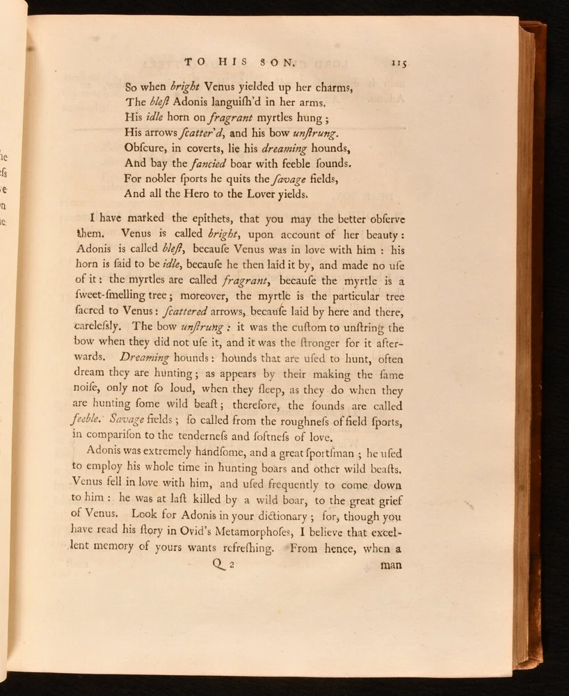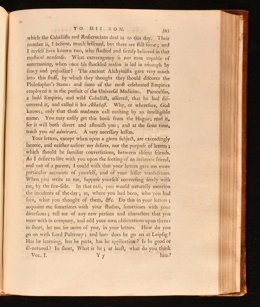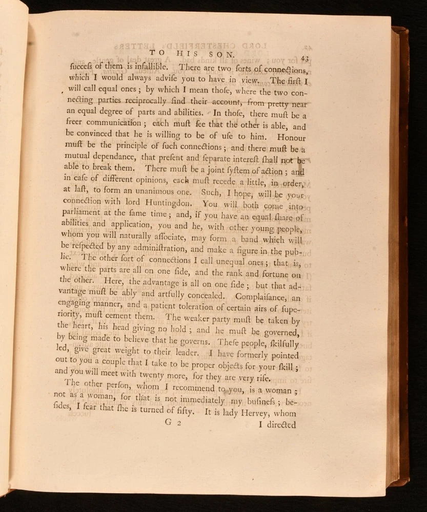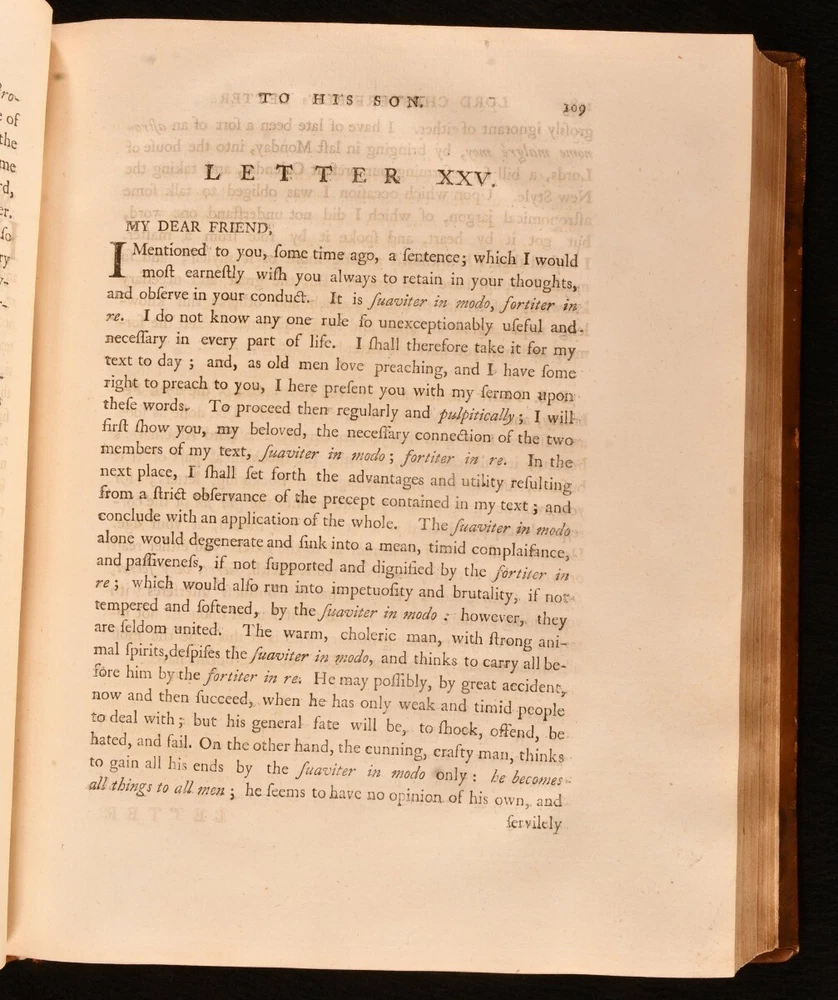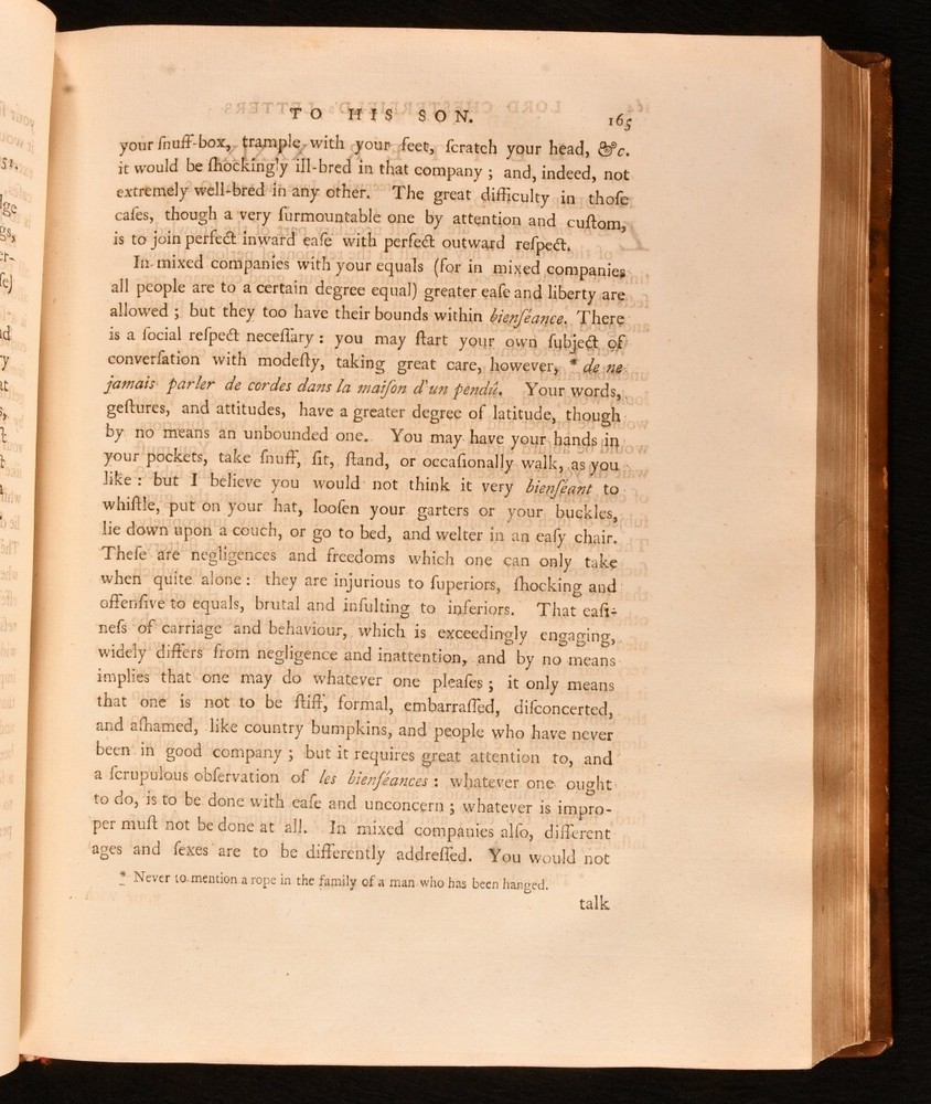 Click here to see our other books! Letters Written By the Late Right Honourable Philip Dormer Stanhope, Earl of Chesterfield, to His Son, Philip Stanhope, Esq; Late Envoy Extraordinary at the Court of Dresden: Together With Several Other Pieces on Various Subjects Philip Dormer Stanhope, Earl of Chesterfield 1774 J. Dodsley : London 11.5" by 9.5" [4], vii, [1], 568; [4], 606, [1pp] SUMMARY A lovely first edition, second state, of Philip Dormer Chesterfield's important instructional letters written to his son. First Edition,Illustrated,Leather Binding Overall Condition: Very Good This book weighs 5 KG when packed UK Postage: £ 4.49 US Postage: £ 42.99 EU Postage : £ 27.99 European Postage: £ 45.99 Asia Postage: £ 74.99 Worldwide Postage: £ 129.99 DESCRIPTION The first edition, second state, with 'quia uroit' corrected to 'quia auroit' in Volume 1 leaf H4 line 16. Complete in two volumes. Volume I illustrated with a frontispiece. ESTC citation number T136181. Half-title is present to each volume. A selection of the letters from Philip Dormer Stanhope, the 4th Earl of Chesterfield, addressed to his son Philip Stanhope, who he had with a French governess. This collection comprises of a thirty year correspondence containing more than four hundred letters, written between 1737 to 1768, when the son died. Stanhope was a notable man of letters and an acclaimed wit of his time. His letters to his son were mostly instructive, discussing geography, history, classical literature, and politics. Though Stanhope never intended these letters for publication, they have become his best known work from which his literary reputation dervies today. Edited by Eugenie Stanhope, the wife of Stanhope's illegitimate son to whom these letters are addressed. CONDITION In a full rebacked calf binding. Externally, smart, with some light marks to the boards and spine, including a small ring mark to the tail of the front board of Volume II. Minor bumping to the extremities. Spine labels are lightly rubbed. Evidence of former wear and loss to the boards prior to rebacking, including loss to the tail of the front board of Volume II. Light rubbing to the spines. Front hinge of Volume I is starting a little but remains firm. Internally, firmly bound. Pages are very lightly age toned, age-toning a little heavier to the first and last few pages, and clean with the occasional spot. Very small tide mark to the tail of the frontispiece. Overall Condition: Very Good GLOSSARY OF TERMS Overall Condition (Dustwrapper condition rating is shown after that for the book itself, where a dustwrapper is present) Fine - Very well preserved copy showing very little wear Very Good Indeed - Only one or two minor faults, really a very attractive copy Very Good - Quite a wide term meaning no major faults but probably several smaller ones often expected given the age of the book, but still a respectable copy Good - Meaning not very good. Some more serious faults as will be described in the condition report under 'condition' Good Only - Meaning one or more faults that could really do with repair Fair - As with good only above but with other faults leaving a compromised copy even after repair Poor - Really bad and possibly seriously incomplete. We only sell books in this condition where their rarity or value makes them attractive none the less. Major defects will be described. GUARANTEE We offer a full money back guarantee on our descriptions. Please ask for details and conditions. We prefer PAYPAL. If you pay via PAYPAL we will post the item off the same or the next working day with the postage you have selected. Please note we cannot accept USD cheques