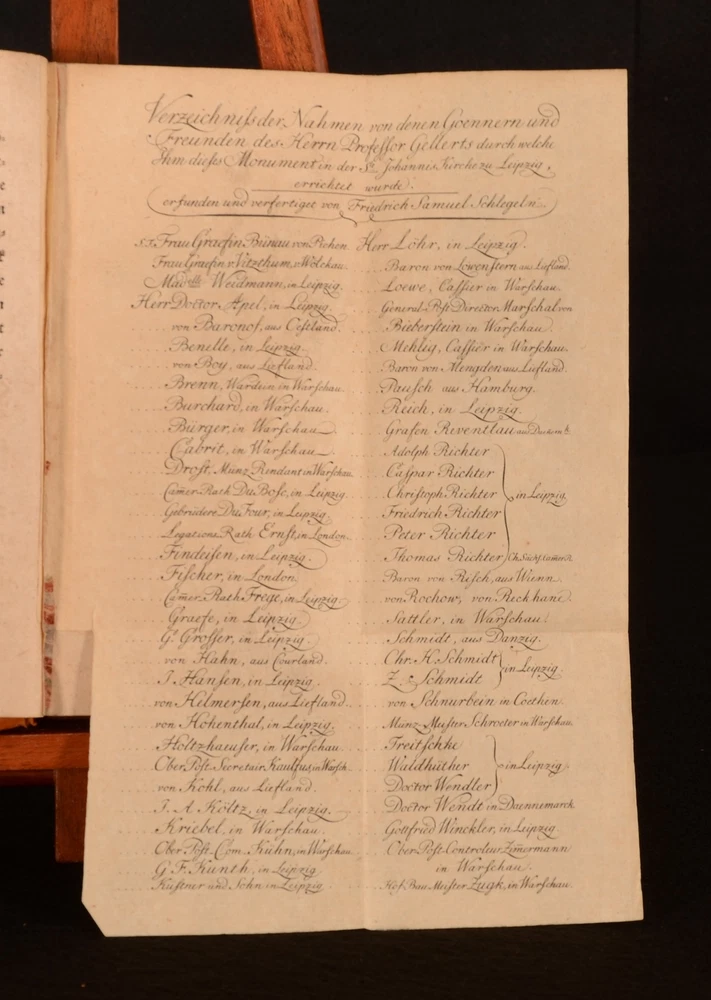 Click here to see our other books! Christian Furchtegott Gellerts Leben Johann Andreas Cramer; Christian Furchtegott Gellert 1774 M G Weidmanns Erben und Reigh : Leipzig 8" by 5" [5], 4-230, [1]pp SUMMARY The first edition of this biography regarding the German poet and moral philosopher, Christian Furchtegott Gellert. Written by Johann Andreas Cramer, an associate of Gellert. First Edition,Folding Plates,Illustrated,Leather Binding Overall Condition: Good Only This book weighs 0.5 KG when packed UK Postage: £ 3.99 US Postage: £ 15.99 EU Postage : £ 13.99 European Postage: £ 14.99 Asia Postage: £ 18.99 Worldwide Postage: £ 19.99 DESCRIPTION Illustrated, with a folding frontispiece of Gellert's grave monument in St John, Leipzig and a folding plate list of his donors and patrons preceding the half-title. Prior owner's stamp to the title page, A StB. Loosely inserted is several leaves of notes, written in copperplate and in German. Prior owner's notes to the recto and verso of front endpaper. Christian Furchtegott Gellert was a notable figure during the Enlightenment. Contemporaneously, his writings were one of the most widely read. He was a professor of poetry for many years in Leipzig. He met the author of this memoir, Johann Andreas Cramer, during his studies. Cramer was a German theologian during the Enlightenment era. This work is regarded as the first biography of Gellert, who was such a notable figure in German culture and literature in the eighteenth century. CONDITION In a full calf binding. Externally, rubbed to the boards and spine. Crack to the spine. Small loss to the front board. Front hinge and joint are weak and may detach with further handling. Prior owner's inscriptions to the recto of front endpaper and to the verso of front endpaper. Loosely inserted is a selection of notes written in German. Internally, firmly bound. Pages are slightly age toned. Occasional scattered spots to pages. Overall Condition: Good Only GLOSSARY OF TERMS Overall Condition (Dustwrapper condition rating is shown after that for the book itself, where a dustwrapper is present) Fine - Very well preserved copy showing very little wear Very Good Indeed - Only one or two minor faults, really a very attractive copy Very Good - Quite a wide term meaning no major faults but probably several smaller ones often expected given the age of the book, but still a respectable copy Good - Meaning not very good. Some more serious faults as will be described in the condition report under 'condition' Good Only - Meaning one or more faults that could really do with repair Fair - As with good only above but with other faults leaving a compromised copy even after repair Poor - Really bad and possibly seriously incomplete. We only sell books in this condition where their rarity or value makes them attractive none the less. Major defects will be described. GUARANTEE We offer a full money back guarantee on our descriptions. Please ask for details and conditions. We prefer PAYPAL. If you pay via PAYPAL we will post the item off the same or the next working day with the postage you have selected. Please note we cannot accept USD cheques