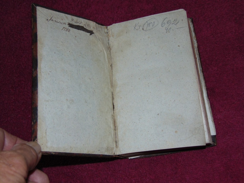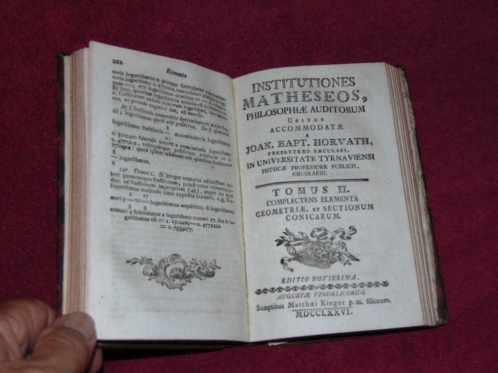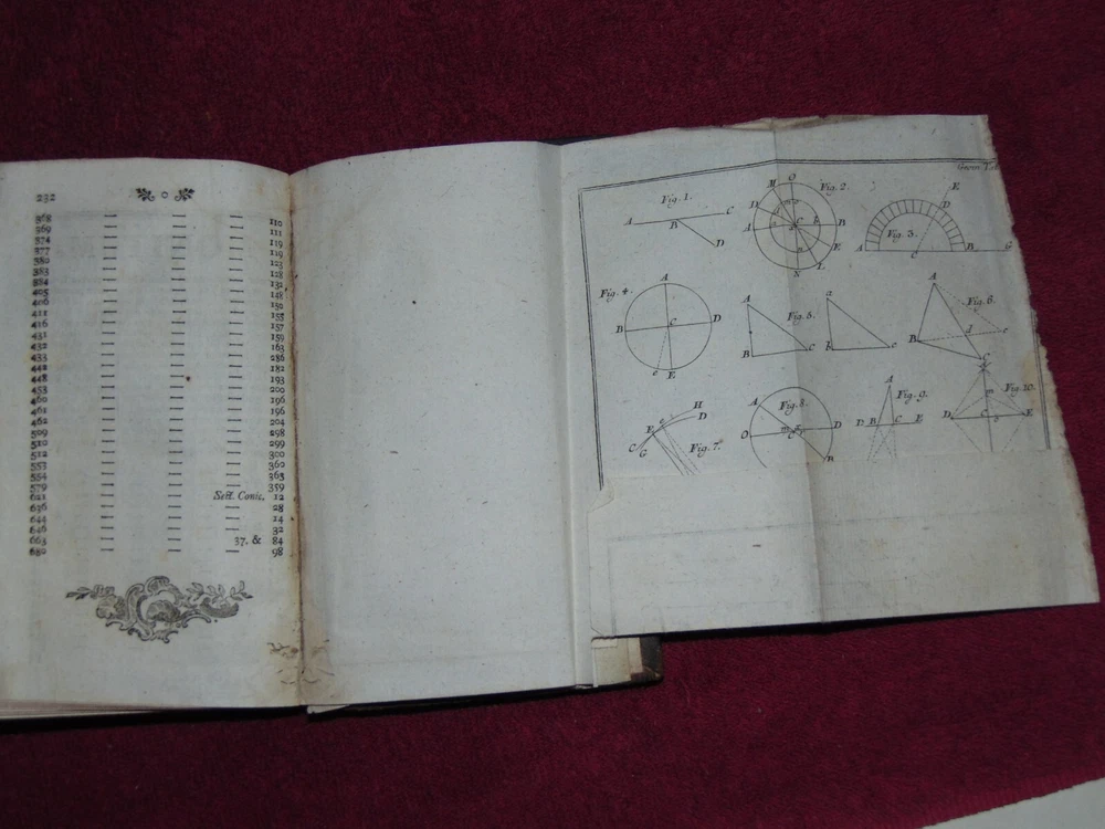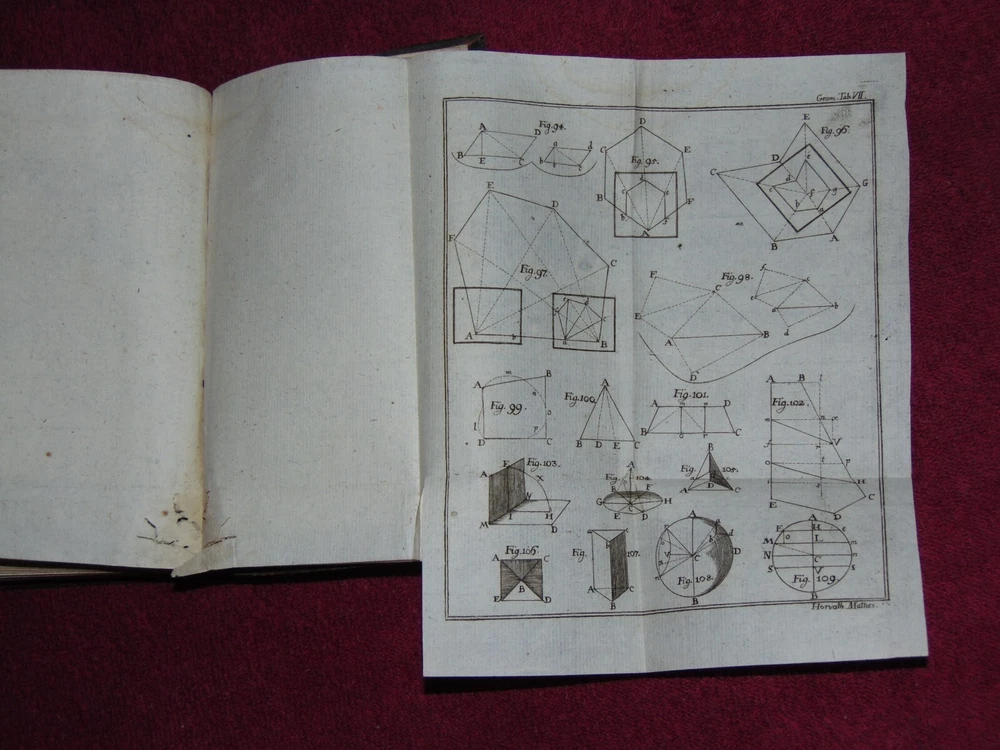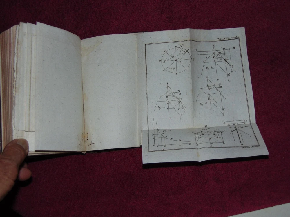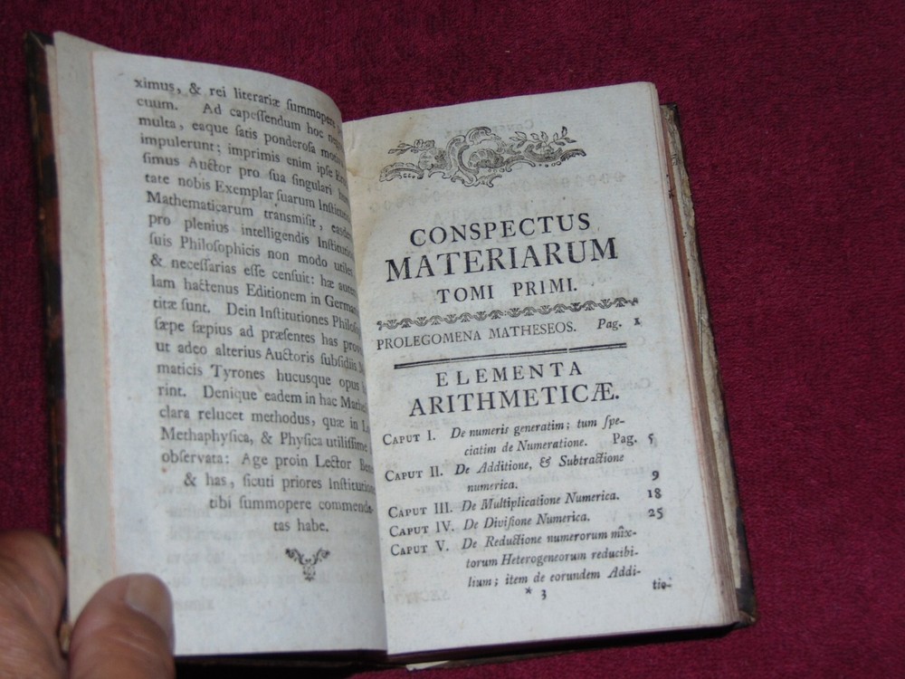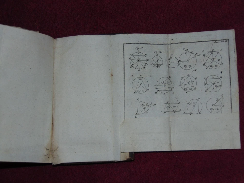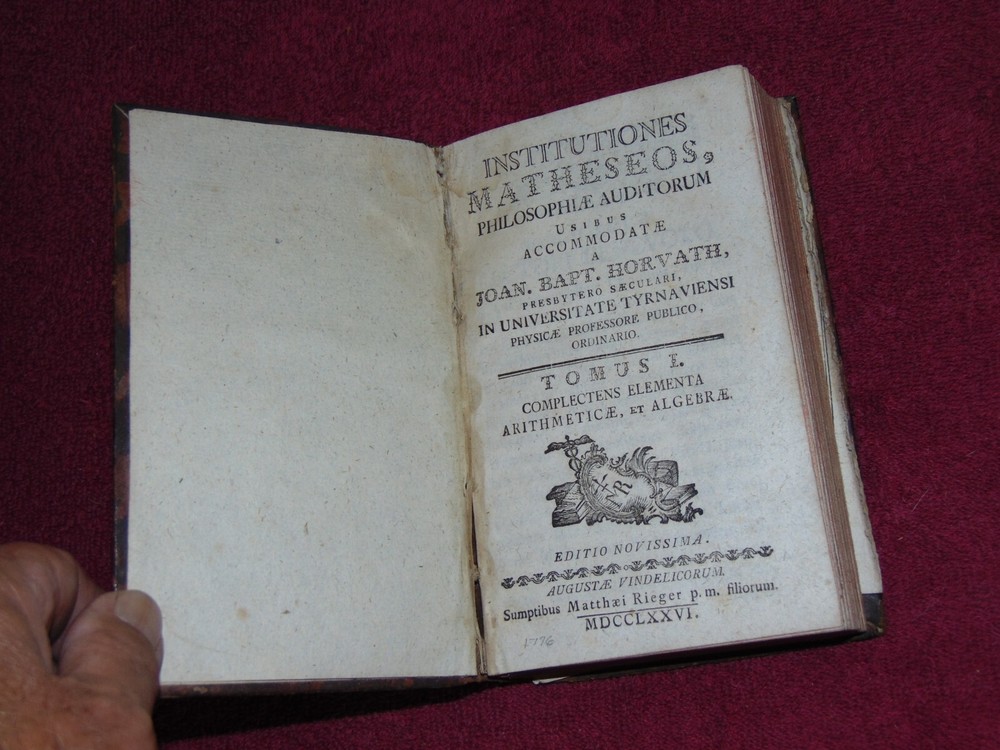 ORIGINAL LEATHER COVER 1776 "INSTITUTIONES MATHESEOS" (MATH, ALGEBRA, GEOMETRY) .................... 454 CLEAN, TIGHTLY-BOUND PAGES + 9 FOLD-OUT PLATES ................ LATIN TEXT ............... MEASURES 4 1/8" X 6 7/8" ................. COVER HAS SCUFF MARKS; FRONT FLYLEAF HAS 1-INCH TOP EDGE TEAR AT SPINE; TITLE PAGE HAS SPINE CRACK IN GUTTER; SOME FOLD-OUT PLATES HAVE SMALL EDGE TEARS; PLATE PAGES HAVE SOME WORM HOLES NEAR BOTTOM EDGE .................... SOME WEAR, BUT BOOK IS SOLID. ----------------------------------------- WILL BE SECURELY SHIPPED IN CARDBOARD FOR A SAFE JOURNEY TO YOUR HOME.