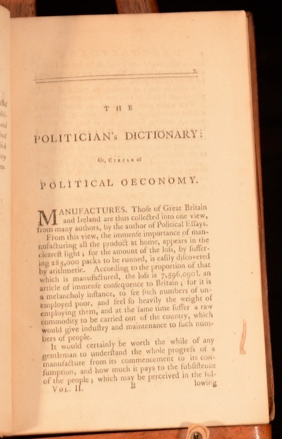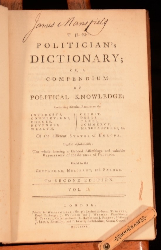 Click here to see our other books! The Politician's Dictionary; Or, A Compendium of Political Knowledge Anon 1776 William Lane : London 8" by 5.5" 384pp SUMMARY A very scarce second edition of this political work Leather Binding Overall Condition: Good This book weighs 0.5 KG when packed UK Postage: £ 3.99 US Postage: £ 15.99 EU Postage : £ 13.99 European Postage: £ 14.99 Asia Postage: £ 18.99 Worldwide Postage: £ 19.99 DESCRIPTION 'Containing historical remarks on the interests, connections, forces, revenues, wealth, credit, debts, taxes, commerce, manufactures, etc. of the different states of Europe. Digested alphabetically: the whole forming a general assemblage and valuable repository of the science of politics. Useful to the gentleman, merchant and farmer' (from title page). CONDITION In a calf binding. Externally, rubbed with some wear and marks to boards. Both boards are detached. Internally, firmly bound. Pages generally bright and clean. Ink inscription to title page. Overall Condition: Good GLOSSARY OF TERMS Overall Condition (Dustwrapper condition rating is shown after that for the book itself, where a dustwrapper is present) Fine - Very well preserved copy showing very little wear Very Good Indeed - Only one or two minor faults, really a very attractive copy Very Good - Quite a wide term meaning no major faults but probably several smaller ones often expected given the age of the book, but still a respectable copy Good - Meaning not very good. Some more serious faults as will be described in the condition report under 'condition' Good Only - Meaning one or more faults that could really do with repair Fair - As with good only above but with other faults leaving a compromised copy even after repair Poor - Really bad and possibly seriously incomplete. We only sell books in this condition where their rarity or value makes them attractive none the less. Major defects will be described. GUARANTEE We offer a full money back guarantee on our descriptions. Please ask for details and conditions. We prefer PAYPAL. If you pay via PAYPAL we will post the item off the same or the next working day with the postage you have selected. Please note we cannot accept USD cheques