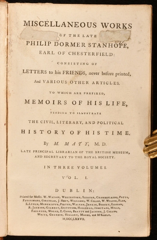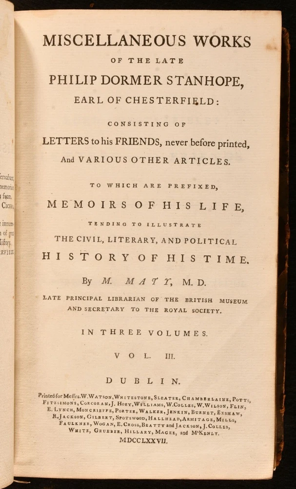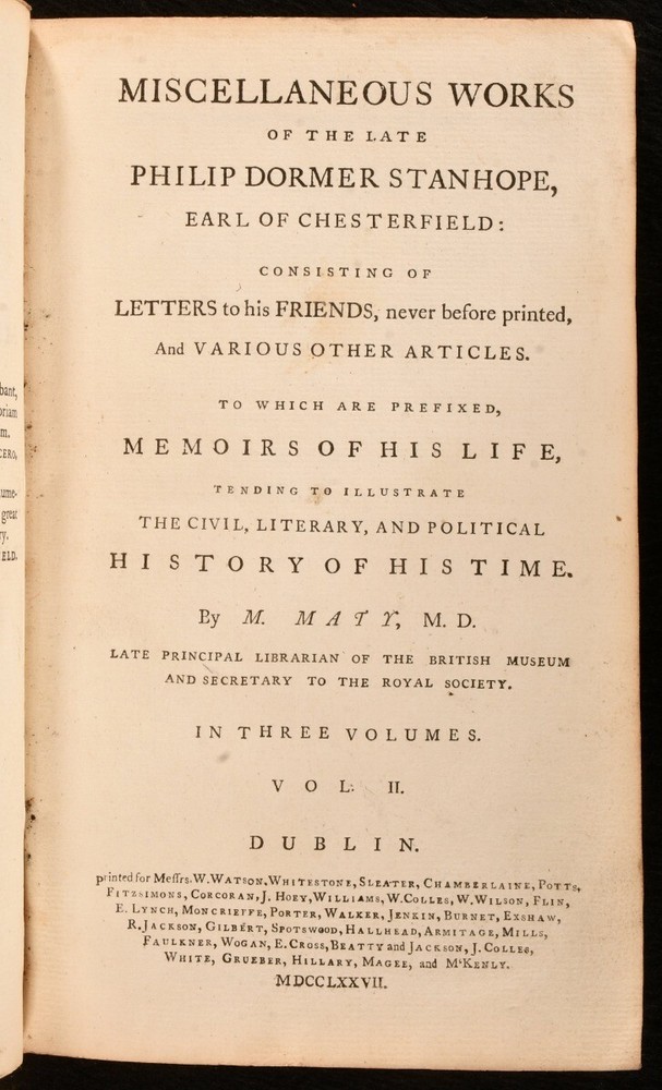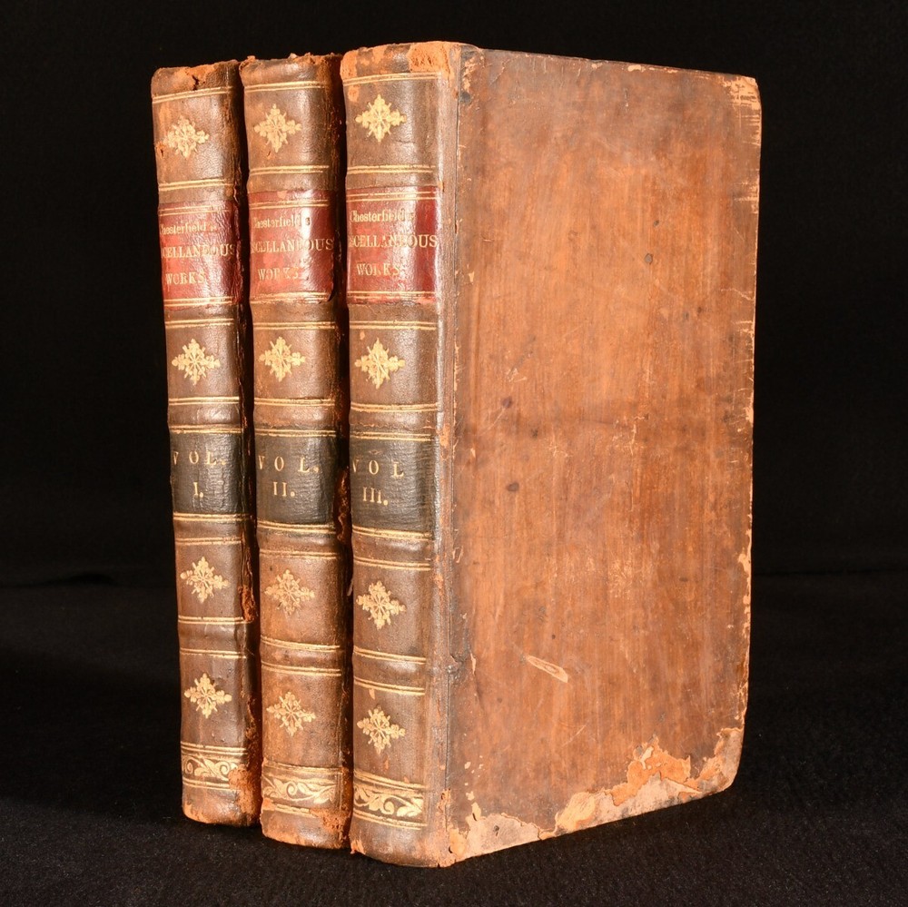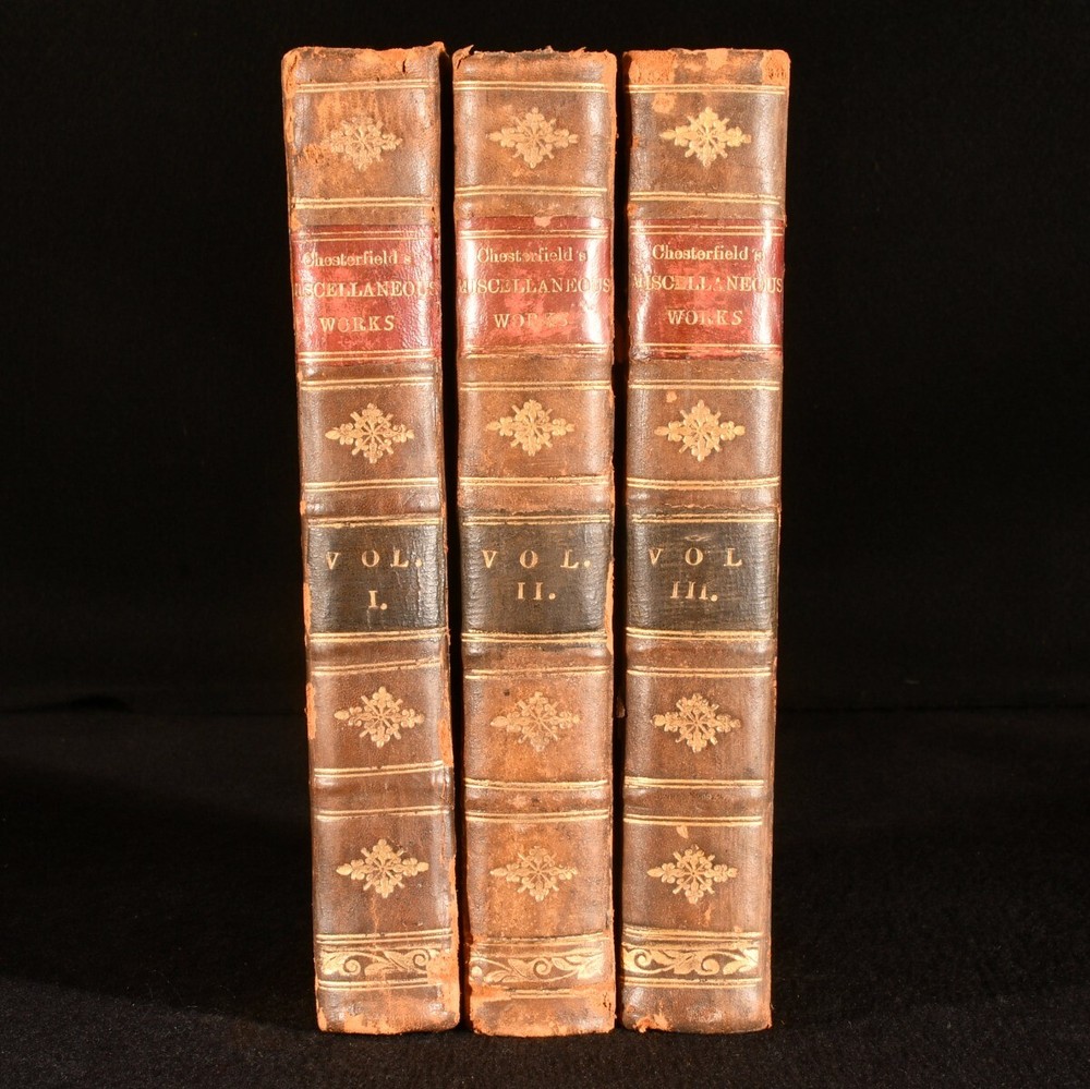 Click here to see our other books! Miscellaneous Works of the Late Philip Dormer Stanhope Philip Dormer Stanhope, Earl of Chesterfield 1777 W. Watson; Whitestone; Sleater et al, : Dublin 9" by 6" v-vi [3], 2-353 [1]; 439; 439pp SUMMARY The first Dublin edition of Philip Dormer Stanhope's miscellaneous writings, published shortly after his popular 'Letters' were published. First Edition,Leather Binding Overall Condition: Very Good This book weighs 3 KG when packed UK Postage: £ 3.99 US Postage: £ 36.99 EU Postage : £ 25.99 European Postage: £ 27.99 Asia Postage: £ 47.99 Worldwide Postage: £ 69.99 DESCRIPTION The three volume first Dublin edition of this work, published in the same year as the first London edition. Collated, illustrated with a portrait frontispiece and five plates to volume I. Lacking two plates. With a half title to each volume. ESTC No. N5220. With the inscription of J. Bell Attorney to a front blank of volume II. This work comprises of letters from Stanhope to his friends, and also a memoir on the Earl of Chesterfield by Matthew Maty, who began the work with the assistance of Solomon Dayrolles. The work was completed by his son-in-law Justamond. These miscellaneous works hold the first appearance of Maty's memoir. CONDITION Rebacked in a full calf binding, with boards restored. Endpapers renewed. Significant rubbing and losses of leather to joints of volumes I and II, with rubbing to back strip heads and tails. Loss of leather to tail of front boards of volumes I and III. Inscription to front blank of volume II. Internally, firmly bound. Pages age toned due to paper type, but clean. Two areas of loss to head of volume I title page, reinforced to the verso. Overall Condition: Very Good GLOSSARY OF TERMS Overall Condition (Dustwrapper condition rating is shown after that for the book itself, where a dustwrapper is present) Fine - Very well preserved copy showing very little wear Very Good Indeed - Only one or two minor faults, really a very attractive copy Very Good - Quite a wide term meaning no major faults but probably several smaller ones often expected given the age of the book, but still a respectable copy Good - Meaning not very good. Some more serious faults as will be described in the condition report under 'condition' Good Only - Meaning one or more faults that could really do with repair Fair - As with good only above but with other faults leaving a compromised copy even after repair Poor - Really bad and possibly seriously incomplete. We only sell books in this condition where their rarity or value makes them attractive none the less. Major defects will be described. GUARANTEE We offer a full money back guarantee on our descriptions. Please ask for details and conditions. We prefer PAYPAL. If you pay via PAYPAL we will post the item off the same or the next working day with the postage you have selected. Please note we cannot accept USD cheques