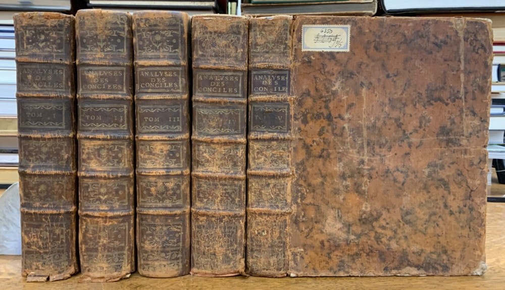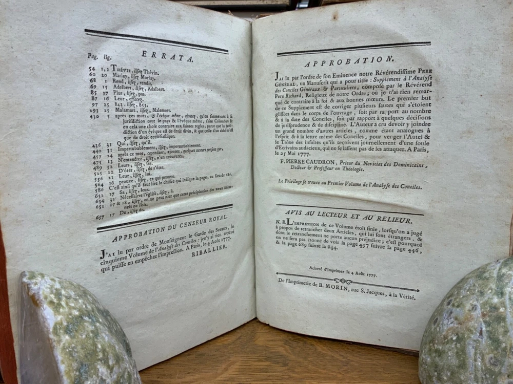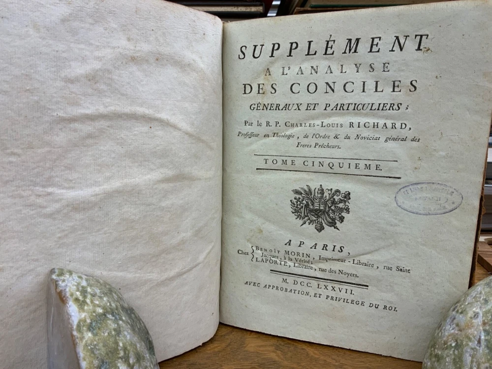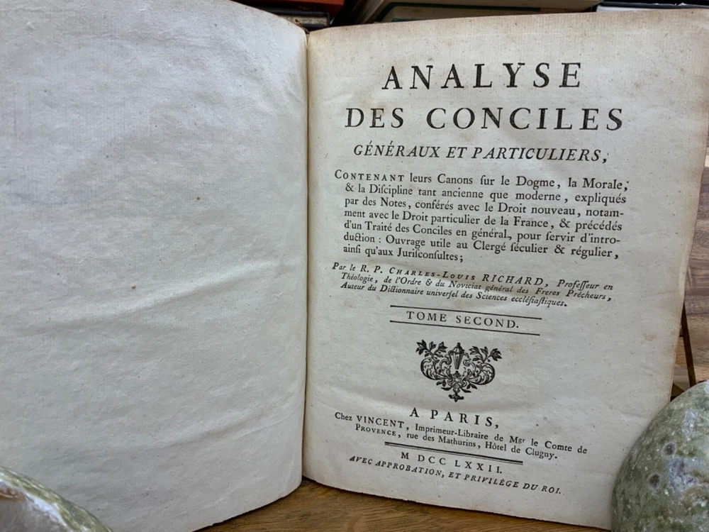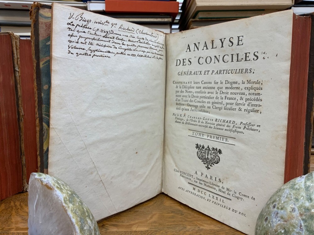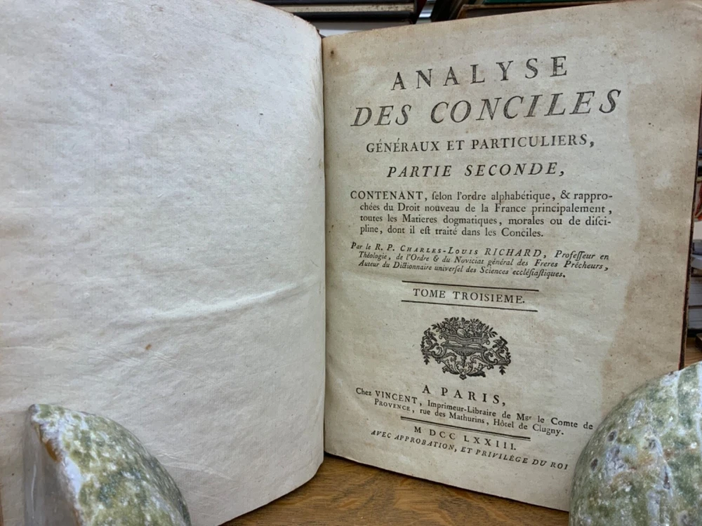 I - IV: Analyse des Conciles, Généraux et Particuliers, Contenant leurs Canons sur le Dogme, la Morale, & la Discipline tant ancienne que moderne, expliqués par des Notes, conférés avec le Droit nouveau, notamment avec le Droit particulier de la France, & précédés d'un Traité des Conciles en général, pour servir d'introduction: Ouvrage utile au Clergé séculier & régulier, ainsi qu'aux Jurisconsultes; Par le R. P. Charles-Louis Richard, Professeur en Théologie, de l'Ordre & du Noviciat général des Freres Prêcheurs, Auteur du Dictionnaire universel des Sciences ecclésiastiques. Tomes I-IV. A Paris, Chez Vincent, Imprimeur-Libraire de Mgr. le Comte de Provence, 1772 - 1773. First Editions, Original Leather Binding, 908 pp; 872 pp; 872 pp; 948 pp, 10 x 8", 4tos. V: Supplément a l'Analyse des Conciles Généraux et Particuliers, Par le R. P. Charles-Louis Richard, Professeur en Théologie, de l'Ordre & du Noviciat général des Freres Prêcheurs. A Paris, Chez Benoît Morin; Laporte, 1777. 735 pp, First Edition, Original Leather Binding, 10 x 8", 4to. A COMPLETE SET. In fair condition. Leather boards scuffed at edges and worn/bumped at leather corners. Leather heads of spines lacking from volumes IV & V, only headbands remain. Tail of Vol. IV is also lacking with only a headband remaining. Remainder of heads and tails are rubbed, but intact. Title and volume labels on spine worn from general shelf-wear, but still legible. Ex-library locator code stickers found on all front boards - top left corners. Leather is generally scuffed and worn, but still presents well. All edges of all volumes painted red. Color marbled end-papers intact and clean in all volumes. Vol. I includes ink marginalia (bibliographic information) on front end-page (verso). Ex-library ink stamps found in all volumes, on either front fly-leaves or title pages. General toning through text-blocks, with some instances of finger-soiling or age-staining. An attractive set, original and classic eighteenth century French binding. Bindings intact. Please see photos. Charles-Louis Richard (1711-1794) was a Catholic theologian and publicist. He was born at Blainville-sur-l'Eau, in Lorraine. His family though of noble descent, was poor, and he received his education in the schools of this native town. At the age of sixteen, he entered the Dominican Order and, after his religious profession, was sent to study theology of Paris, where he received a Doctorate at the Sorbonne. He next applied himself to preaching and the defense of religion against d'Alembert, Voltaire, and their confederates. The outbreak of the French Revolution freed him to seek refuge in Mons, in Belgium. During the second invasion of that country by the French, in 1794, old age prevented him from fleeing, and, though he eluded his pressures for some time, he was at last detected, tried by court martial, and shot. This is a complete work, attractively bound. First Editions. FORN-MSB-0324-0698(BOTTOM)-HK1340