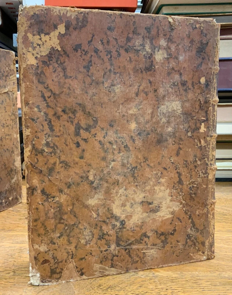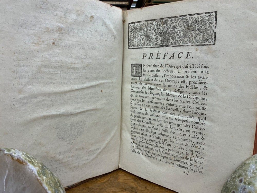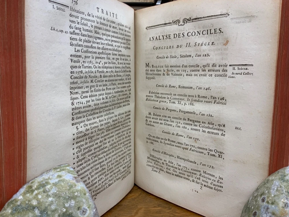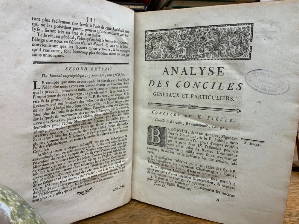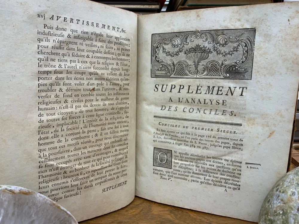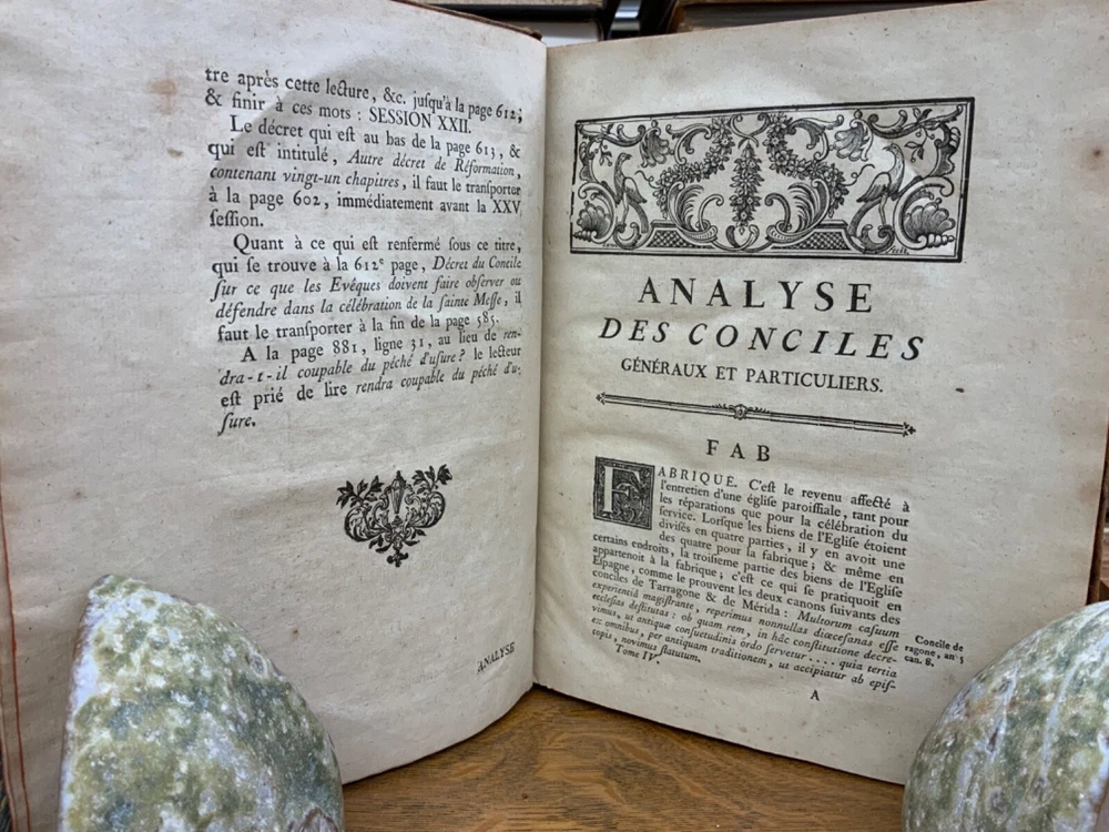 I - IV: Analyse des Conciles, Généraux et Particuliers, Contenant leurs Canons sur le Dogme, la Morale, & la Discipline tant ancienne que moderne, expliqués par des Notes, conférés avec le Droit nouveau, notamment avec le Droit particulier de la France, & précédés d'un Traité des Conciles en général, pour servir d'introduction: Ouvrage utile au Clergé séculier & régulier, ainsi qu'aux Jurisconsultes; Par le R. P. Charles-Louis Richard, Professeur en Théologie, de l'Ordre & du Noviciat général des Freres Prêcheurs, Auteur du Dictionnaire universel des Sciences ecclésiastiques. Tomes I-IV. A Paris, Chez Vincent, Imprimeur-Libraire de Mgr. le Comte de Provence, 1772 - 1773. First Editions, Original Leather Binding, 908 pp; 872 pp; 872 pp; 948 pp, 10 x 8", 4tos. V: Supplément a l'Analyse des Conciles Généraux et Particuliers, Par le R. P. Charles-Louis Richard, Professeur en Théologie, de l'Ordre & du Noviciat général des Freres Prêcheurs. A Paris, Chez Benoît Morin; Laporte, 1777. 735 pp, First Edition, Original Leather Binding, 10 x 8", 4to. A COMPLETE SET. In fair condition. Leather boards scuffed at edges and worn/bumped at leather corners. Leather heads of spines lacking from volumes IV & V, only headbands remain. Tail of Vol. IV is also lacking with only a headband remaining. Remainder of heads and tails are rubbed, but intact. Title and volume labels on spine worn from general shelf-wear, but still legible. Ex-library locator code stickers found on all front boards - top left corners. Leather is generally scuffed and worn, but still presents well. All edges of all volumes painted red. Color marbled end-papers intact and clean in all volumes. Vol. I includes ink marginalia (bibliographic information) on front end-page (verso). Ex-library ink stamps found in all volumes, on either front fly-leaves or title pages. General toning through text-blocks, with some instances of finger-soiling or age-staining. An attractive set, original and classic eighteenth century French binding. Bindings intact. Please see photos. Charles-Louis Richard (1711-1794) was a Catholic theologian and publicist. He was born at Blainville-sur-l'Eau, in Lorraine. His family though of noble descent, was poor, and he received his education in the schools of this native town. At the age of sixteen, he entered the Dominican Order and, after his religious profession, was sent to study theology of Paris, where he received a Doctorate at the Sorbonne. He next applied himself to preaching and the defense of religion against d'Alembert, Voltaire, and their confederates. The outbreak of the French Revolution freed him to seek refuge in Mons, in Belgium. During the second invasion of that country by the French, in 1794, old age prevented him from fleeing, and, though he eluded his pressures for some time, he was at last detected, tried by court martial, and shot. This is a complete work, attractively bound. First Editions. FORN-MSB-0324-0698(BOTTOM)-HK1340