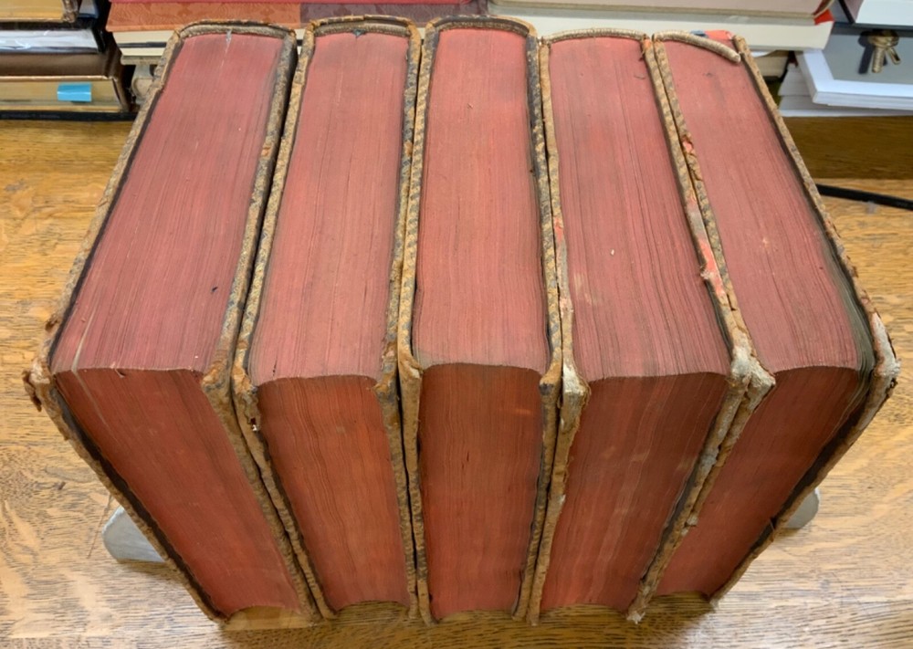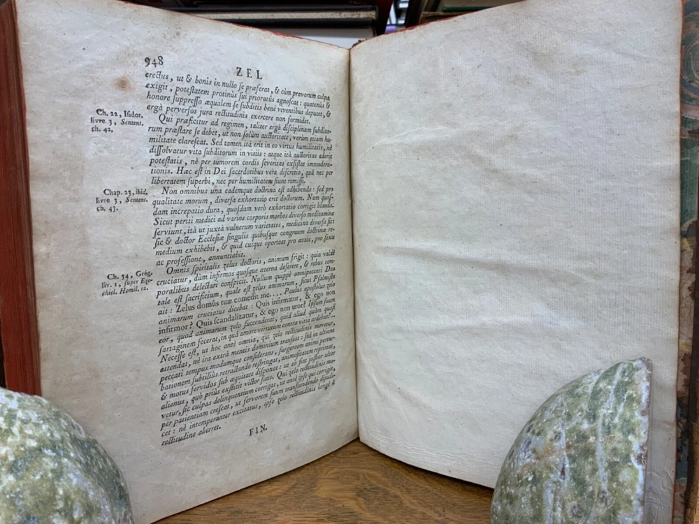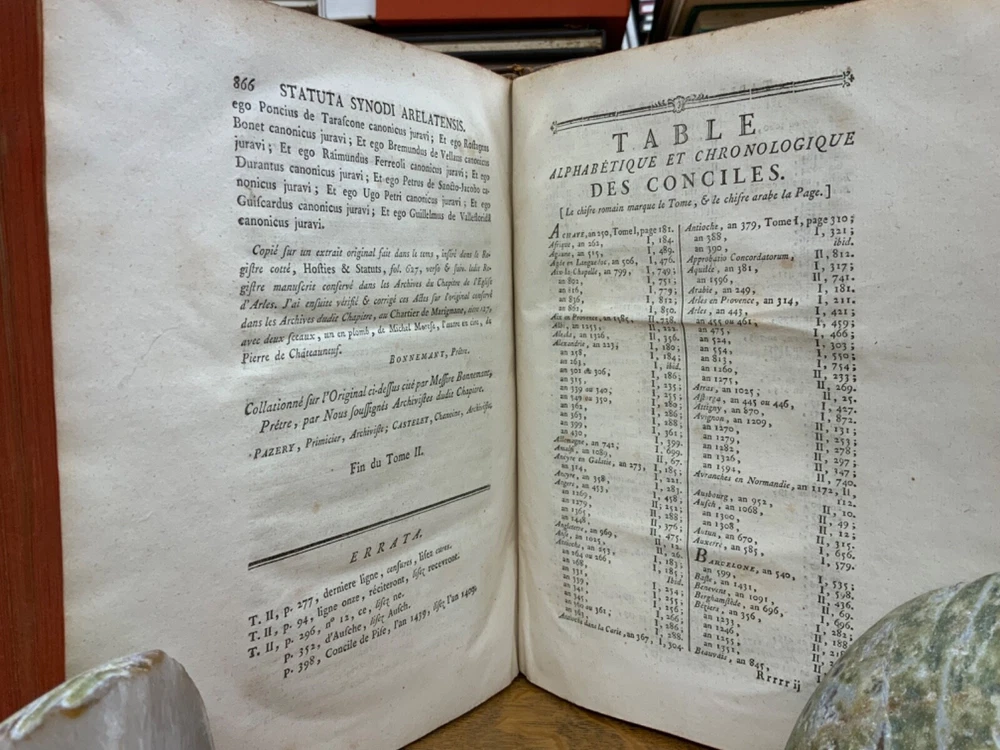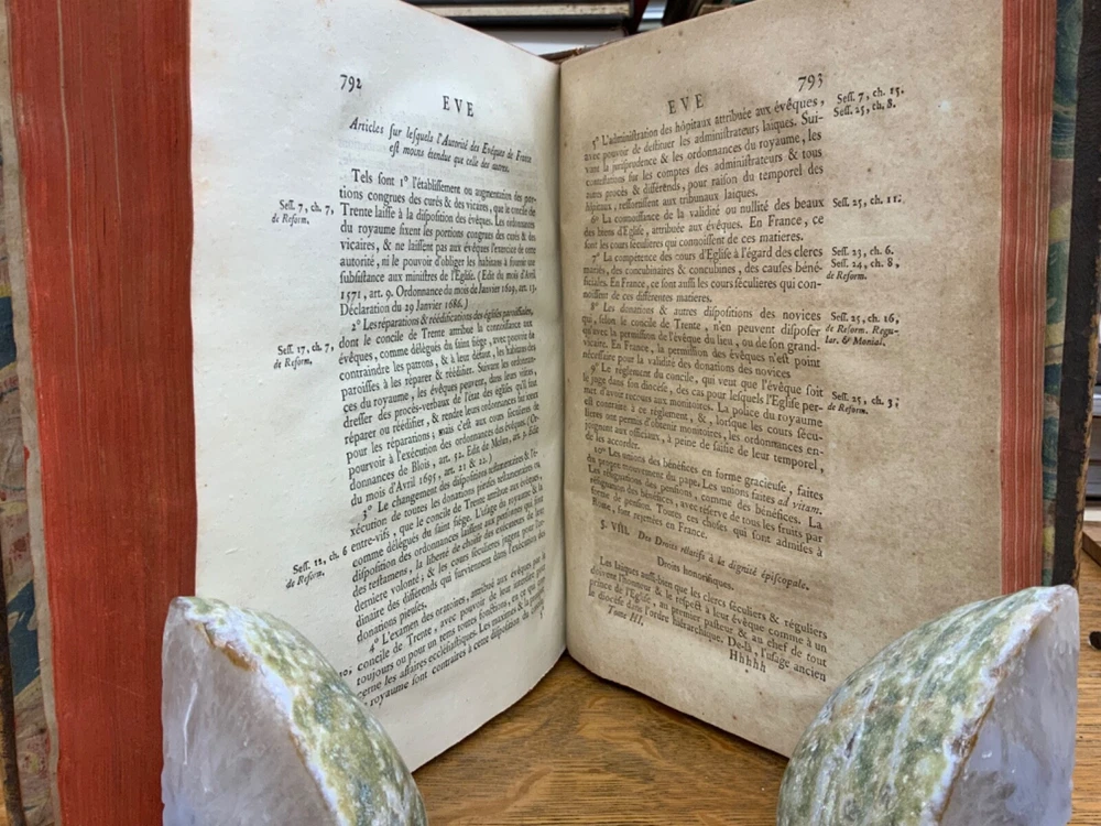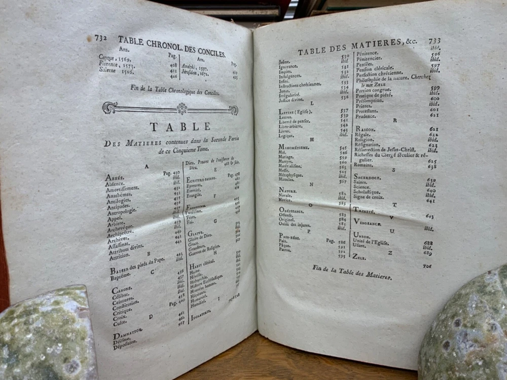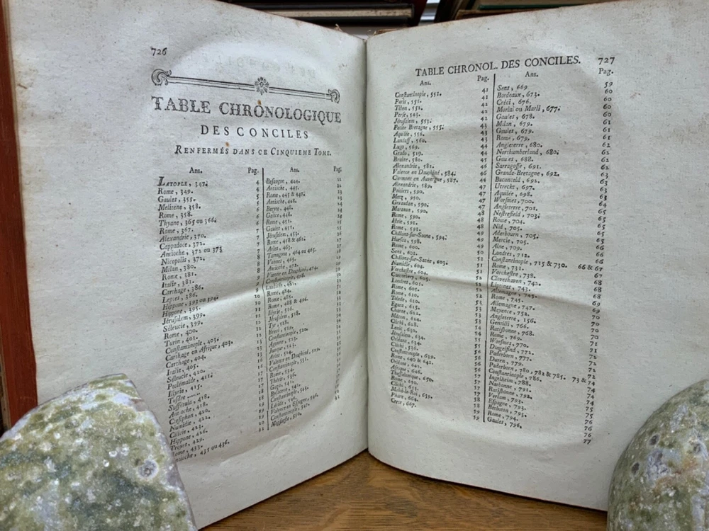 I - IV: Analyse des Conciles, Généraux et Particuliers, Contenant leurs Canons sur le Dogme, la Morale, & la Discipline tant ancienne que moderne, expliqués par des Notes, conférés avec le Droit nouveau, notamment avec le Droit particulier de la France, & précédés d'un Traité des Conciles en général, pour servir d'introduction: Ouvrage utile au Clergé séculier & régulier, ainsi qu'aux Jurisconsultes; Par le R. P. Charles-Louis Richard, Professeur en Théologie, de l'Ordre & du Noviciat général des Freres Prêcheurs, Auteur du Dictionnaire universel des Sciences ecclésiastiques. Tomes I-IV. A Paris, Chez Vincent, Imprimeur-Libraire de Mgr. le Comte de Provence, 1772 - 1773. First Editions, Original Leather Binding, 908 pp; 872 pp; 872 pp; 948 pp, 10 x 8", 4tos. V: Supplément a l'Analyse des Conciles Généraux et Particuliers, Par le R. P. Charles-Louis Richard, Professeur en Théologie, de l'Ordre & du Noviciat général des Freres Prêcheurs. A Paris, Chez Benoît Morin; Laporte, 1777. 735 pp, First Edition, Original Leather Binding, 10 x 8", 4to. A COMPLETE SET. In fair condition. Leather boards scuffed at edges and worn/bumped at leather corners. Leather heads of spines lacking from volumes IV & V, only headbands remain. Tail of Vol. IV is also lacking with only a headband remaining. Remainder of heads and tails are rubbed, but intact. Title and volume labels on spine worn from general shelf-wear, but still legible. Ex-library locator code stickers found on all front boards - top left corners. Leather is generally scuffed and worn, but still presents well. All edges of all volumes painted red. Color marbled end-papers intact and clean in all volumes. Vol. I includes ink marginalia (bibliographic information) on front end-page (verso). Ex-library ink stamps found in all volumes, on either front fly-leaves or title pages. General toning through text-blocks, with some instances of finger-soiling or age-staining. An attractive set, original and classic eighteenth century French binding. Bindings intact. Please see photos. Charles-Louis Richard (1711-1794) was a Catholic theologian and publicist. He was born at Blainville-sur-l'Eau, in Lorraine. His family though of noble descent, was poor, and he received his education in the schools of this native town. At the age of sixteen, he entered the Dominican Order and, after his religious profession, was sent to study theology of Paris, where he received a Doctorate at the Sorbonne. He next applied himself to preaching and the defense of religion against d'Alembert, Voltaire, and their confederates. The outbreak of the French Revolution freed him to seek refuge in Mons, in Belgium. During the second invasion of that country by the French, in 1794, old age prevented him from fleeing, and, though he eluded his pressures for some time, he was at last detected, tried by court martial, and shot. This is a complete work, attractively bound. First Editions. FORN-MSB-0324-0698(BOTTOM)-HK1340