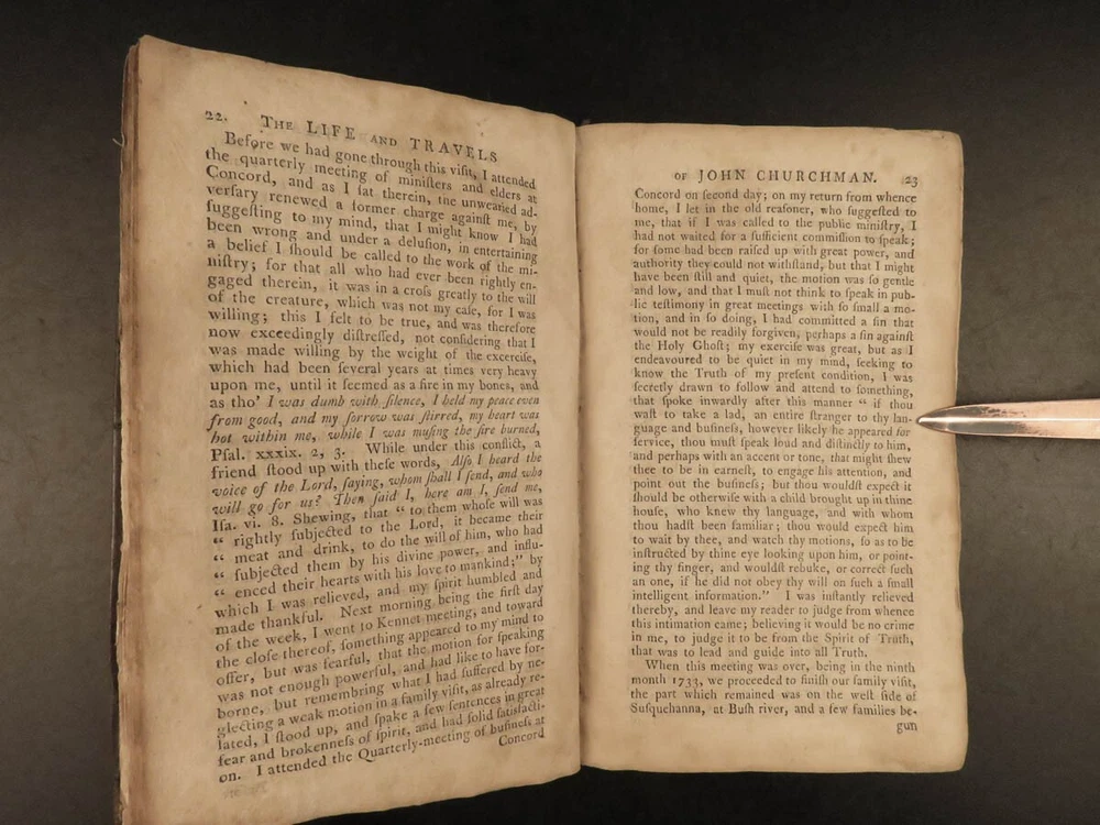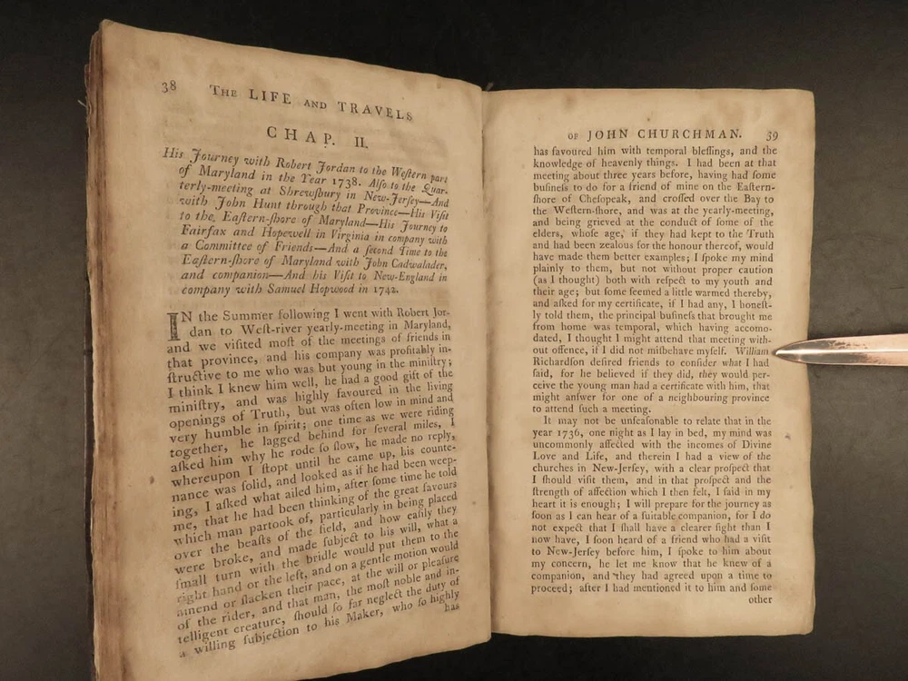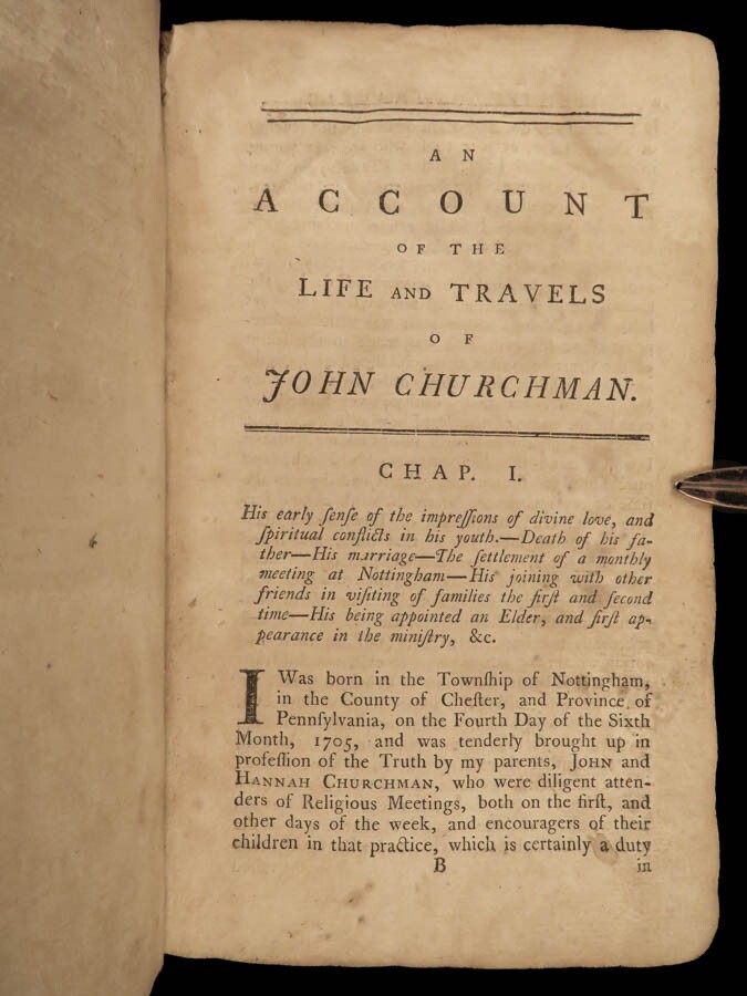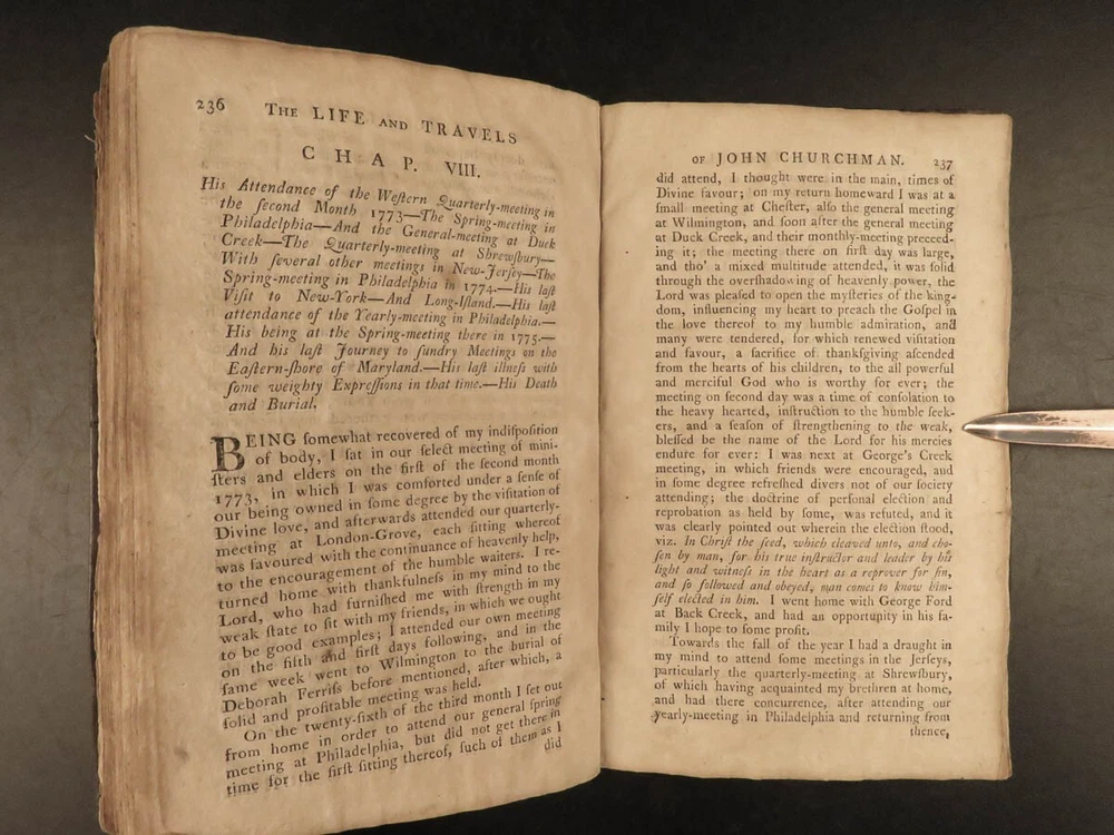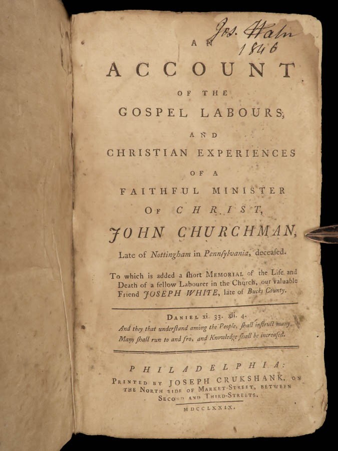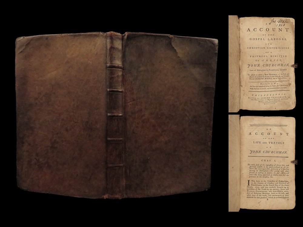 1779 EARLY Americana INDIANS 1 ed John Churchman Quaker Revolutionary War John Churchman was an 18 th -century Quaker minister of whom every little is known today. However, while his published writings were few, one important known work was “ An Account of the Gospel Labours ”. This book was simply an autobiography of his life and ministry in and around Nottingham, Pennsylvania. The events of his ministry, however, are not the primary draw of this work – this work is a reliable, first-hand account of pre-Revolutionary America and includes his and other Quakers interactions with Native American Indians. Item number: #24435 Price: $499 CHURCHMAN, John An account of the Gospel labours, and Christian experiences of a faithful minister of Christ, John Churchman Philadelphia: Printed by Joseph Crukshank, 1779. 1 st edition Details : · Collation: Complete with all pages o vii, [1], 256 · Provenance: Handwritten – Jos. Hahn, 1846 · Language: English · Binding: Leather; tight and secure · Size: ~7.75in X 5in (19.5cm x 12.5cm) Our Guarantee: Very Fast. Very Safe. Free Shipping Worldwide. Customer satisfaction is our priority! Notify us with 7 days of receiving, and we will offer a full refund without reservation! 24435