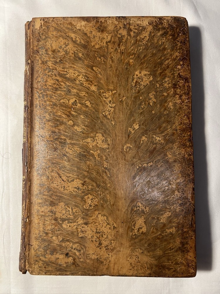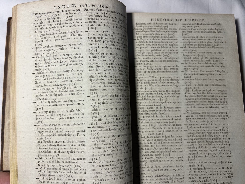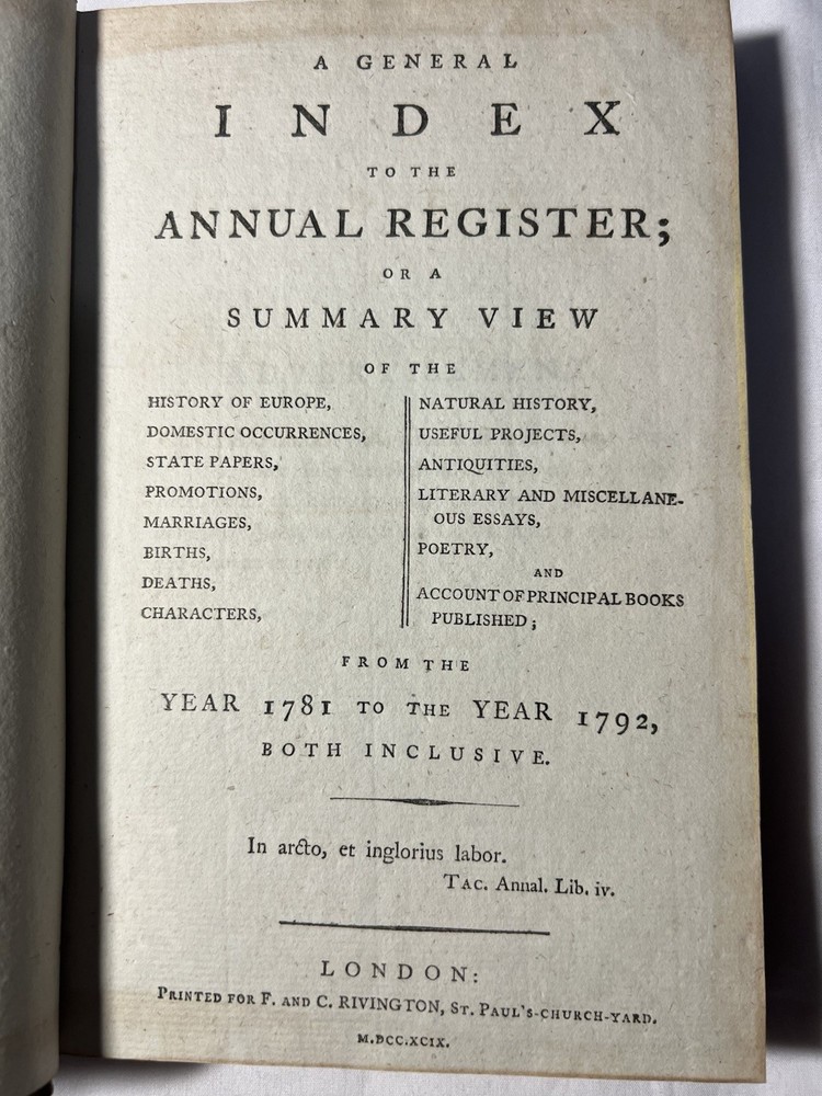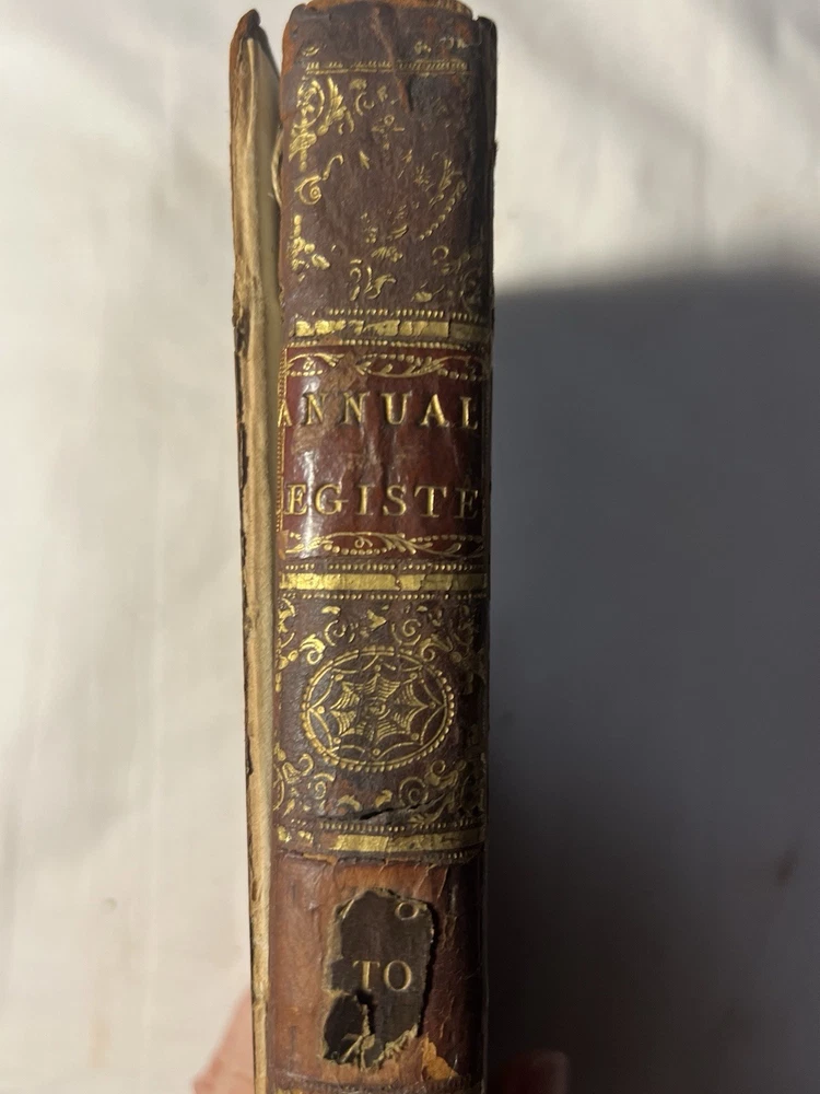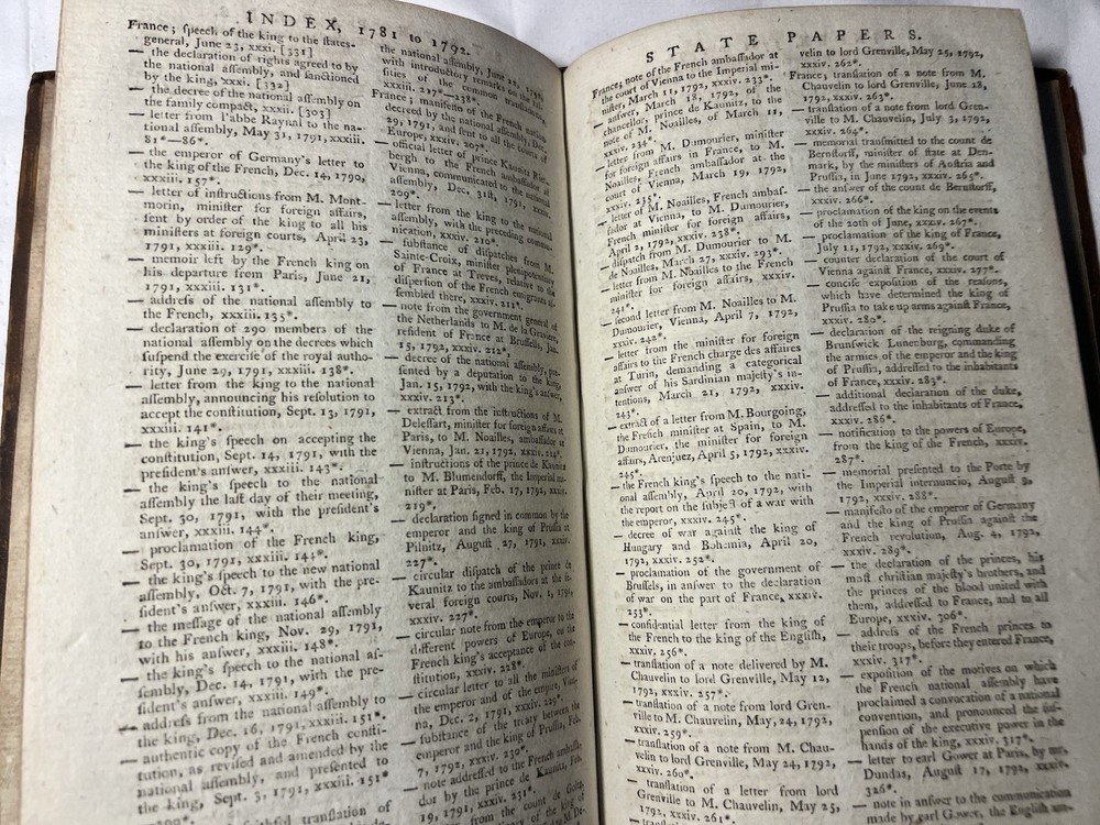 Title: A General Index to the Annual Register; or a Summary View of the History of Europe, Domestic Occurrences, State Papers, Promotions, Marriages, Births, Deaths, Characters, Natural History, Useful Projects, Antiquities, Literary and Miscellaneous Essays, Poetry, and Account of Principal Books Published; from the Year 1781 to the Year 1792, Both Inclusive. Publication Details: Printed for F. and C. Rivington, St. Paul’s Church-Yard, London, 1799. Physical Description: • Full tree calf leather binding, characteristic of the late 18th century. • Excellent preservation of the tree calf patterning on the boards. • Some minor wear to the joints and corners (as visible in your first photo). • Interior clean, with only light age toning. • Complete and securely bound except back cover has separated. Historical Importance: This index covers a particularly significant period: • American Revolutionary aftermath and early U.S. diplomatic activity (notably, you mentioned it lists John Adams’s ambassadorial appointment — which would have been as the U.S. Minister to the Court of St. James’s [Britain] in the 1780s). • French Revolution events are heavily indexed — speeches of Louis XVI, the National Assembly, etc. • Mentions of General Washington (George Washington) and Benedict Arnold (likely referencing espionage or diplomatic reports). • State papers and political occurrences not just from Britain but across Europe, covering the revolutionary fervor, international diplomacy, and shifting powers. The Annual Register itself was a periodical founded by Edmund Burke (though not always written by him), designed to compile yearly accounts of major political, social, and scientific events. This Index volume was published to provide researchers and readers with an accessible way to navigate twelve years of these detailed reports. Condition Summary: Excellent for age. Boards show expected rubbing and light wear, especially at joints and corners. The back cover has separated from the binding. Interior clean with minimal foxing. Binding tight.