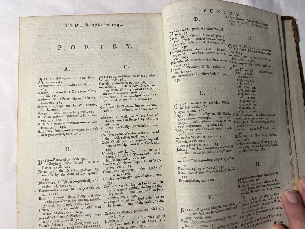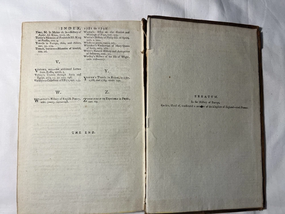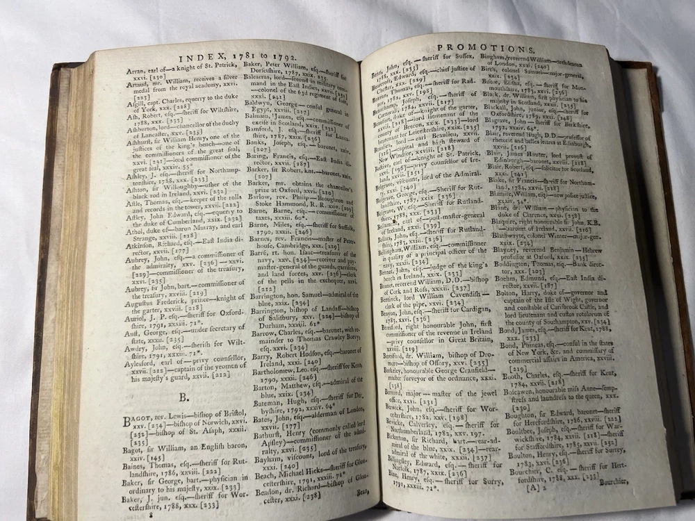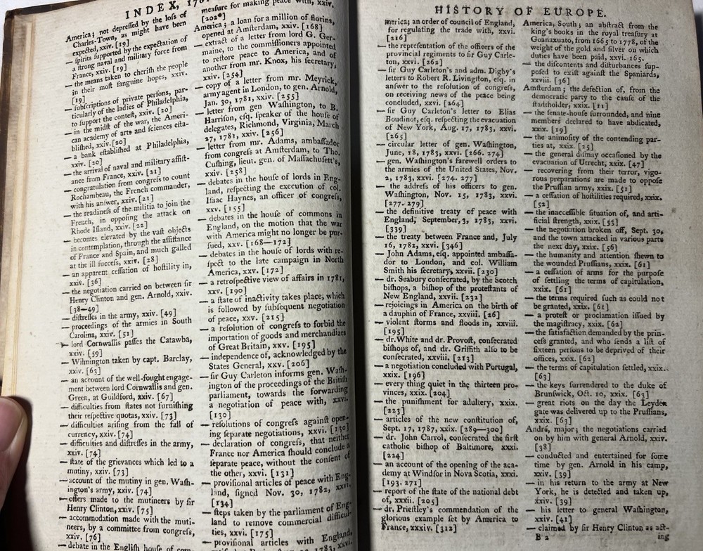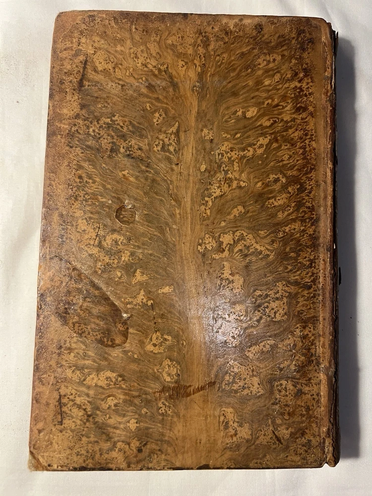 Title: A General Index to the Annual Register; or a Summary View of the History of Europe, Domestic Occurrences, State Papers, Promotions, Marriages, Births, Deaths, Characters, Natural History, Useful Projects, Antiquities, Literary and Miscellaneous Essays, Poetry, and Account of Principal Books Published; from the Year 1781 to the Year 1792, Both Inclusive. Publication Details: Printed for F. and C. Rivington, St. Paul’s Church-Yard, London, 1799. Physical Description: • Full tree calf leather binding, characteristic of the late 18th century. • Excellent preservation of the tree calf patterning on the boards. • Some minor wear to the joints and corners (as visible in your first photo). • Interior clean, with only light age toning. • Complete and securely bound except back cover has separated. Historical Importance: This index covers a particularly significant period: • American Revolutionary aftermath and early U.S. diplomatic activity (notably, you mentioned it lists John Adams’s ambassadorial appointment — which would have been as the U.S. Minister to the Court of St. James’s [Britain] in the 1780s). • French Revolution events are heavily indexed — speeches of Louis XVI, the National Assembly, etc. • Mentions of General Washington (George Washington) and Benedict Arnold (likely referencing espionage or diplomatic reports). • State papers and political occurrences not just from Britain but across Europe, covering the revolutionary fervor, international diplomacy, and shifting powers. The Annual Register itself was a periodical founded by Edmund Burke (though not always written by him), designed to compile yearly accounts of major political, social, and scientific events. This Index volume was published to provide researchers and readers with an accessible way to navigate twelve years of these detailed reports. Condition Summary: Excellent for age. Boards show expected rubbing and light wear, especially at joints and corners. The back cover has separated from the binding. Interior clean with minimal foxing. Binding tight.