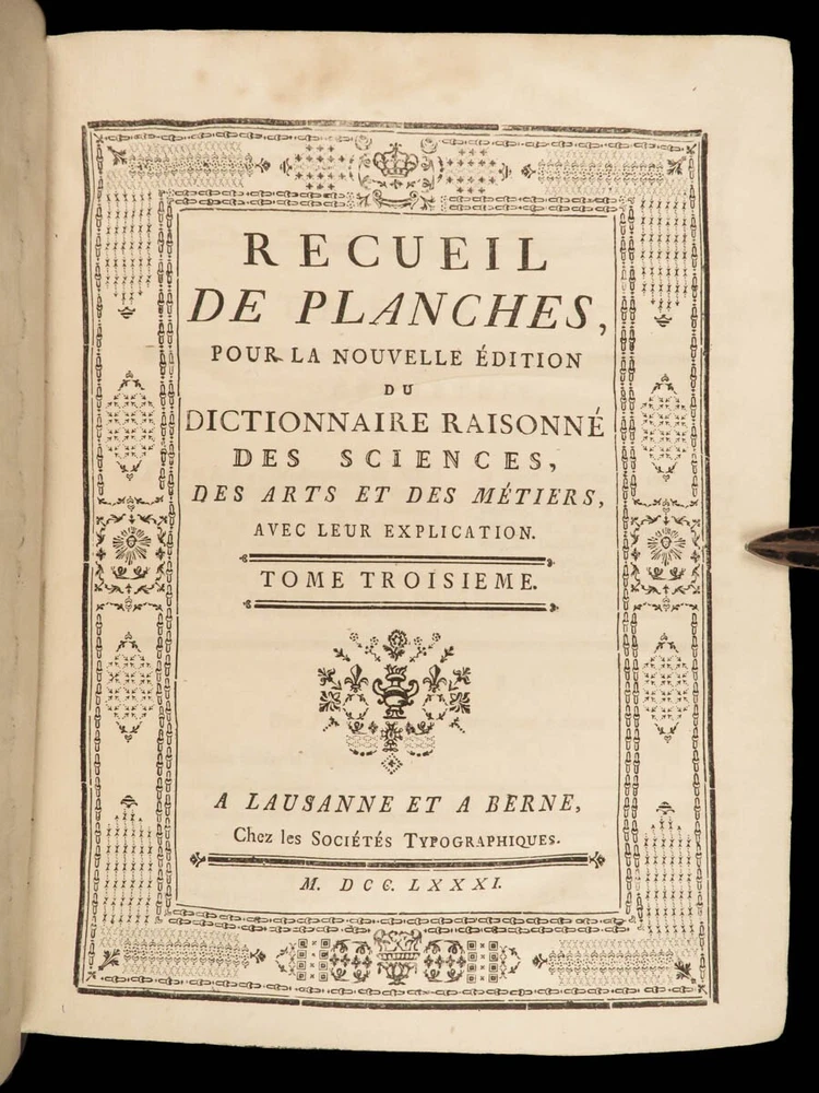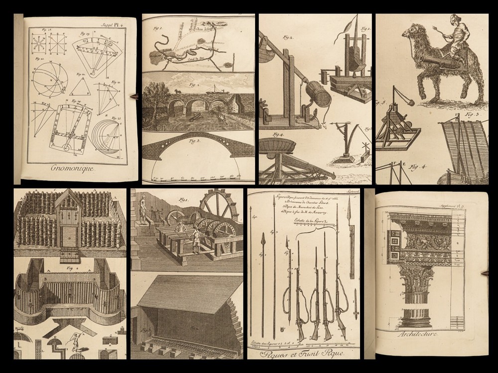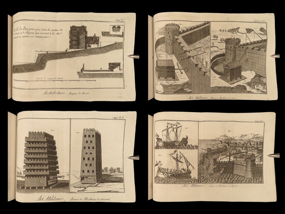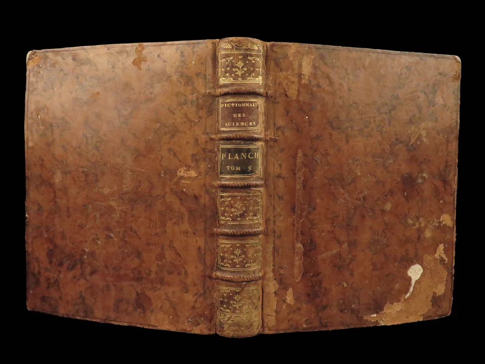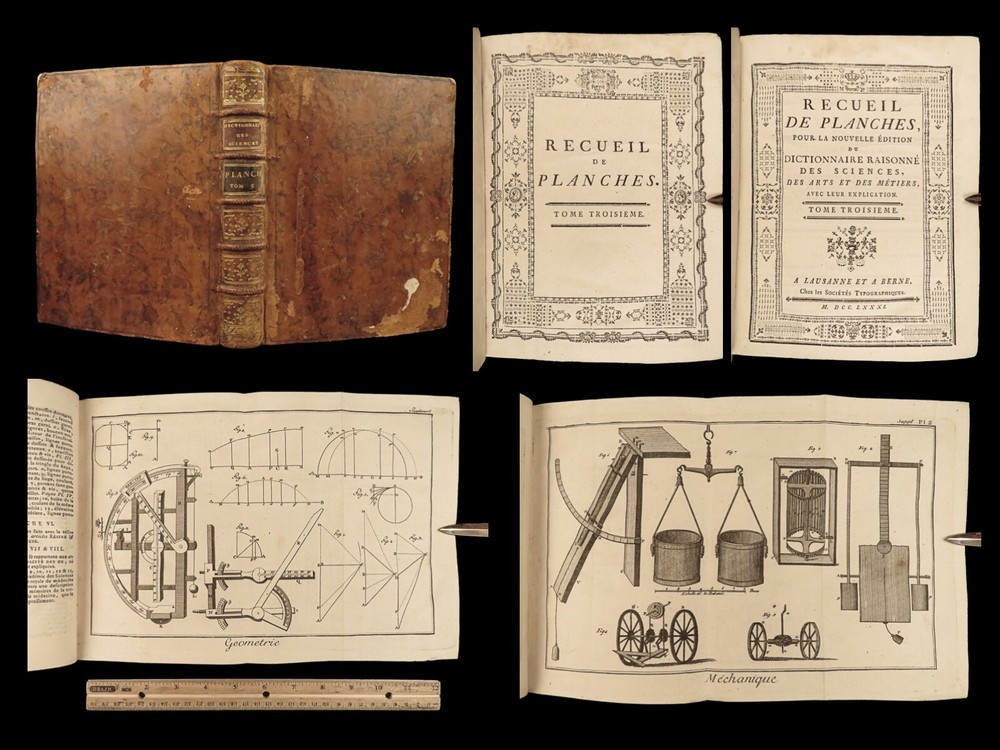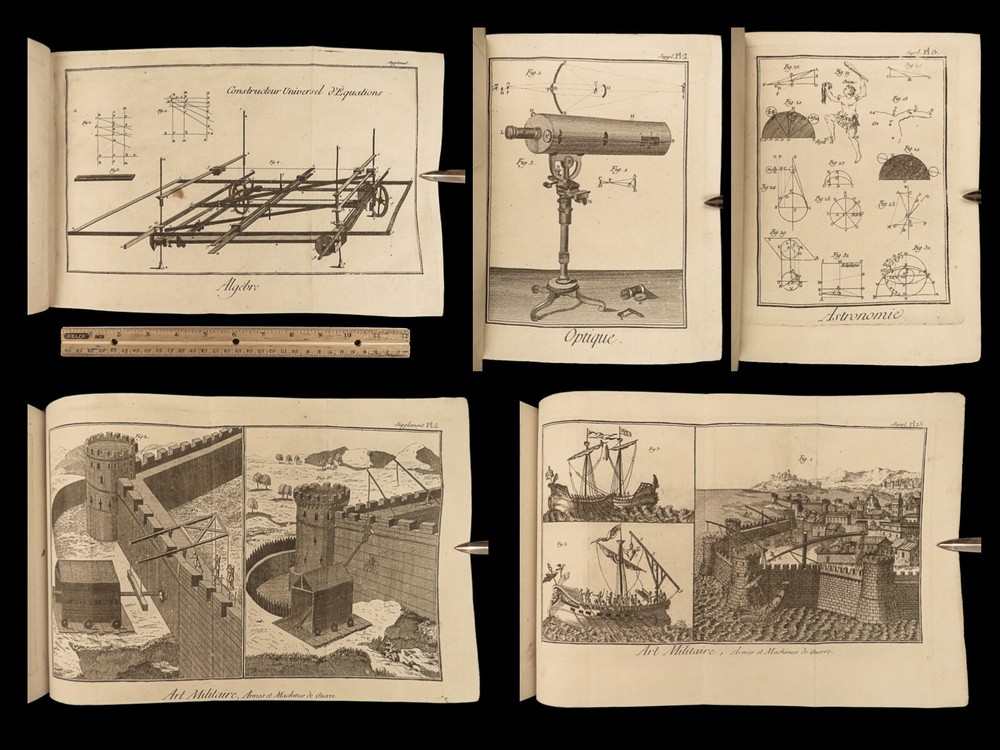 1781 Diderot Encyclopedia Illustrated Mechanics ART of WAR Weapons Architecture The Enlightenment’s most-important general encyclopedia! Through the mid-18 th -century, large collections of knowledge were relegated to specific areas of study like law, medicine, or religion. However, Denis Diderot’s ‘ Encyclopedie’ changed the public’s knowledge base as well as setting a standard for future generations of acquiring knowledge on many different subjects. This was the first encyclopedia to include contributions from many different named writers. It also was the first encyclopedia to describe work-related topics like agriculture, engineering, cooking, and trade. This rare edition is exclusively engravings of the mechanical arts including more than 100 full-page and folding engravings. Each section of the huge engravings is paired with a table describing what it in each illustration. Images in this tome include: · Astronomy · Gnomonics · Music · Geometry · Art of military, weapons · architecture Item number: #23674 Price: $950 DIDEROT, Denis Recueil De Planches, pour la nouvelle edition du dictionnaire raisonne des sciences, …tome III Paris : Briasson; David; Le Breton; Durand, 1781. Details : · Collation: Complete o 56 § Pagination errors expected o 107 exquisite full- and double-page plates! · Language: French · Binding: Leather; secure · Size : ~8.25in X 6.5in (21cm x 16.5cm) Our Guarantee: Very Fast. Very Safe. Free Shipping Worldwide. Customer satisfaction is our priority! Notify us with 7 days of receiving, and we will offer a full refund without reservation! 23674